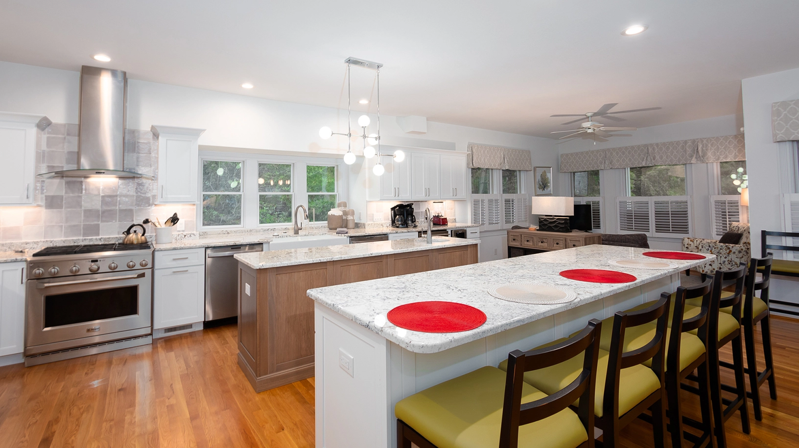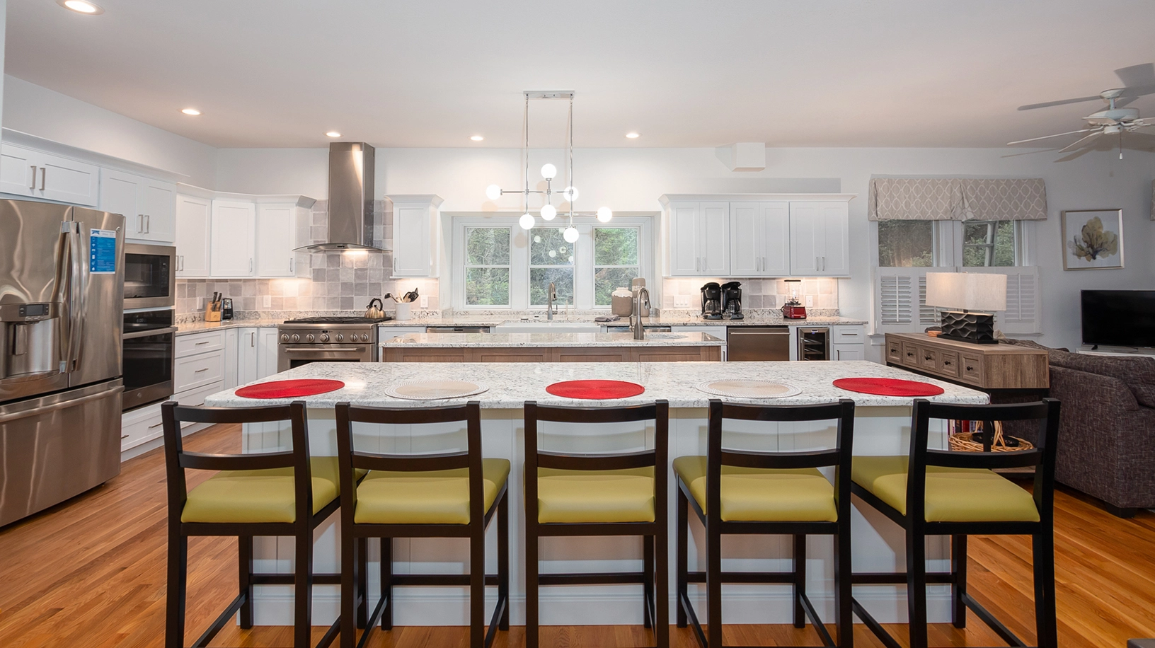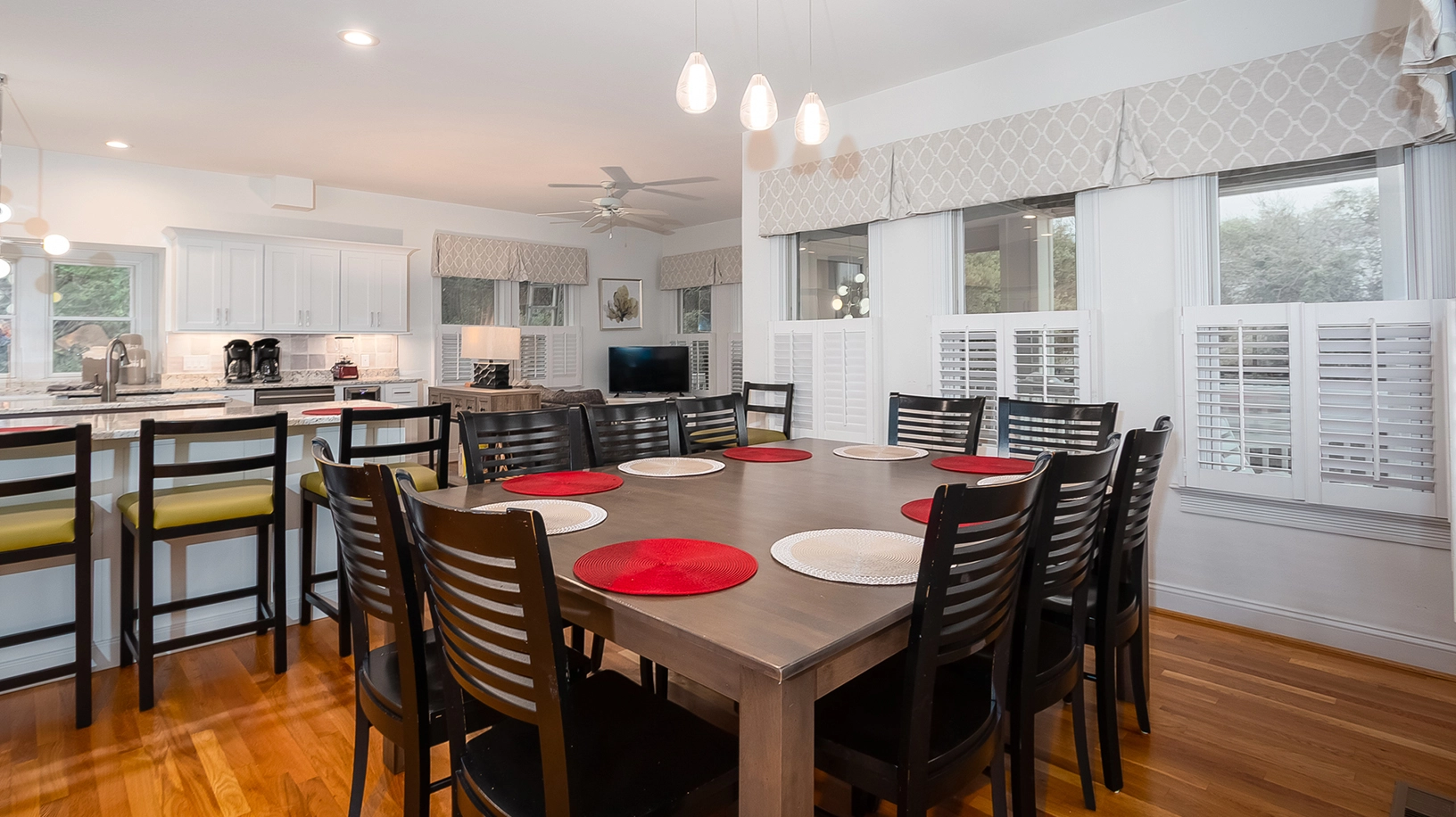 "The kitchen is great! Like to 2 islands for food prepping. The new hot tub was nice. Plenty of seating. The back yard and pool is nice too"