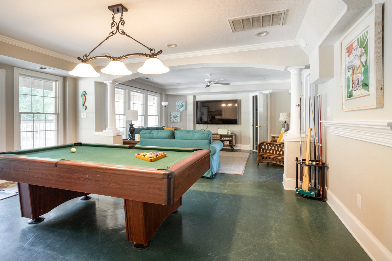 Rec room with pool table and kitchenette with refrigerator; laundry.