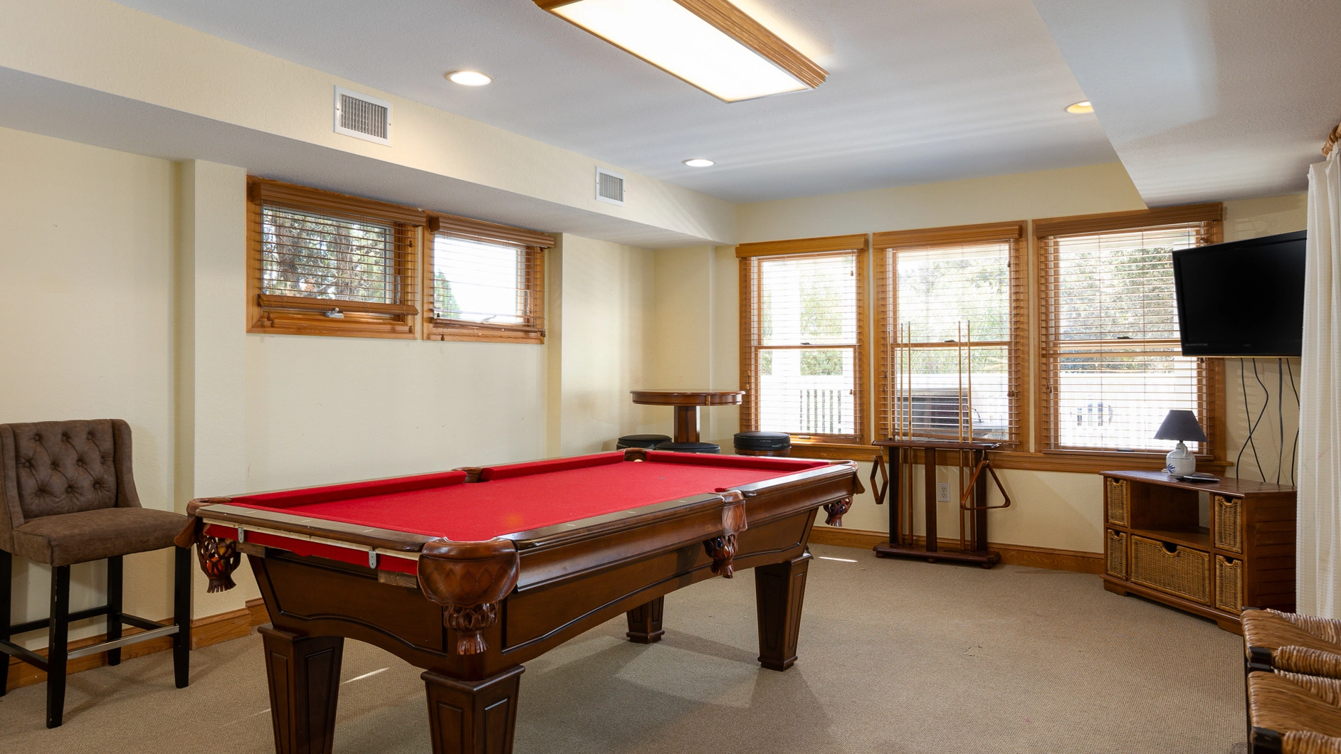 Rec room with pool table, wet bar, refrigerator, microwave and dishwasher; patio with hot tub, gas grill, and gated pool.