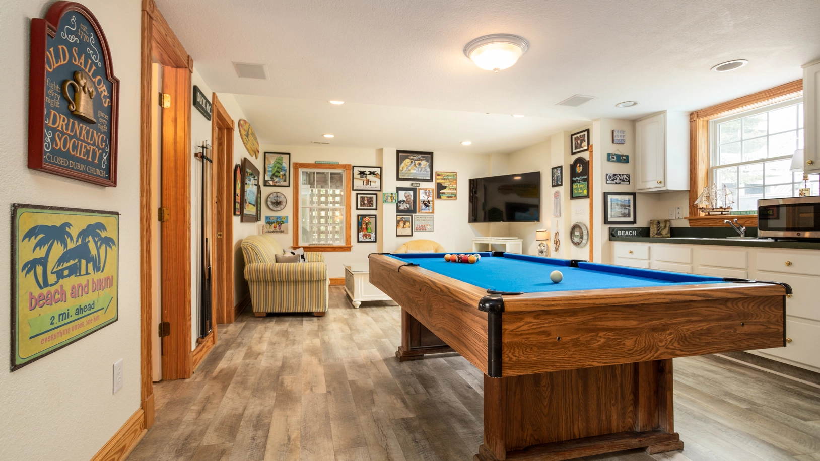 Rec room with pool table, Mrs. Pac-Man Galaga Arcade 1 game with 12 old school video games and kitchenette; laundry.