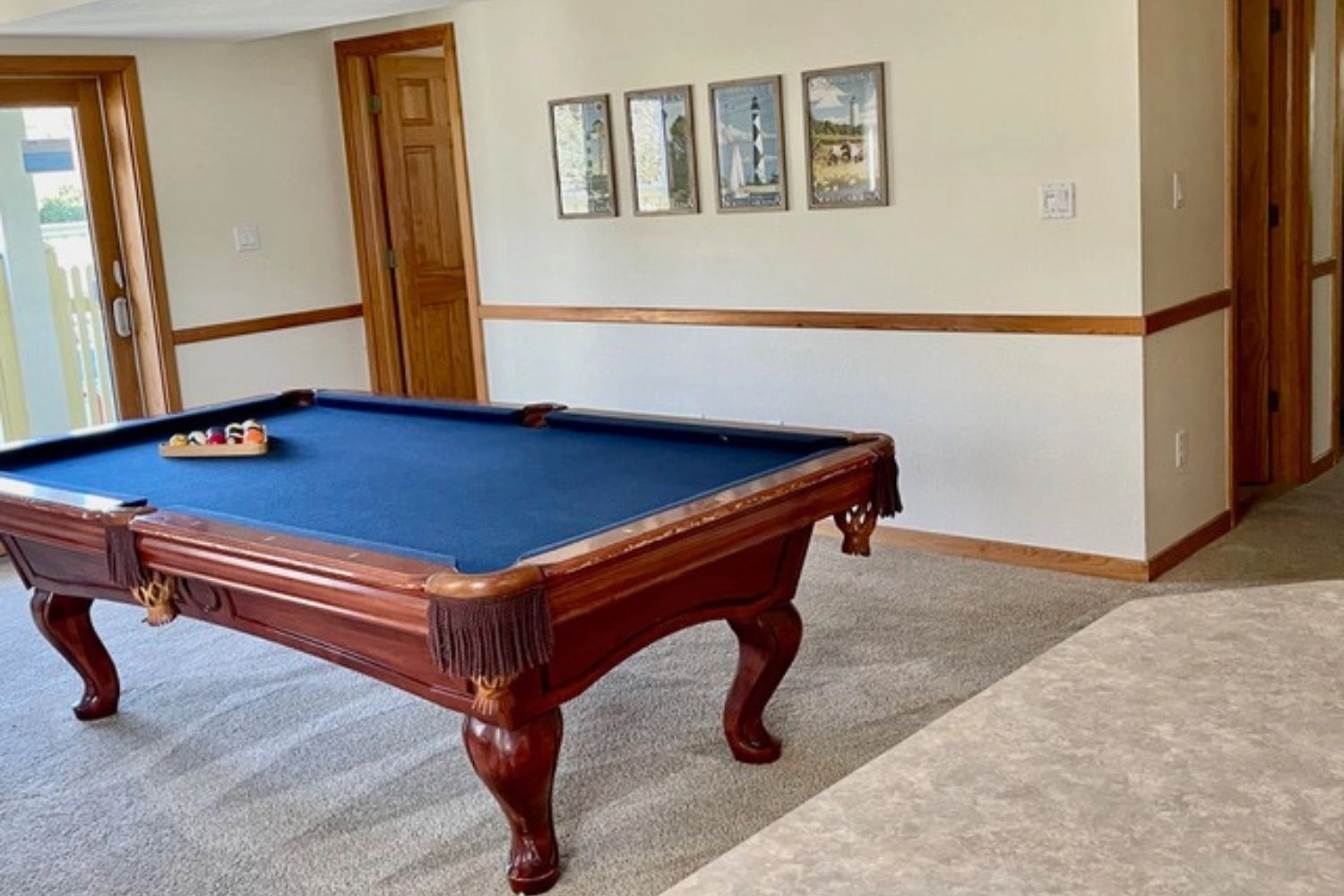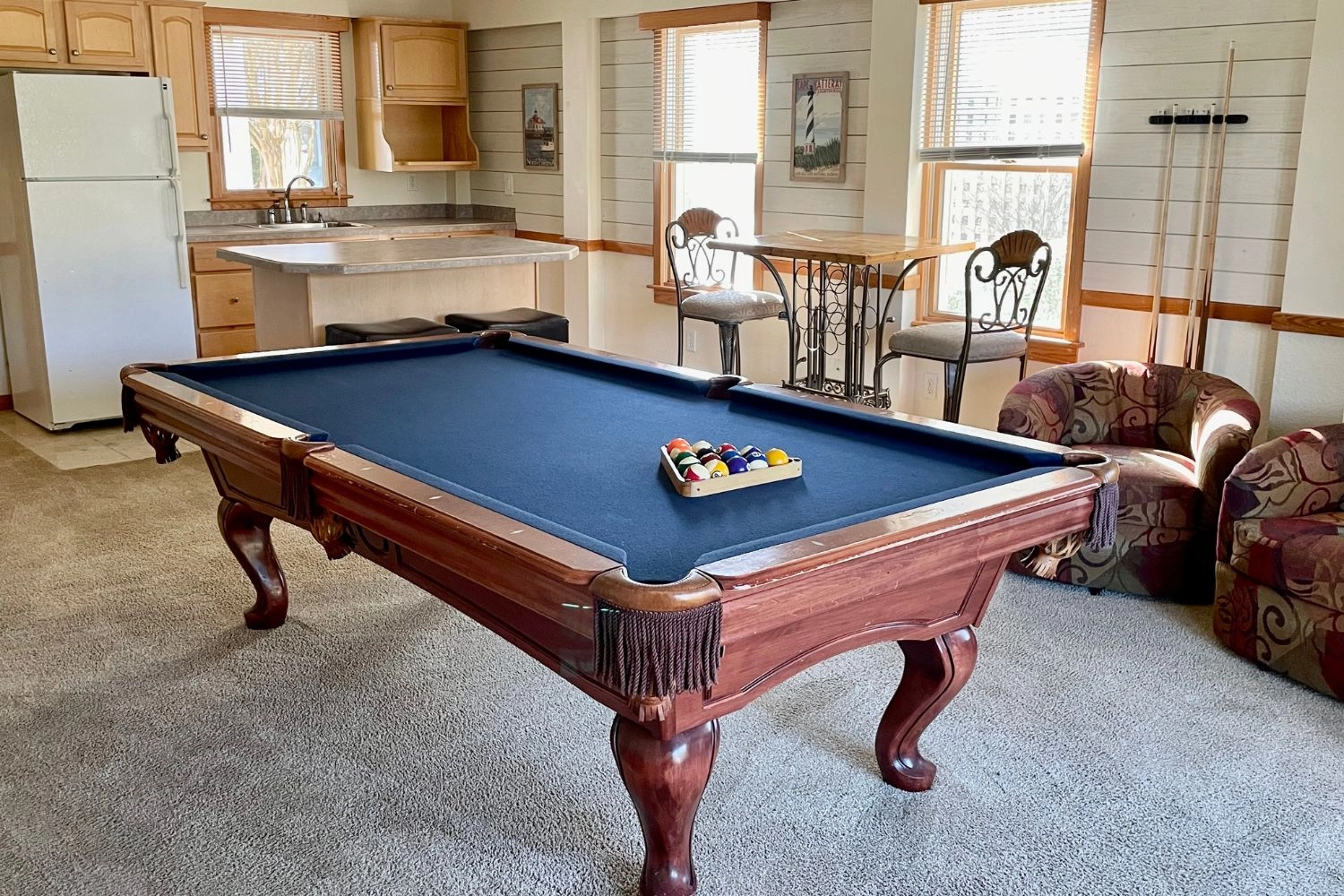 Rec room with pool table and kitchenette with island with bar seating; patio with private pool and hot tub.