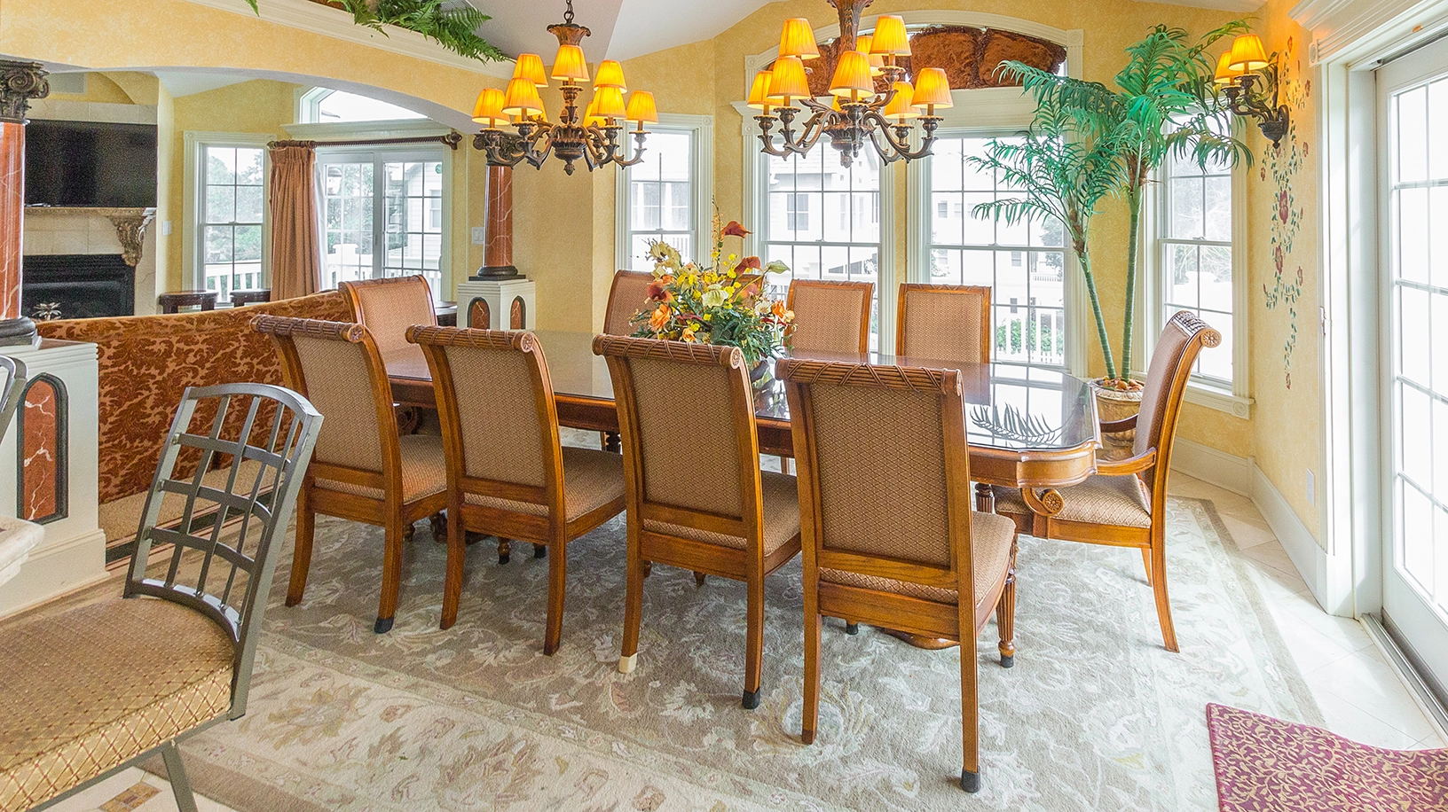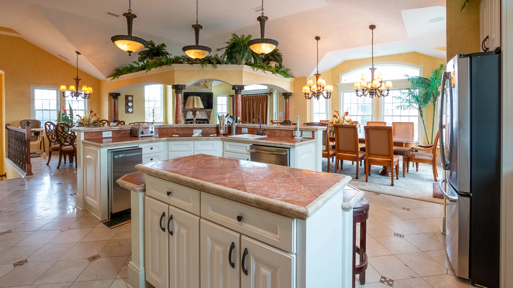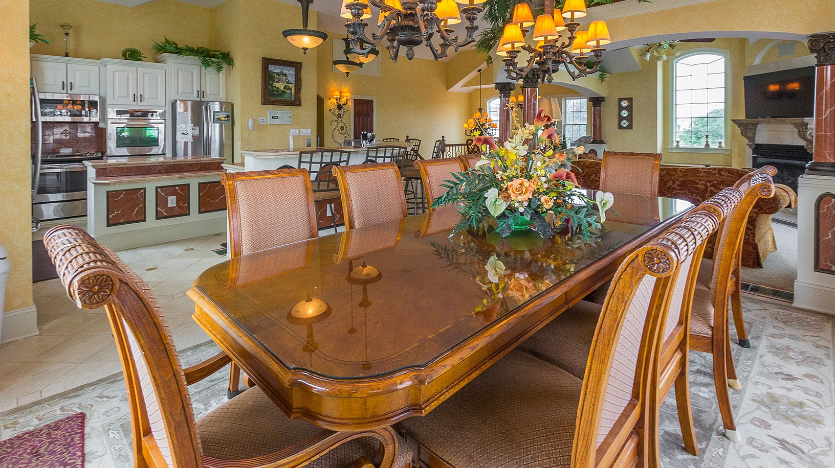 Great room with gas fireplace; kitchen with three ovens, two refrigerators and dishwashers; dining area.