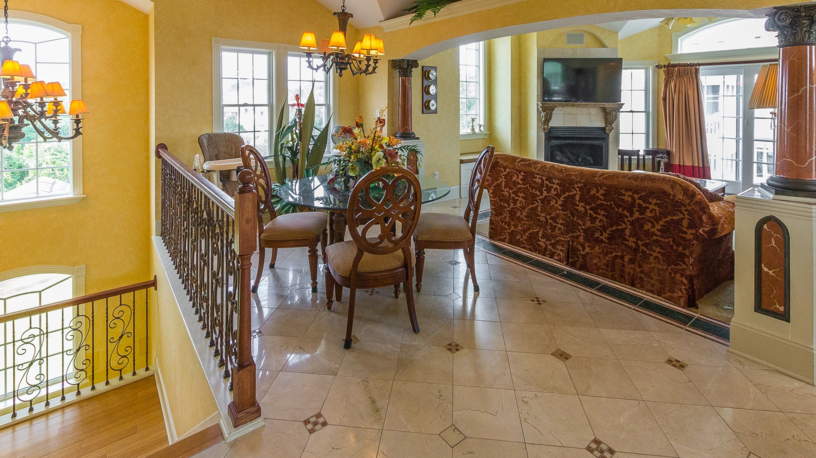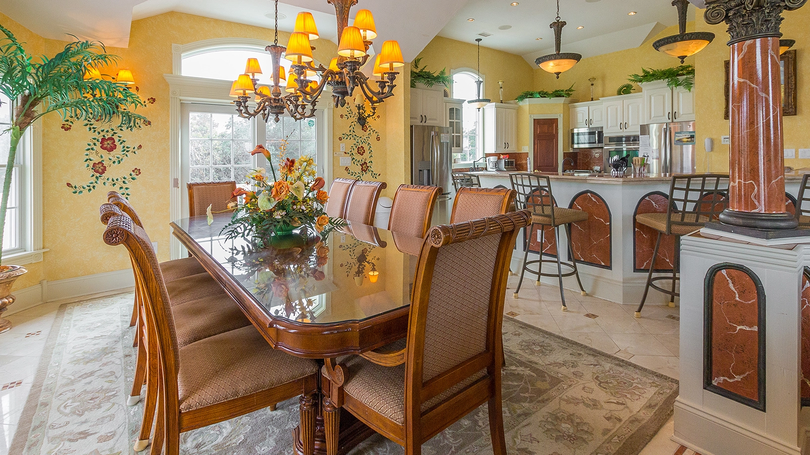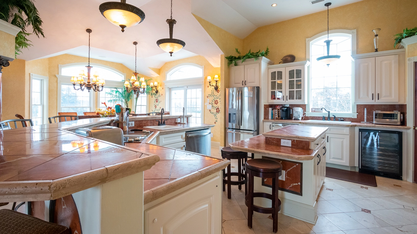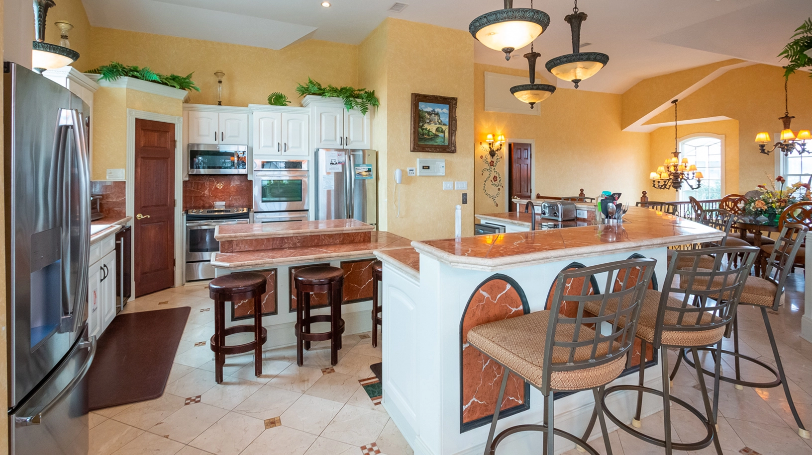Great room with gas fireplace; kitchen with three ovens, two refrigerators and dishwashers; dining area.