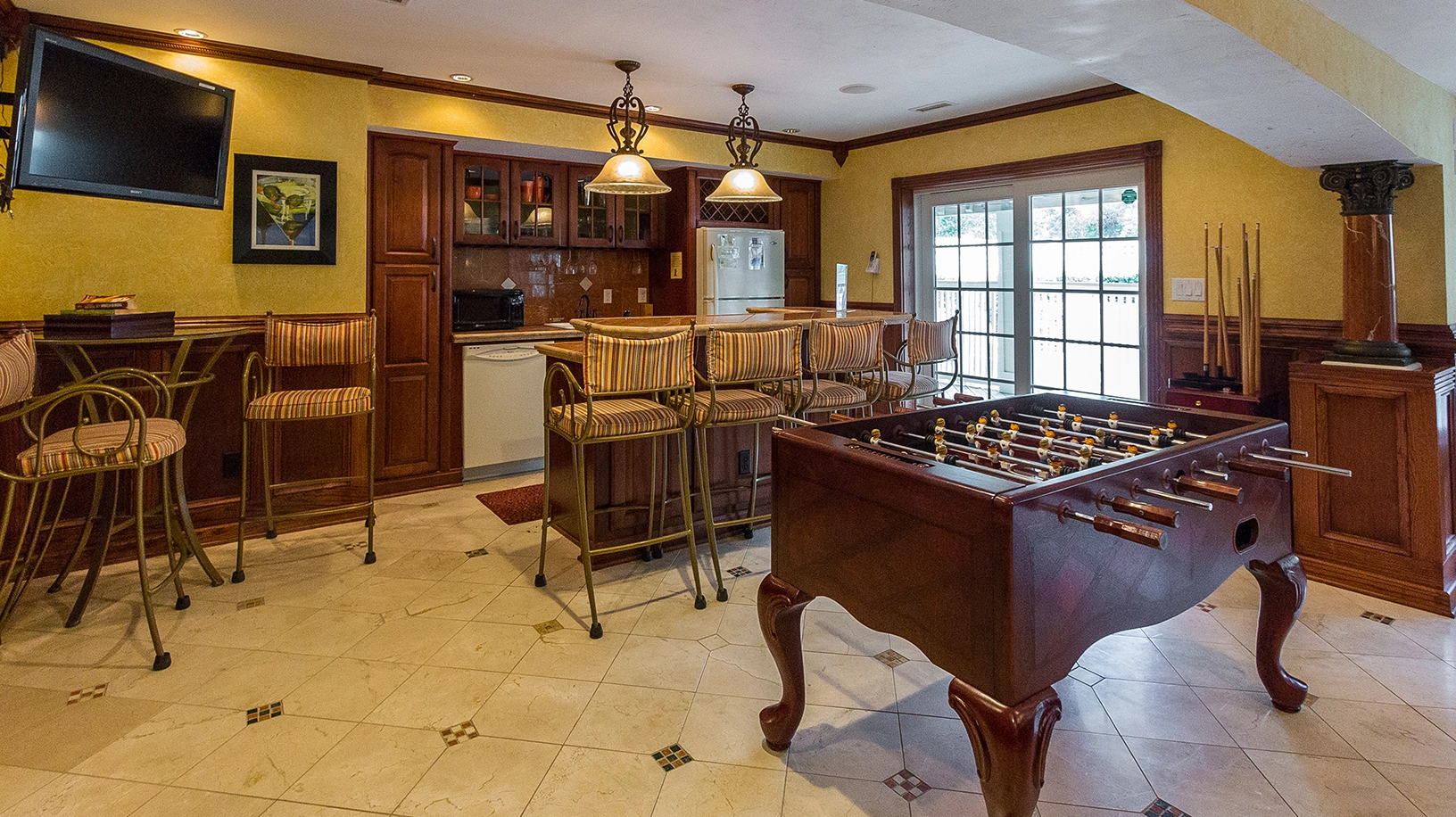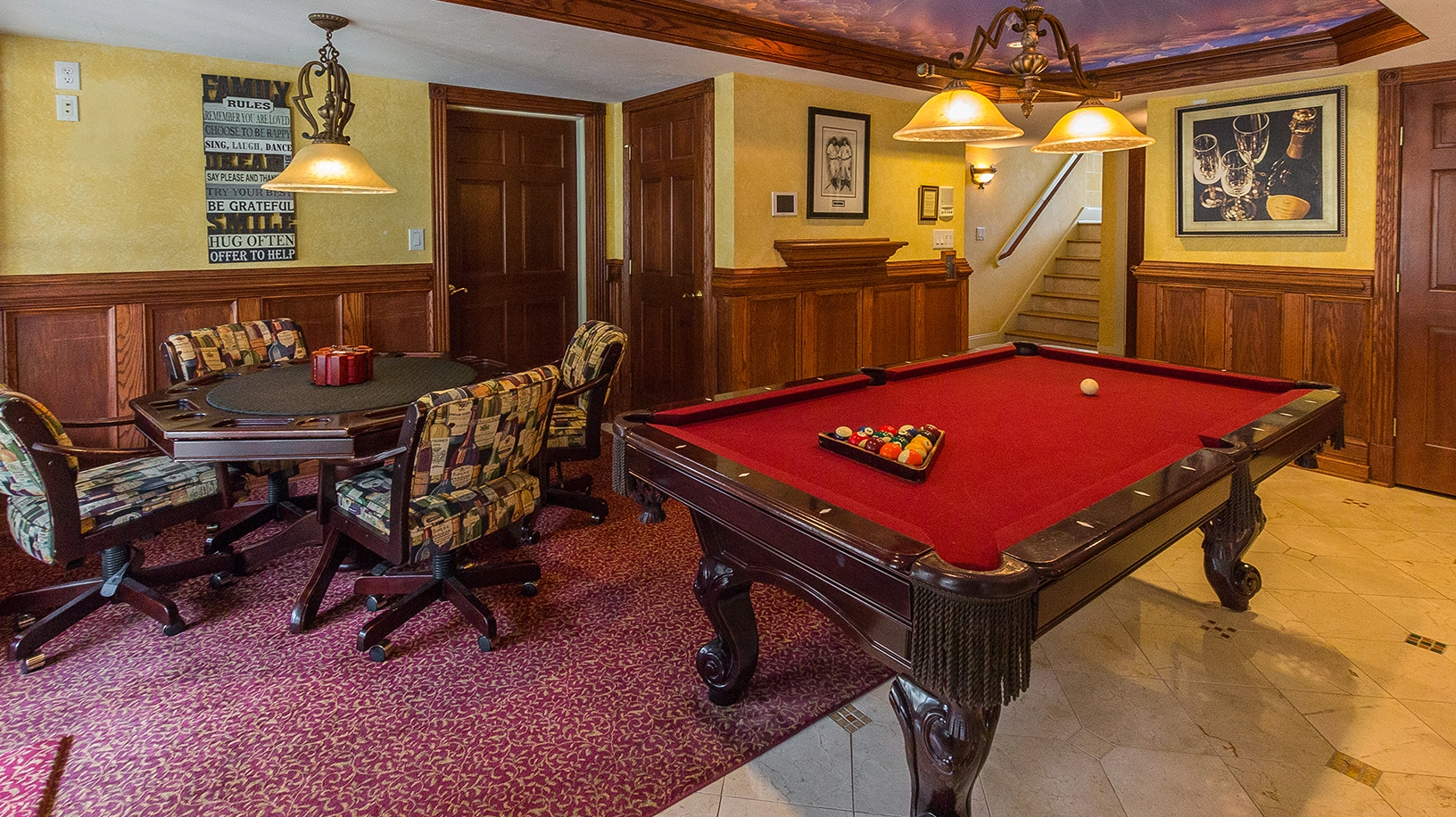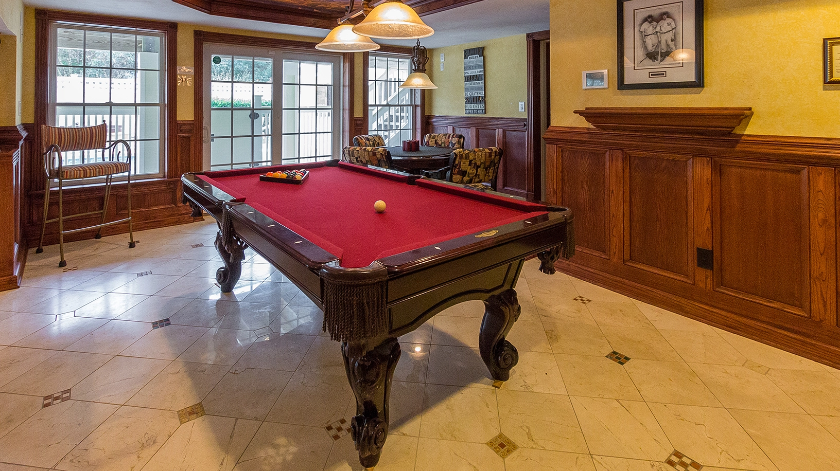 Rec room with pool table, foosball, game table and sports bar; theater room; laundry.