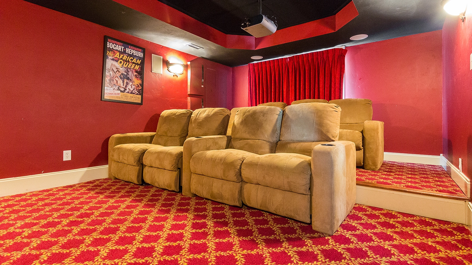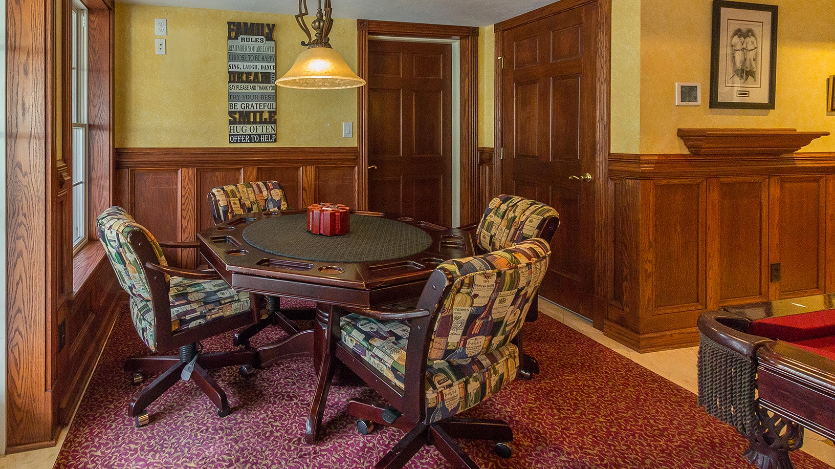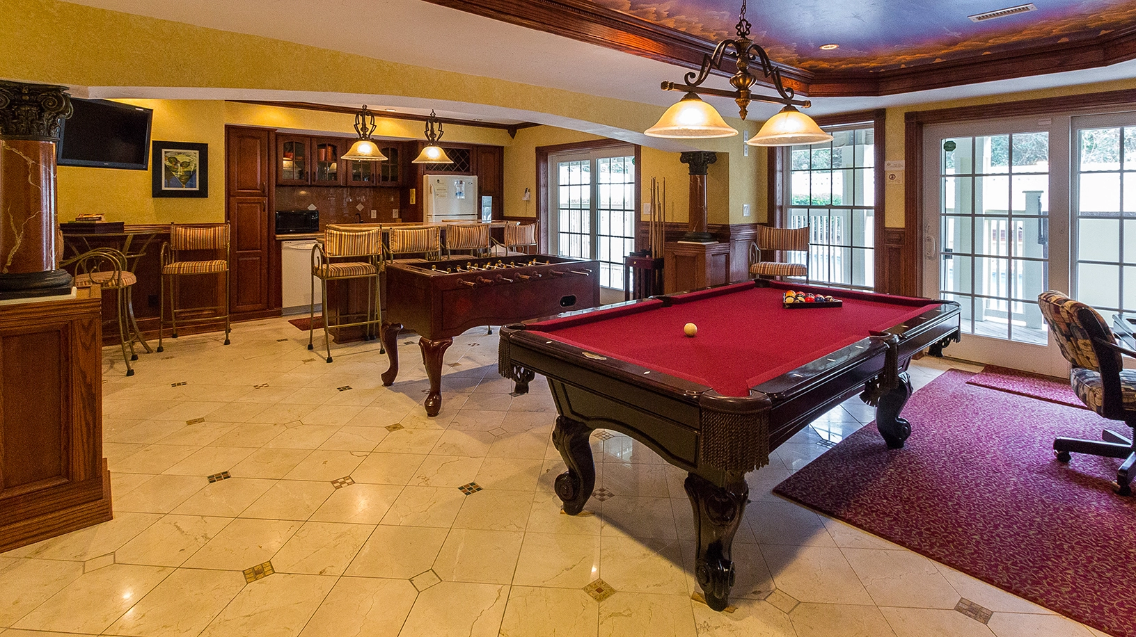 Rec room with pool table, foosball, game table and sports bar; theater room; laundry.