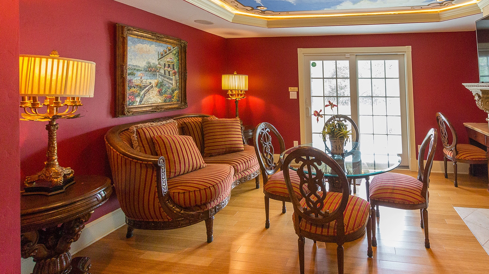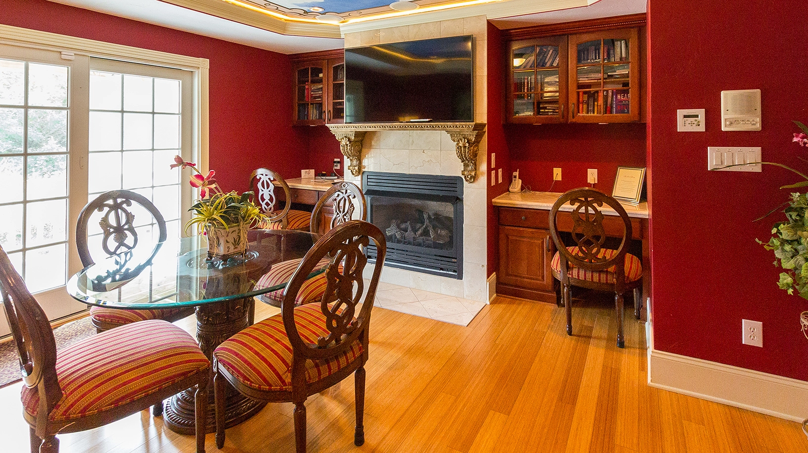 Den with gas fireplace.