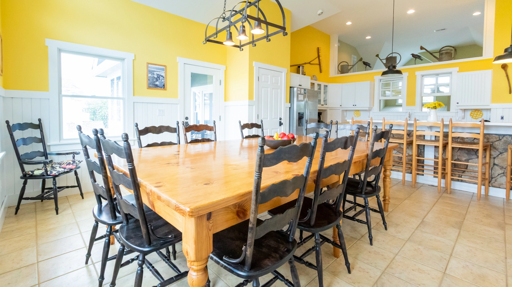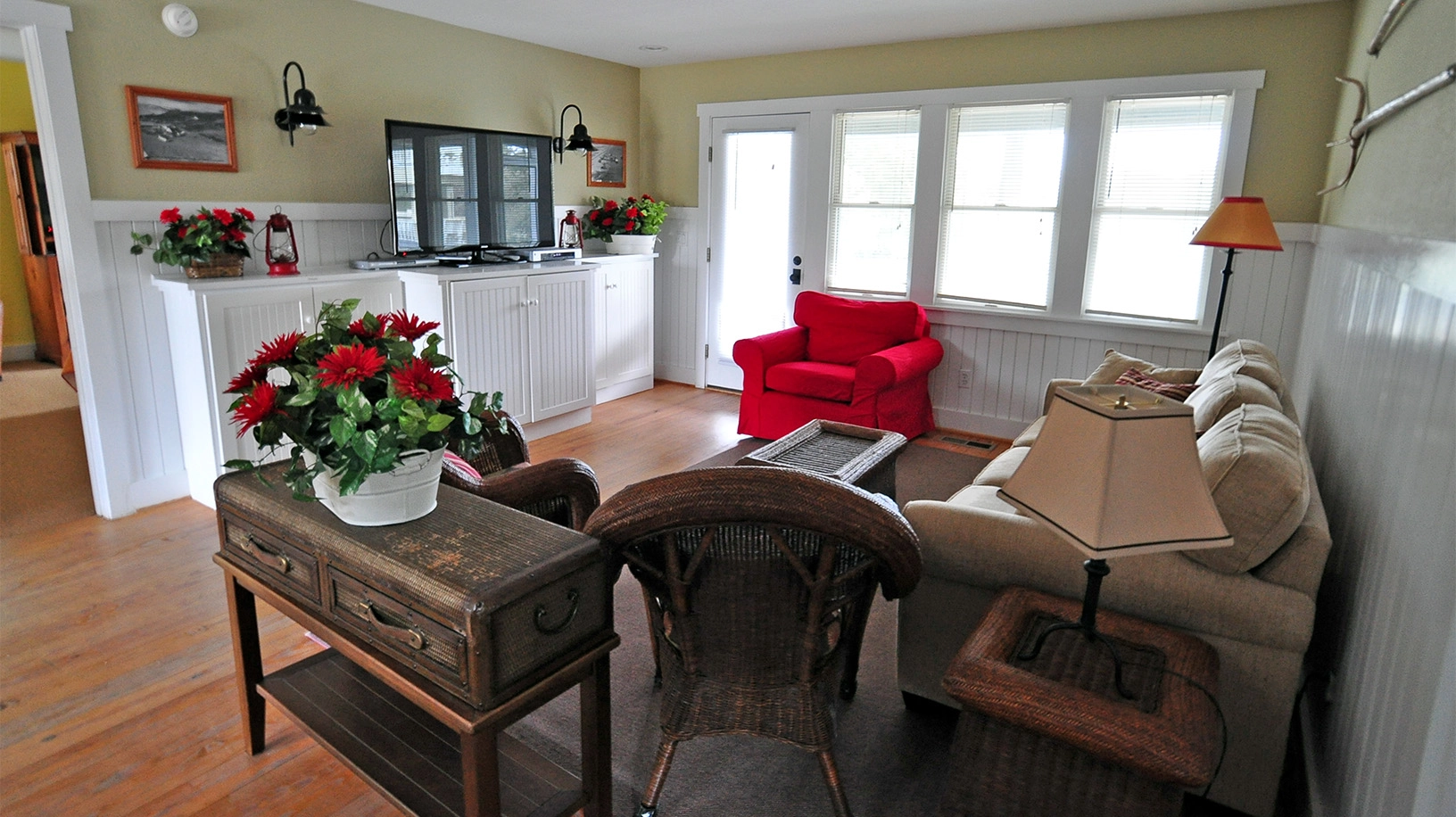 Great room with gas fireplace; kitchen; dining area; screened porch.