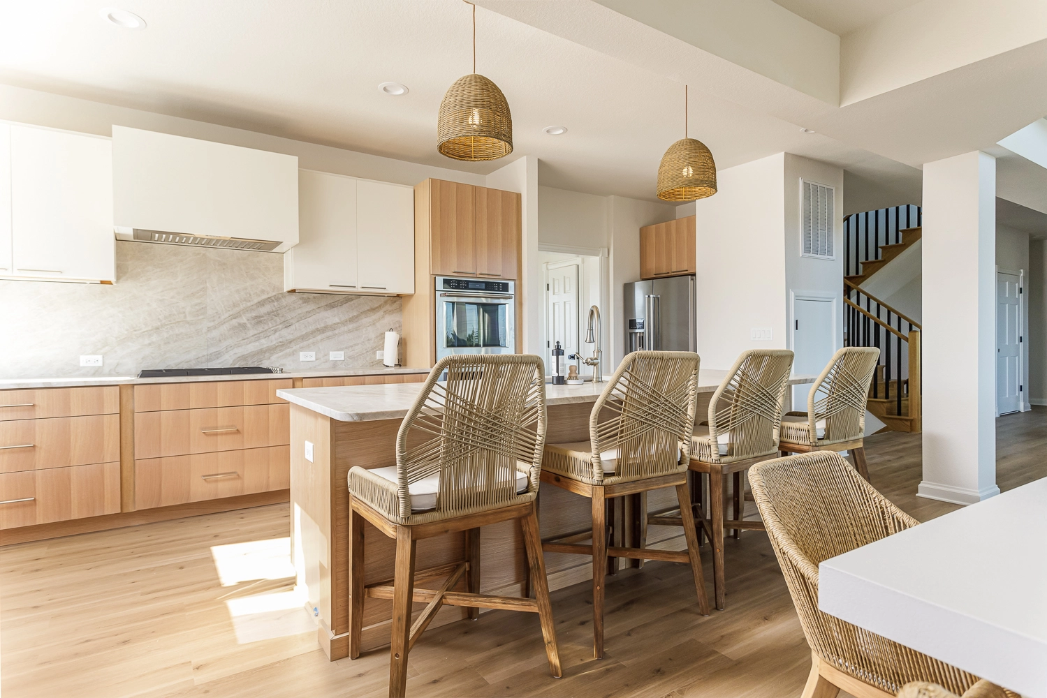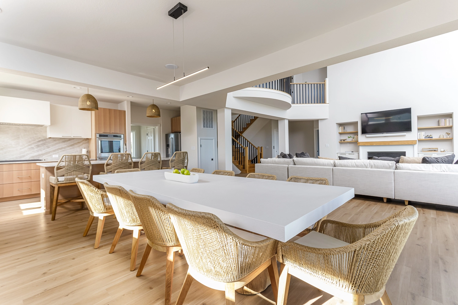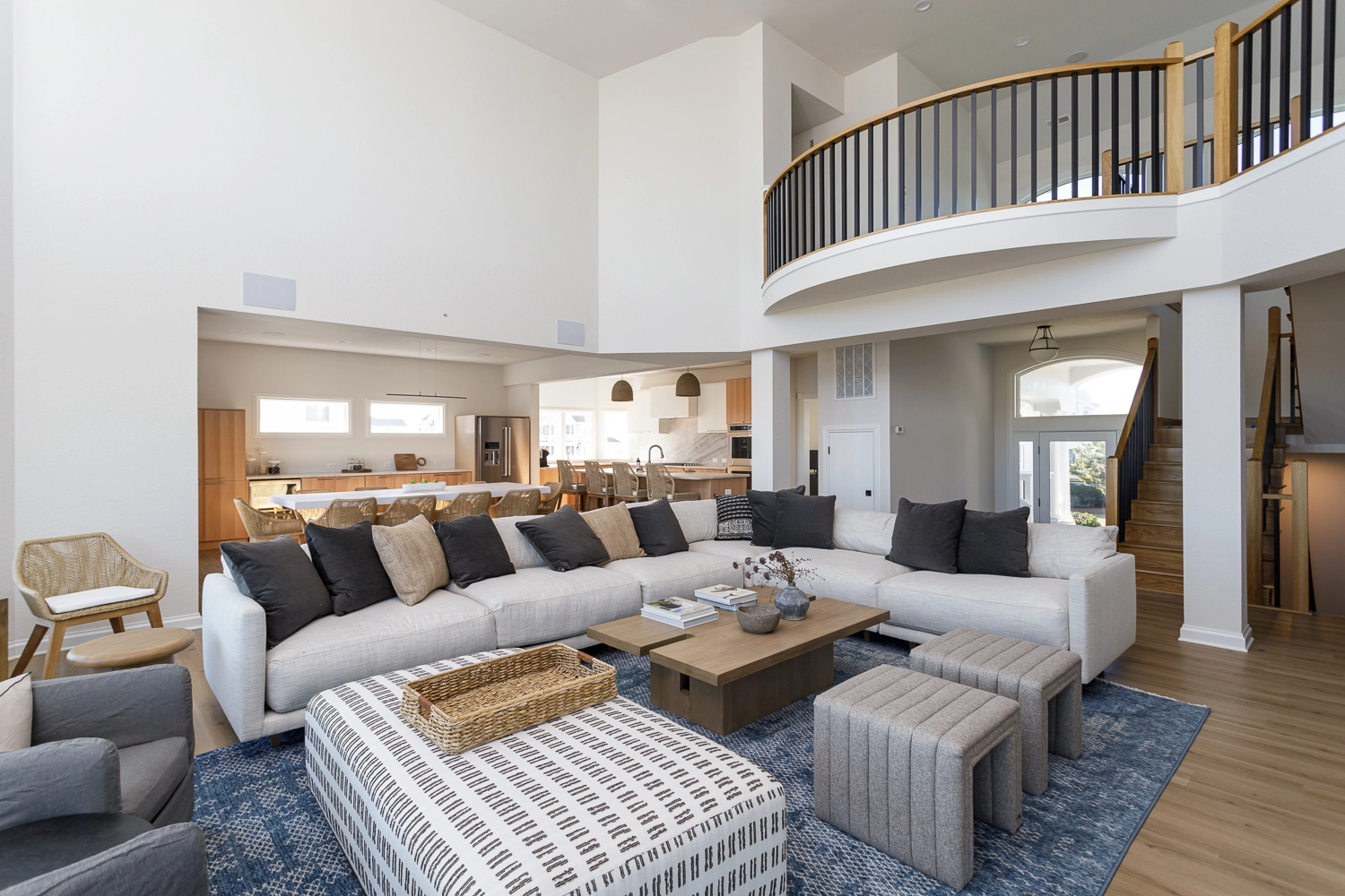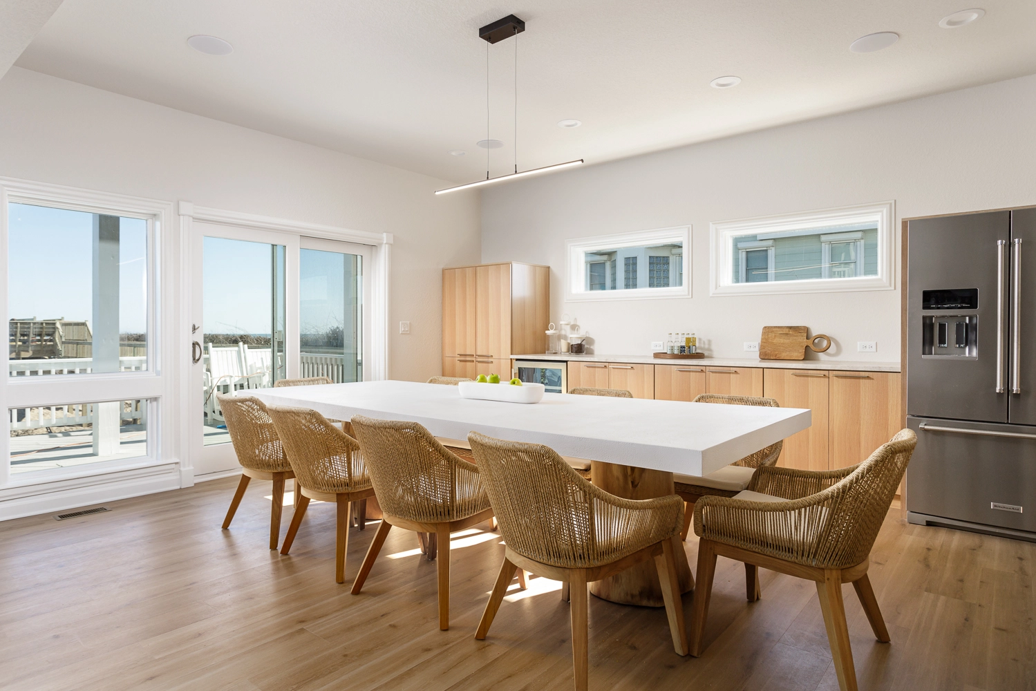 Great room with home theater system; kitchen with breakfast nook, two refrigerators, wine cooler, and two dishwashers; dining room; oceanview deck with outdoor table and seating.