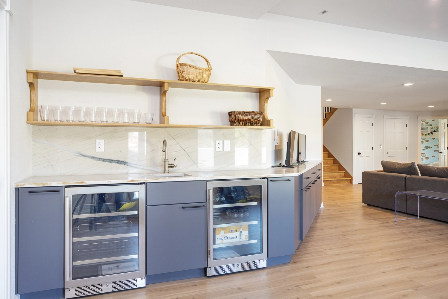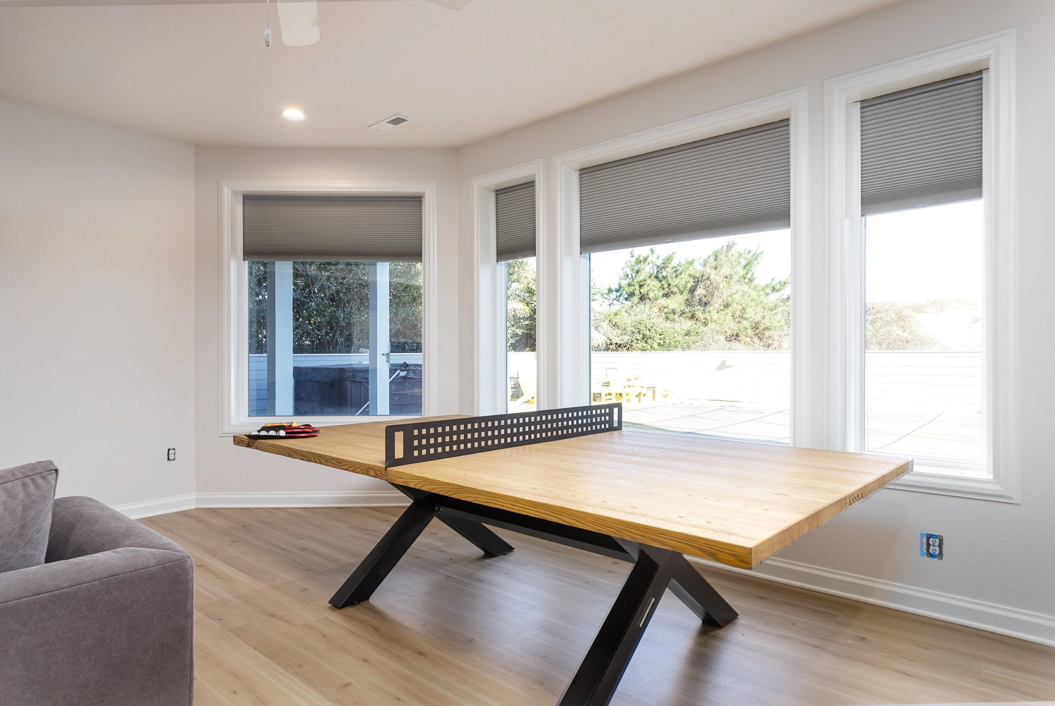 Rec room with ping pong table, entertainment center and game table; bar area with a sink and two drink coolers; laundry; garage; patio with a private pool, hot tub and outdoor shower.