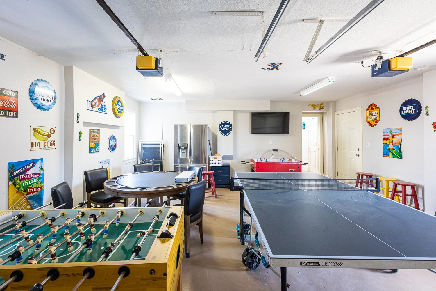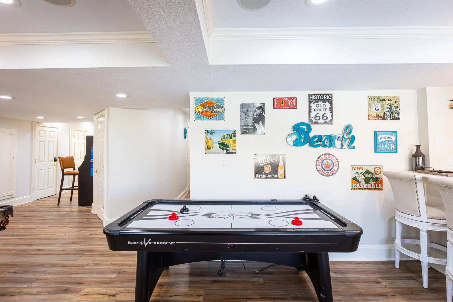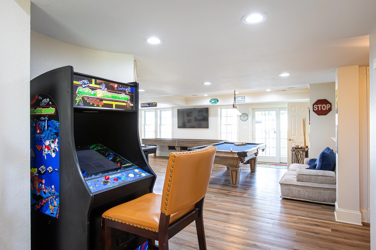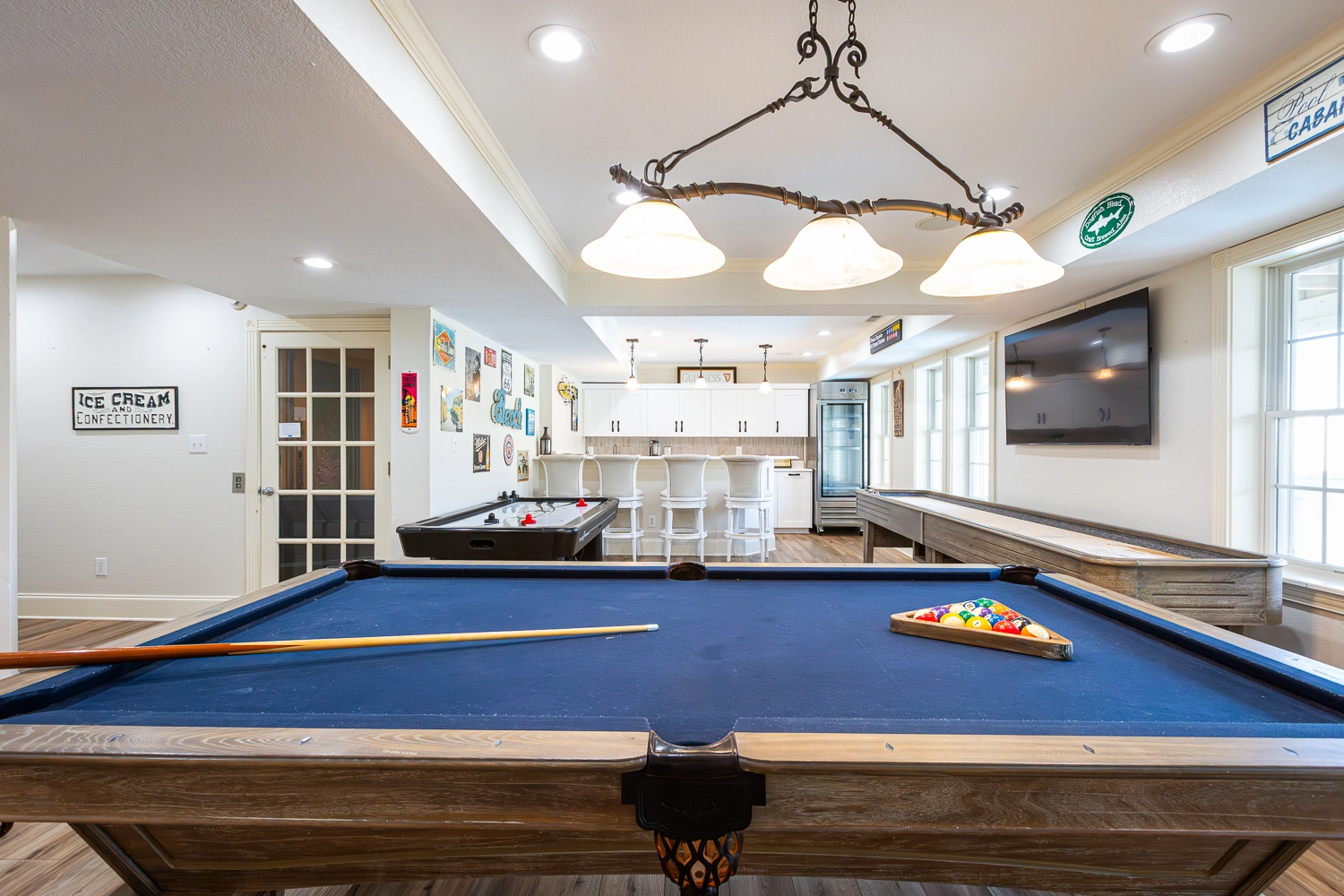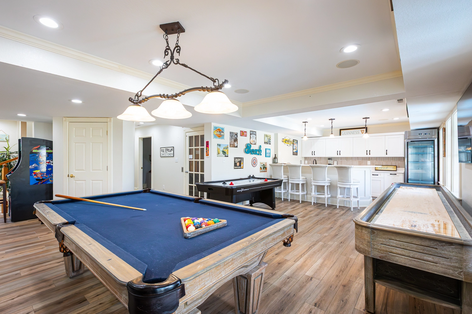 Rec room with pool table, air hockey, and shuffle board table; laundry.