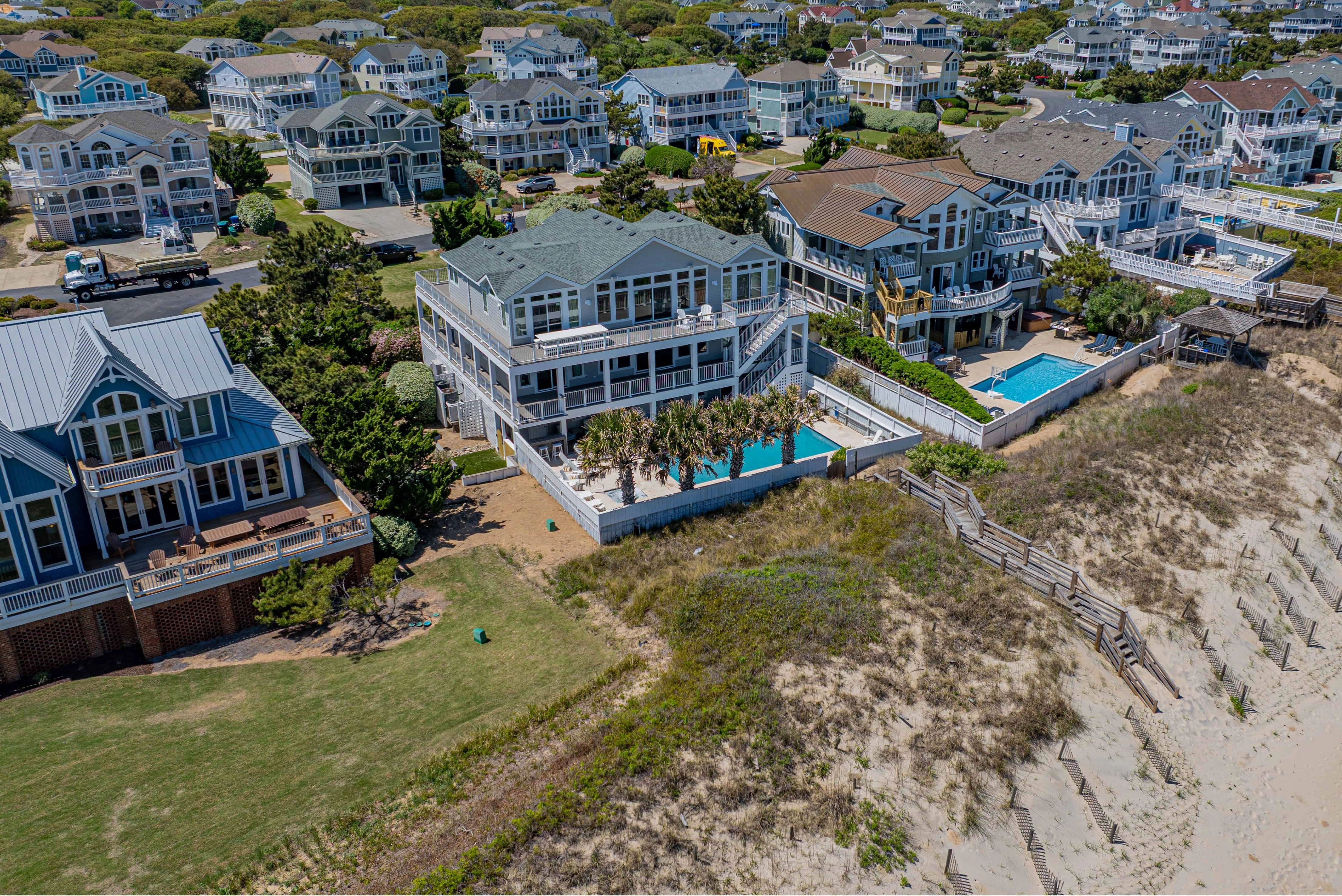 "The home was perfect for our family! We have been to OBX many times but it was our first time staying right on the ocean so we were definitely spoiled! The new decking was very nice and the views can't be beat. The pool was wonderful and used all the time. It was larger than expected and we were grateful we decided on the pool heat for the kids since the weather was a tad cooler than normal. The home is perfect for a large group with 2 dishwashers and 3 refridgerators. The bedrooms all had ample storage and the en-suite bathrooms were a plus. We loved the home's proximity to Scarborough Lane, shops and coffee - all within walking distance. Four seasons is a lovely, quiet, well kept community with very nice amenities and we plan to be back. The only suggestion I would make is to add more pots and pans and cookie sheets for baking. We made due with what was provided, but when cooking for a large group, we had to do some improvising. It was truly an amazing week and we thank you for sharing your beautiful home with us!"
