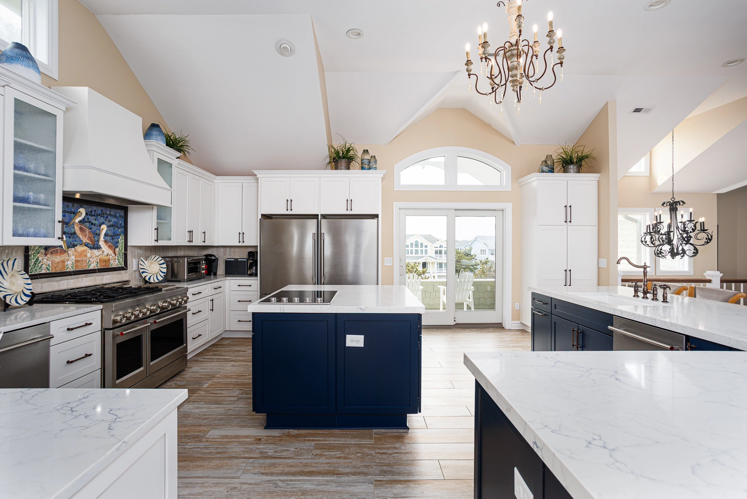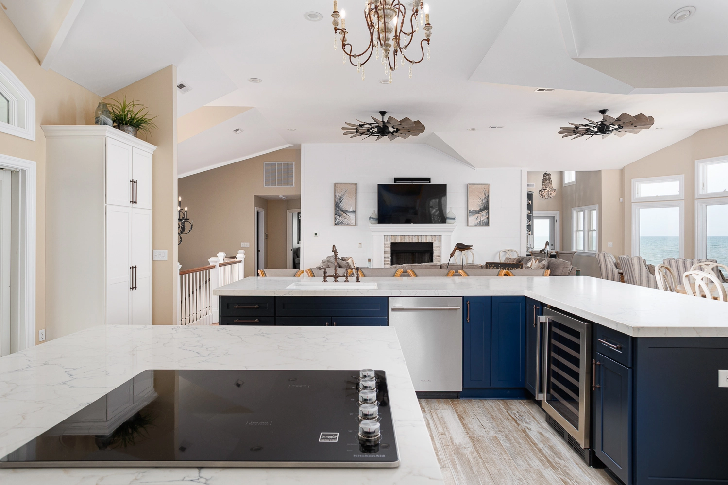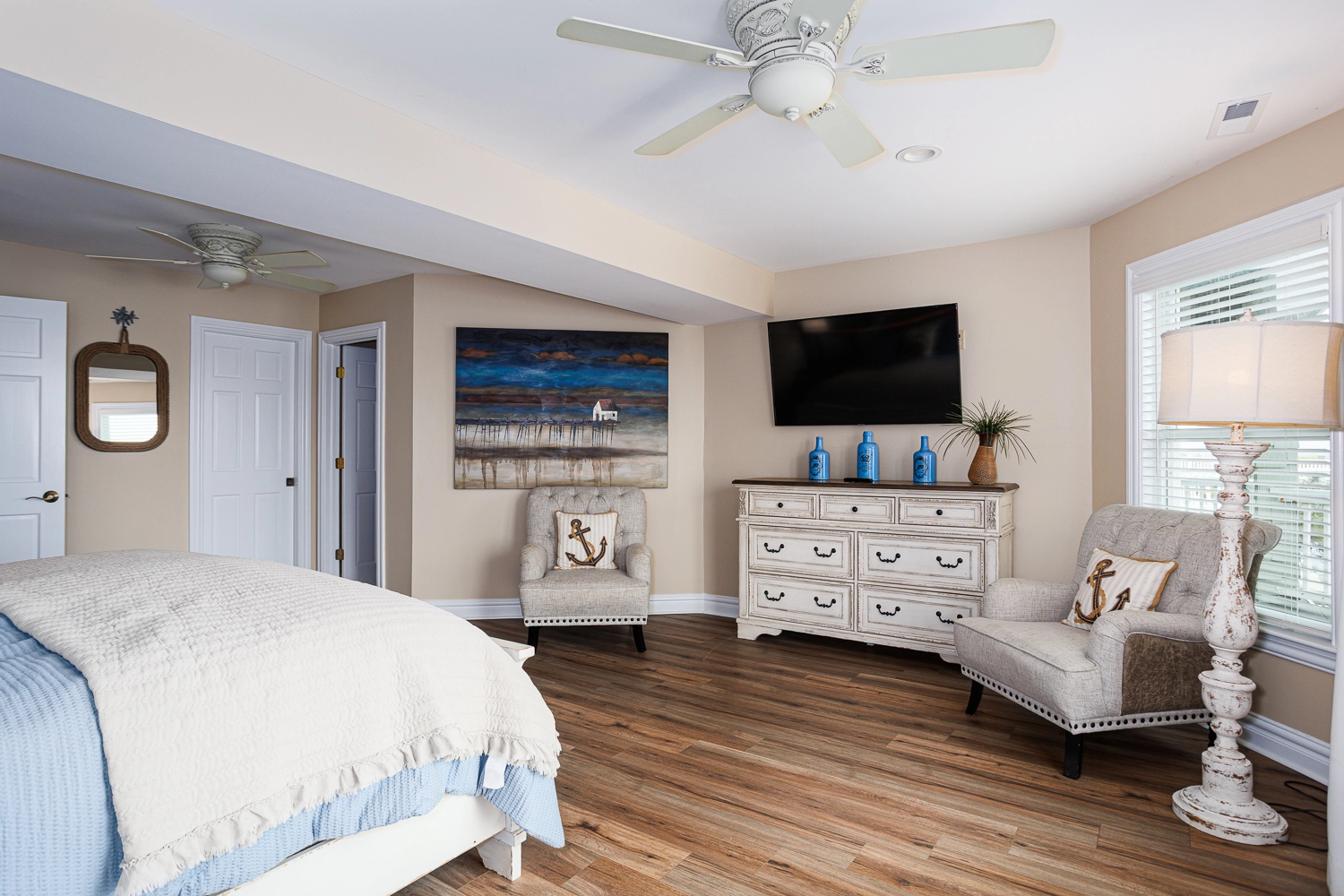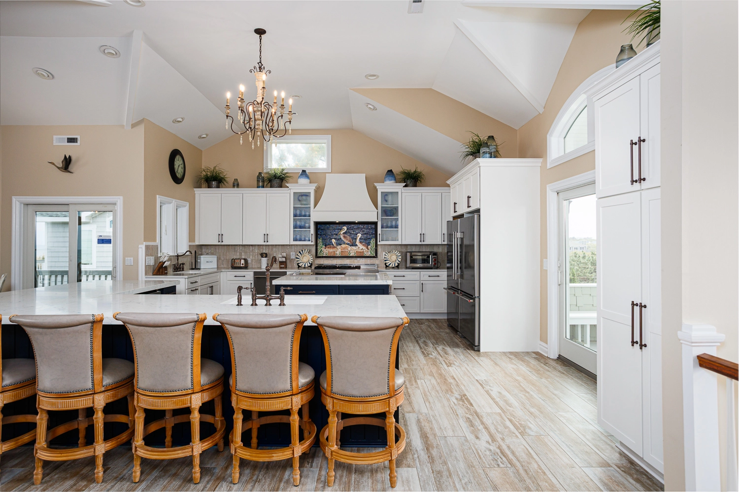 Upon turning into the driveway and passing through the grand entrance pillars, you will pass by the property’s putting green and lush landscaping, including beautiful palm trees. Enter the eloquent home, which greets you with everything needed for a relaxing and fun vacation. The top level of the home features a light and airy great room with large windows to allow the beautiful ocean view in. The spacious kitchen includes quartz countertops, two islands, and upscale appliances to make meal prep a breeze. Enjoy dinner at the large, custom-made dining table, or dine alfresco on the deck off of the kitchen while enjoying the ocean views and salty breezes. Rocking chairs are provided on the decks for afternoon relaxation. There is a separate wet bar in the great room as another option to sit and relax with a cold beverage. The top level is completed by a half bathroom and a master bedroom with a whirlpool tub in the private bathroom.