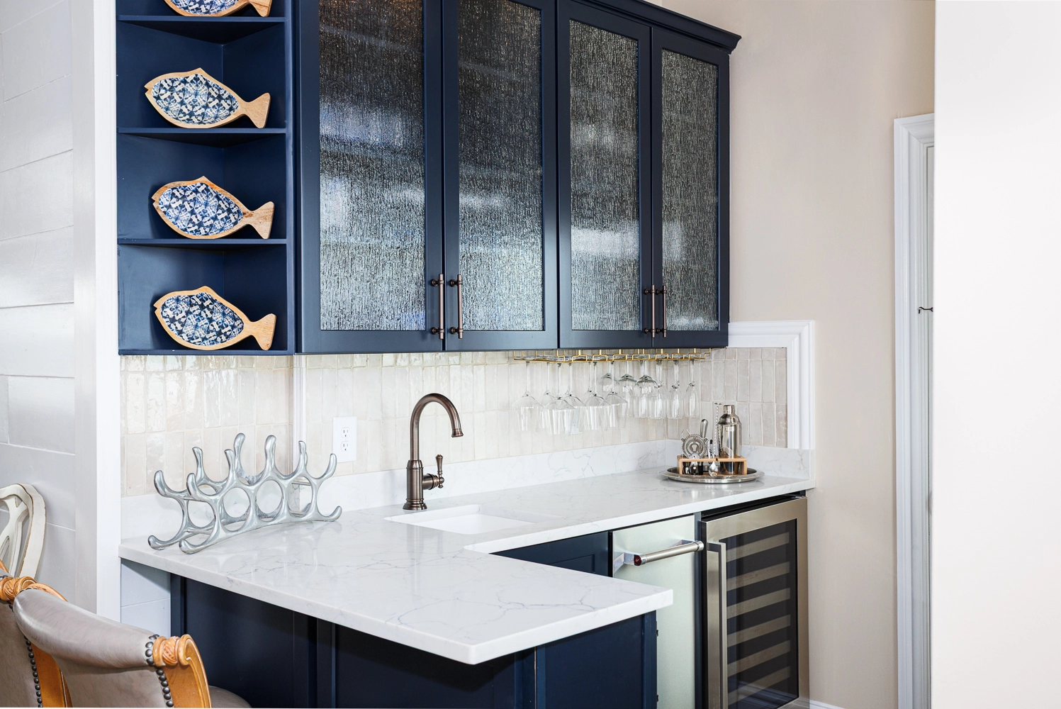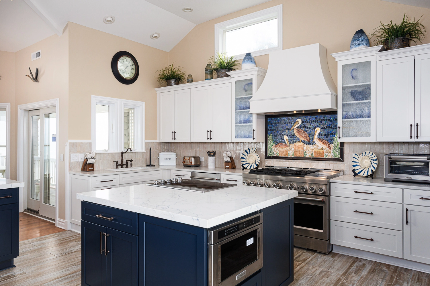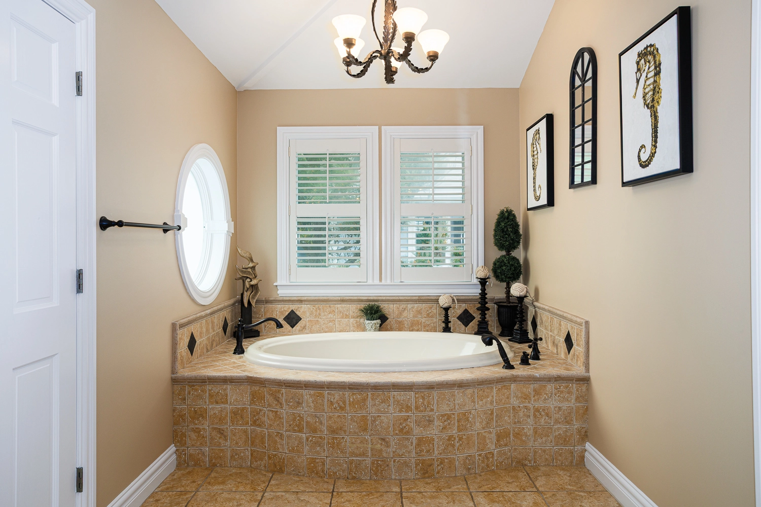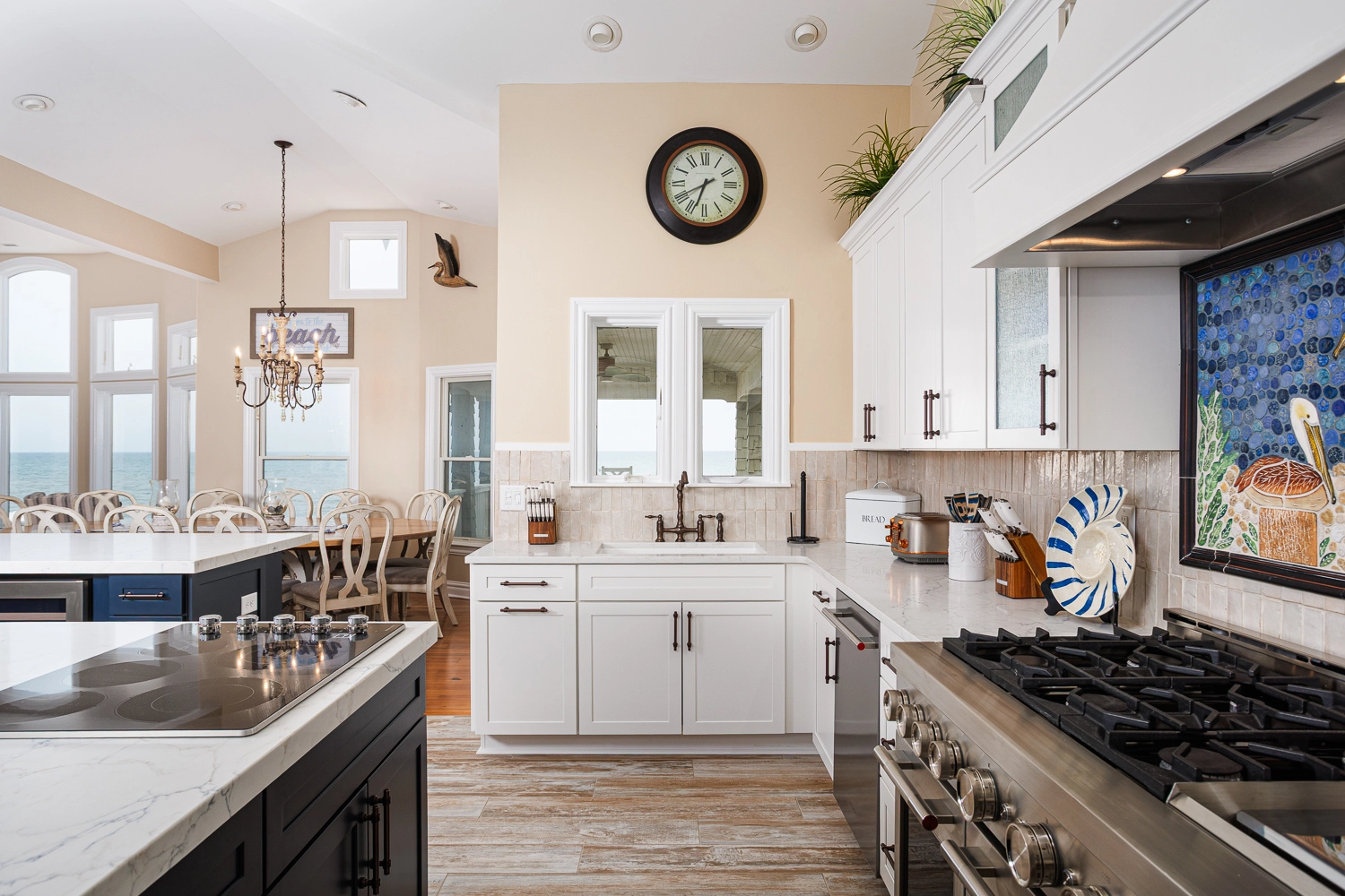 Upon turning into the driveway and passing through the grand entrance pillars, you will pass by the property’s putting green and lush landscaping, including beautiful palm trees. Enter the eloquent home, which greets you with everything needed for a relaxing and fun vacation. The top level of the home features a light and airy great room with large windows to allow the beautiful ocean view in. The spacious kitchen includes quartz countertops, two islands, and upscale appliances to make meal prep a breeze. Enjoy dinner at the large, custom-made dining table, or dine alfresco on the deck off of the kitchen while enjoying the ocean views and salty breezes. Rocking chairs are provided on the decks for afternoon relaxation. There is a separate wet bar in the great room as another option to sit and relax with a cold beverage. The top level is completed by a half bathroom and a master bedroom with a whirlpool tub in the private bathroom.