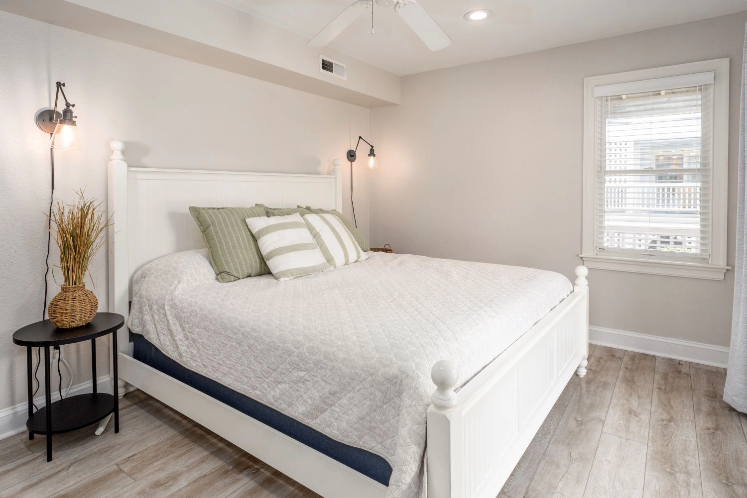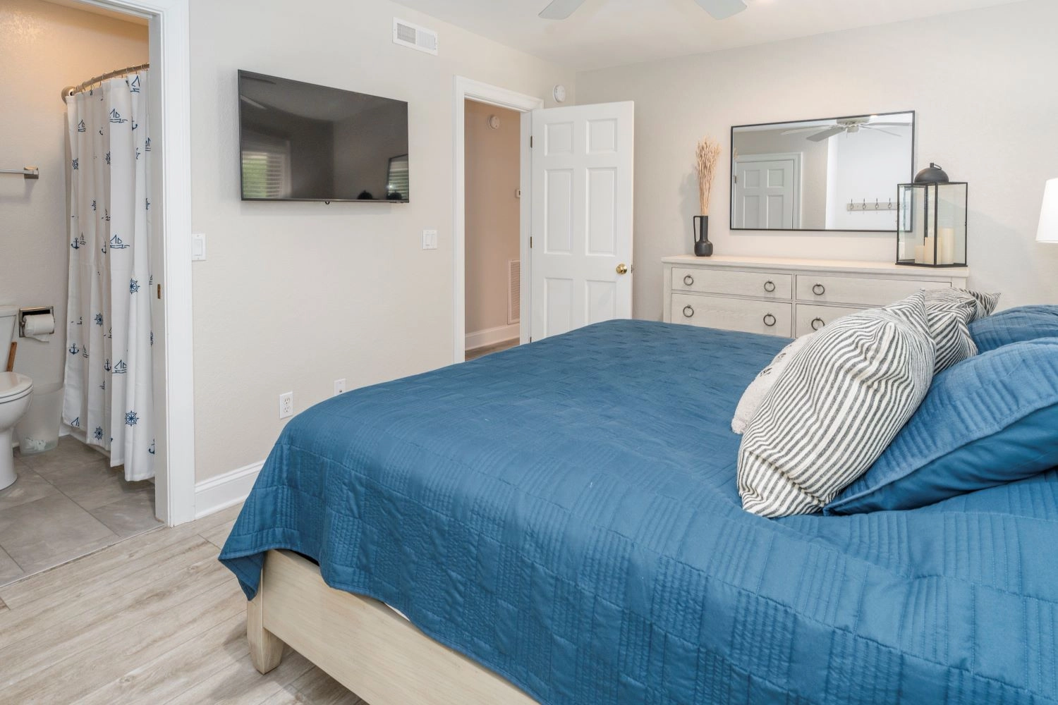 Queen, Semi-private bath, Standing shower, Deck access