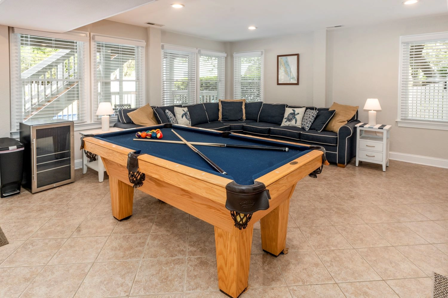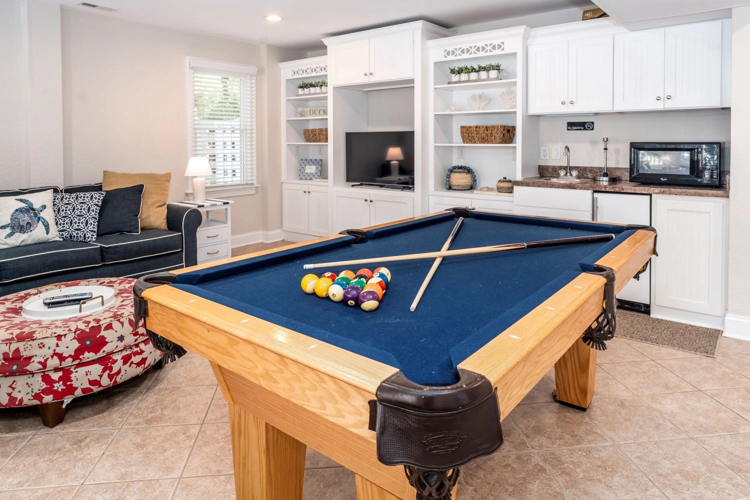 Game room (QSS) with pool table, and a wet bar with microwave and mini-refrigerator; laundry; patio with private pool and outdoor shower.