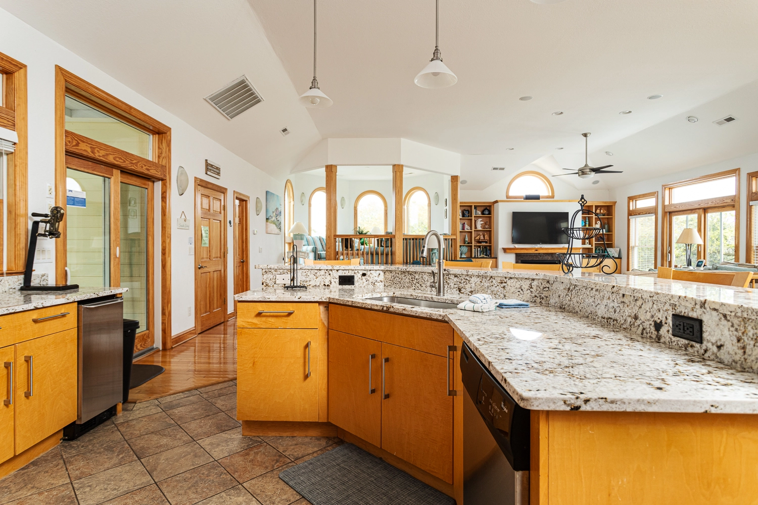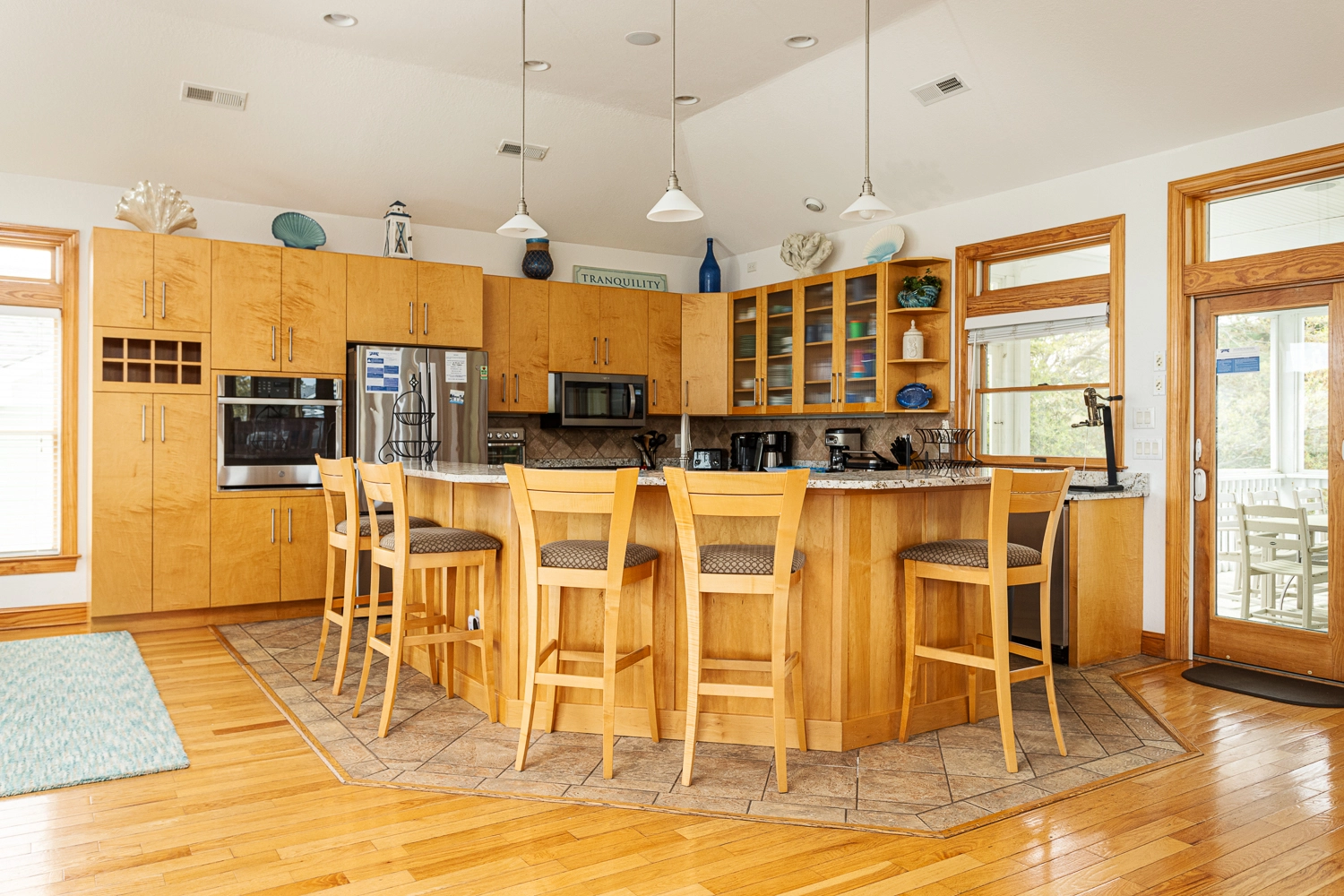 Great room; kitchen with JennAir, two dishwashers and two ovens; dining area; ship’s watch; screened porch with wet bar.