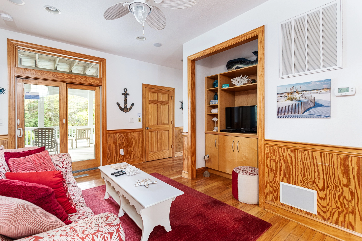 Den with entertainment center; covered decks.