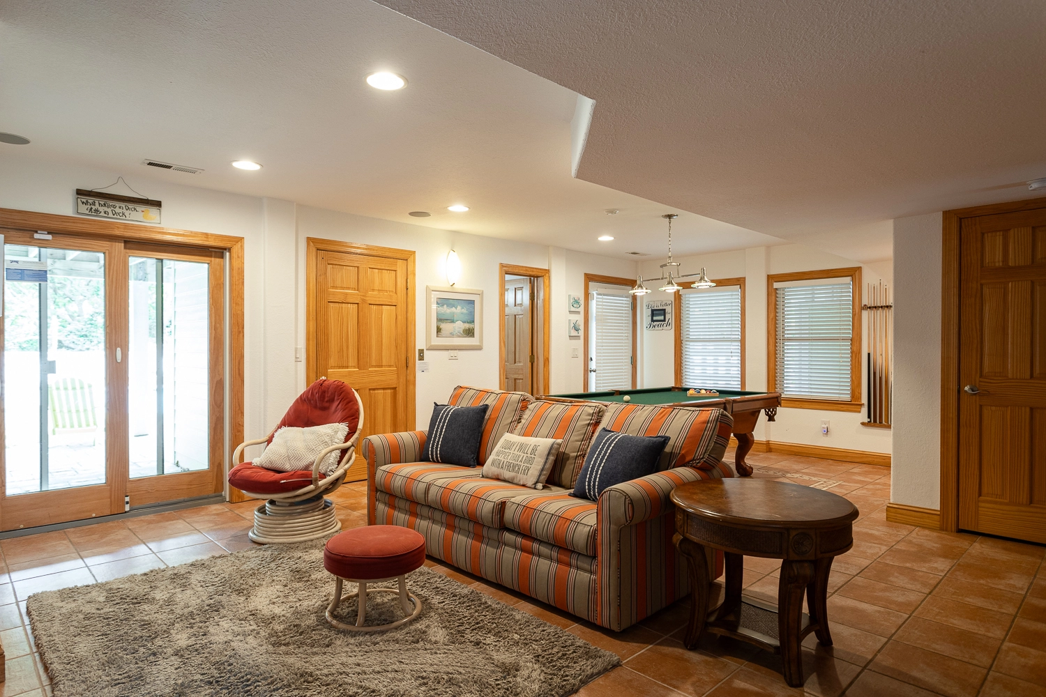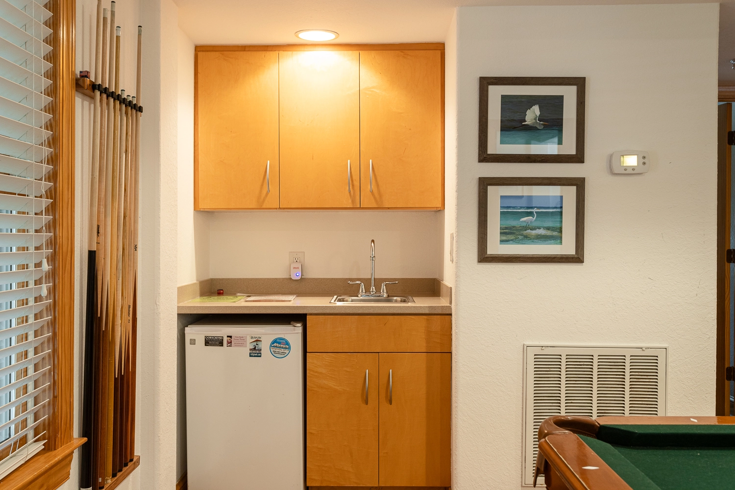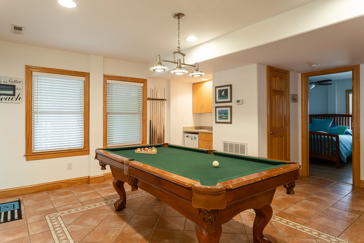 Rec room with pool table, entertainment center, kitchenette with refrigerator and wet bar; laundry; patio with pool and elevated eight-person hot tub, outside bar with gas grill and refrigerator.