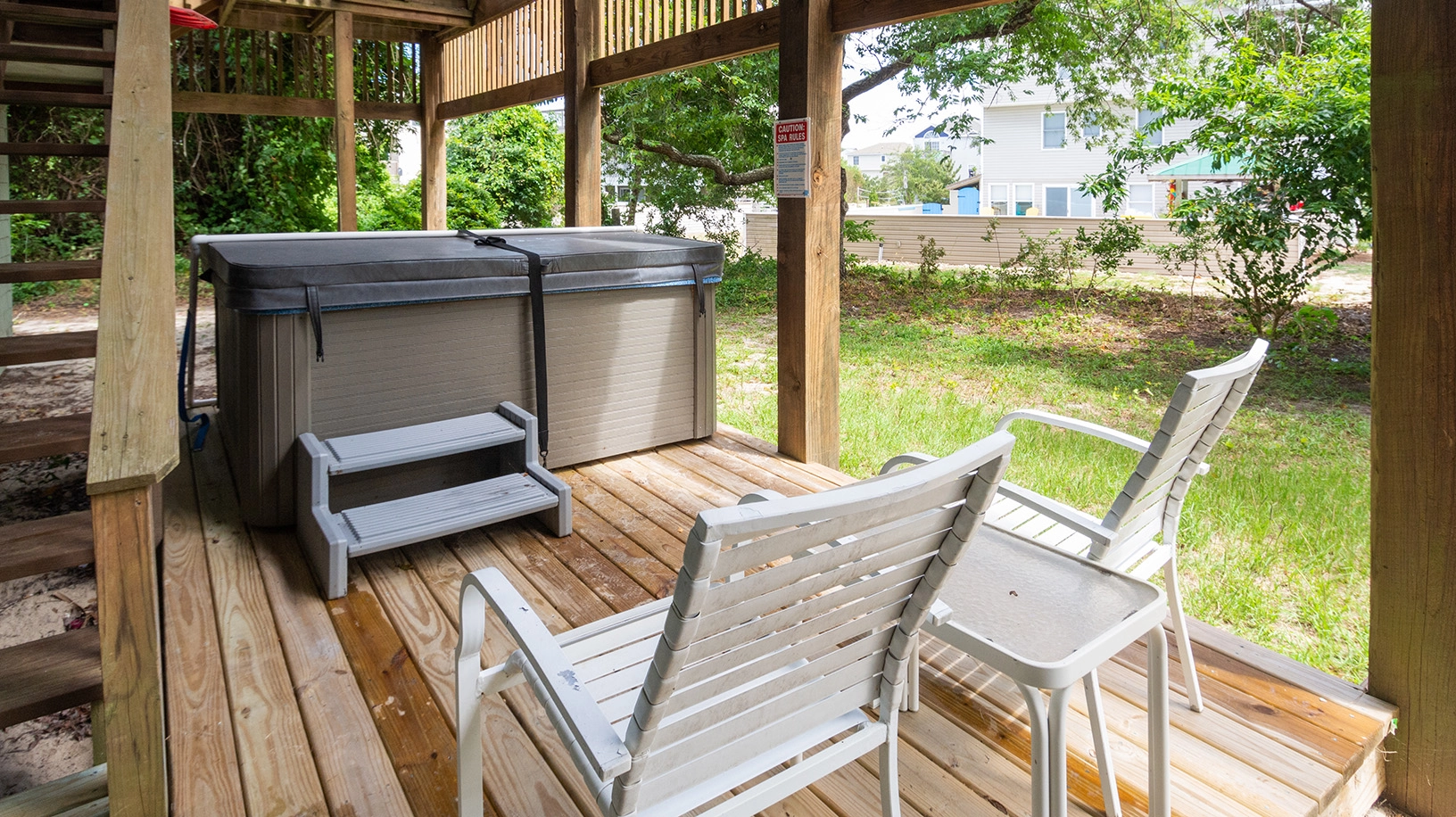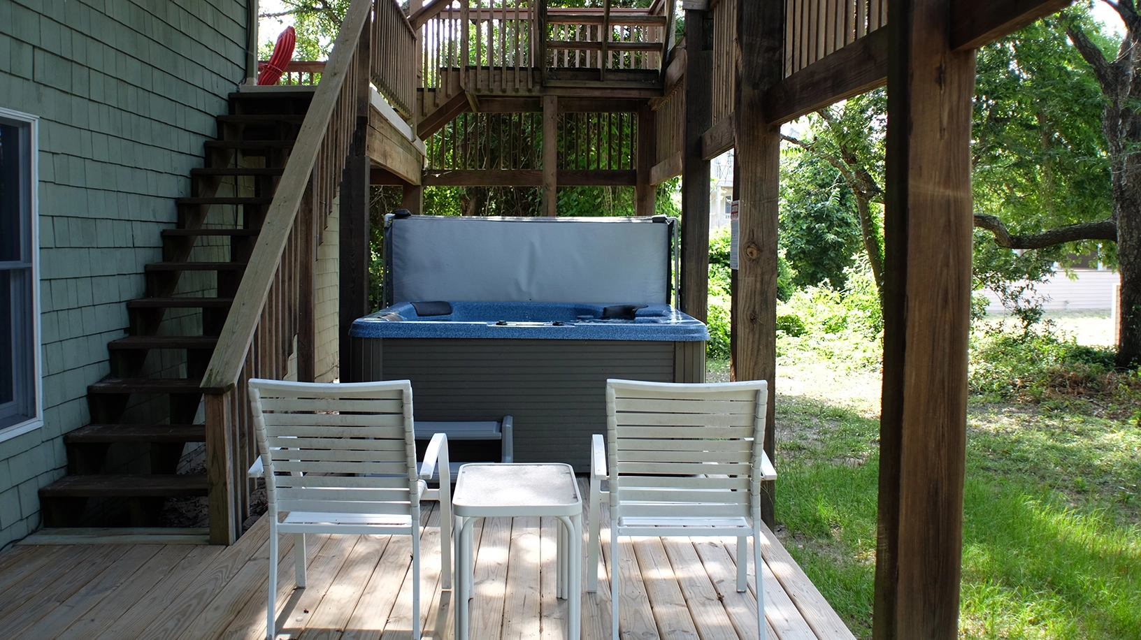 Covered decks with access to the hot tub on Level 1.
