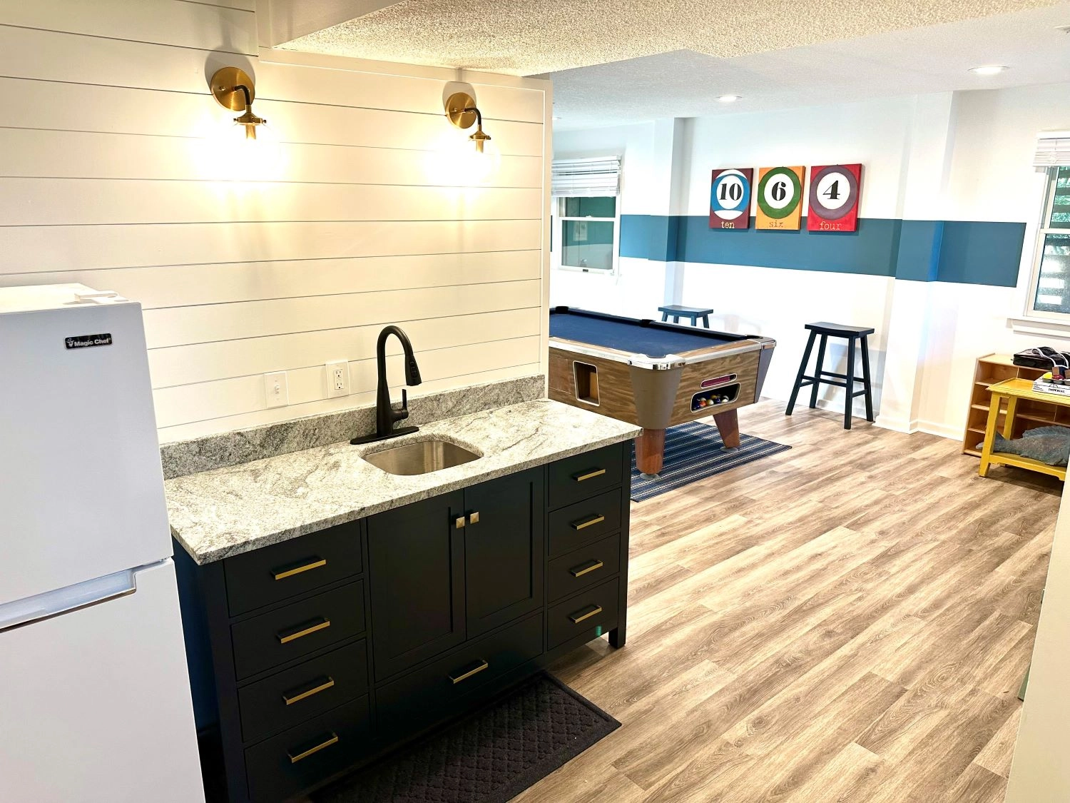 Game room with pool table and wet bar; outside shower; hot tub.