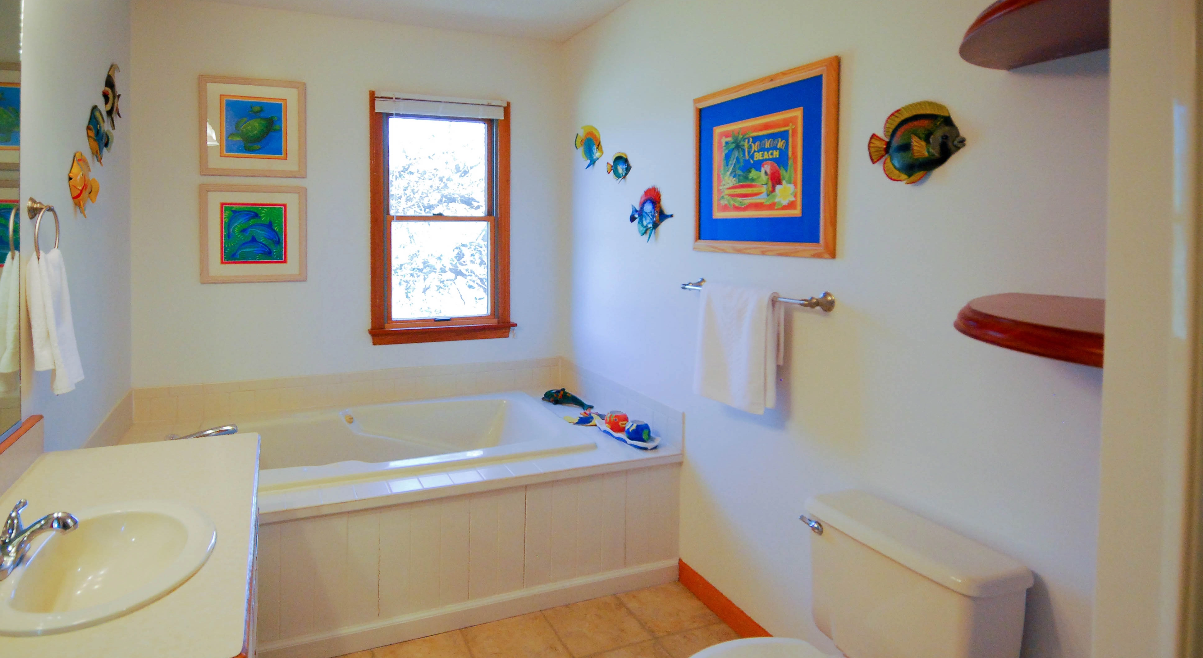 "We love the location of the house, beautiful sunsets from the back deck. The house interior is well taken care of. Nicely decorated and kitchen is well stocked. Showers are on small side, summer is too hot to want to use whirlpool tubs. Wagon wheel broken and one of the beach chairs was broken, but good supply of chairs."