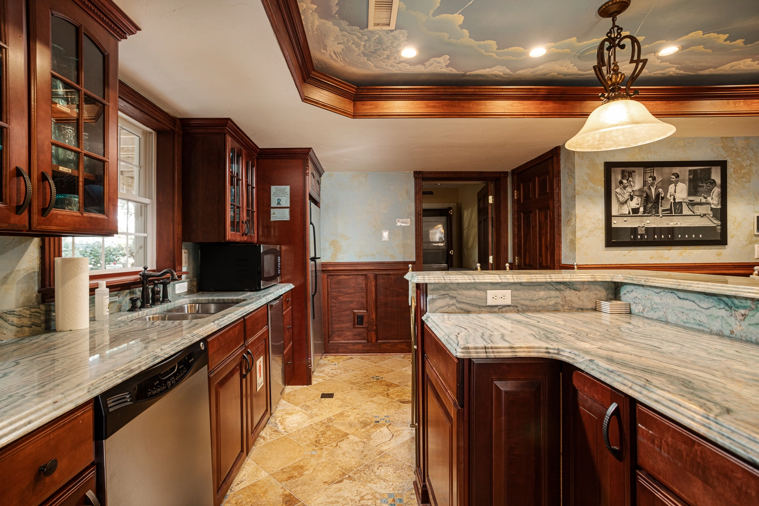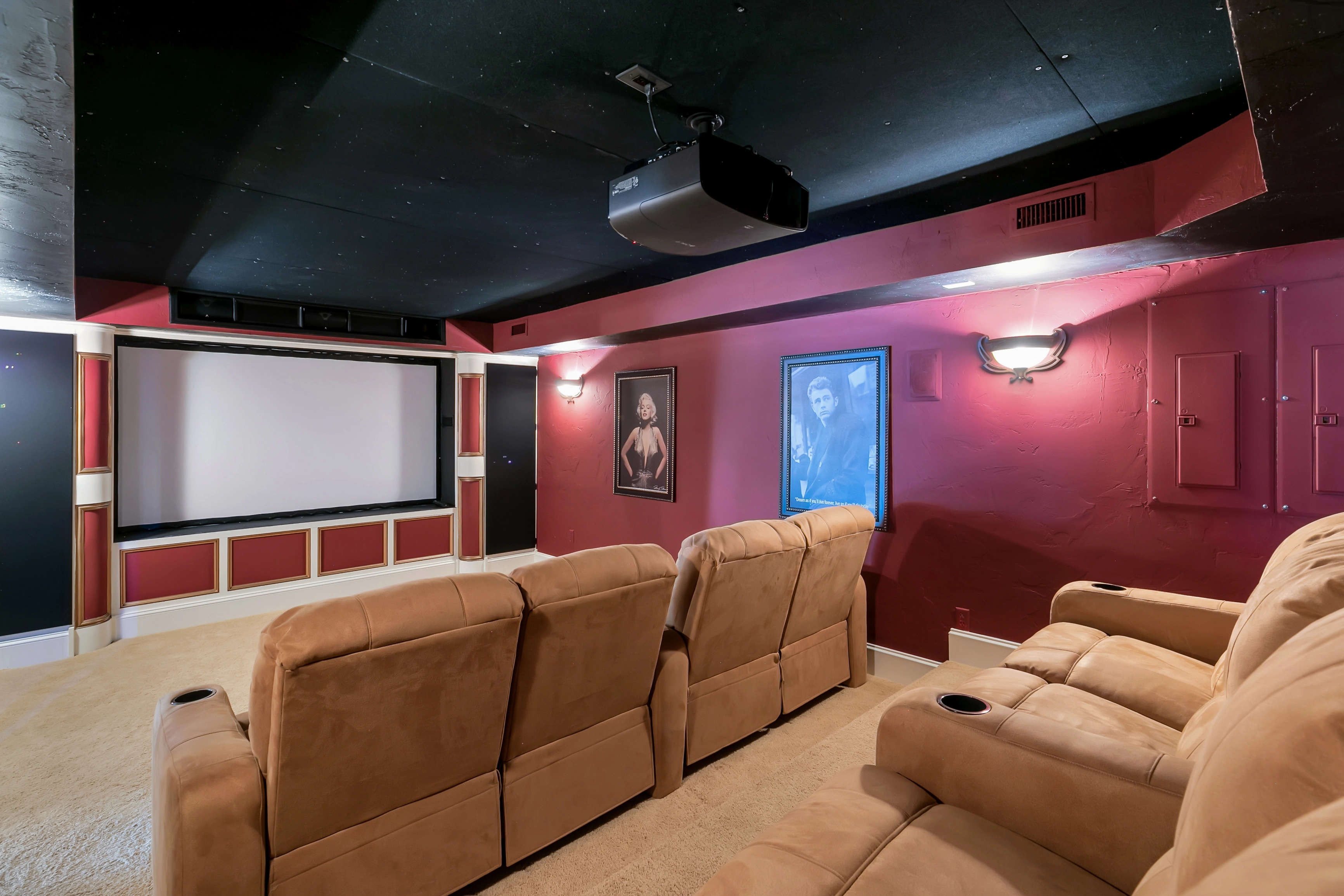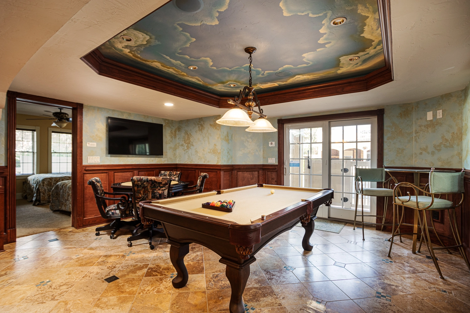 Theater room; rec room with pool table, foosball, game table, kitchenette with bar seating, refrigerator, dishwasher, and microwave; laundry.