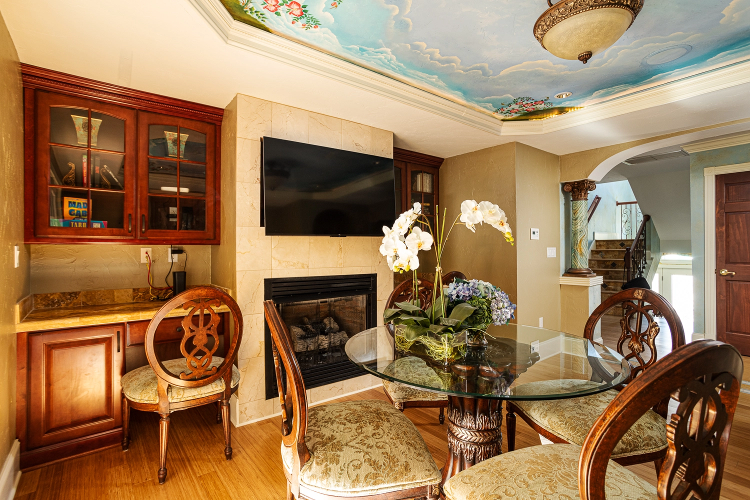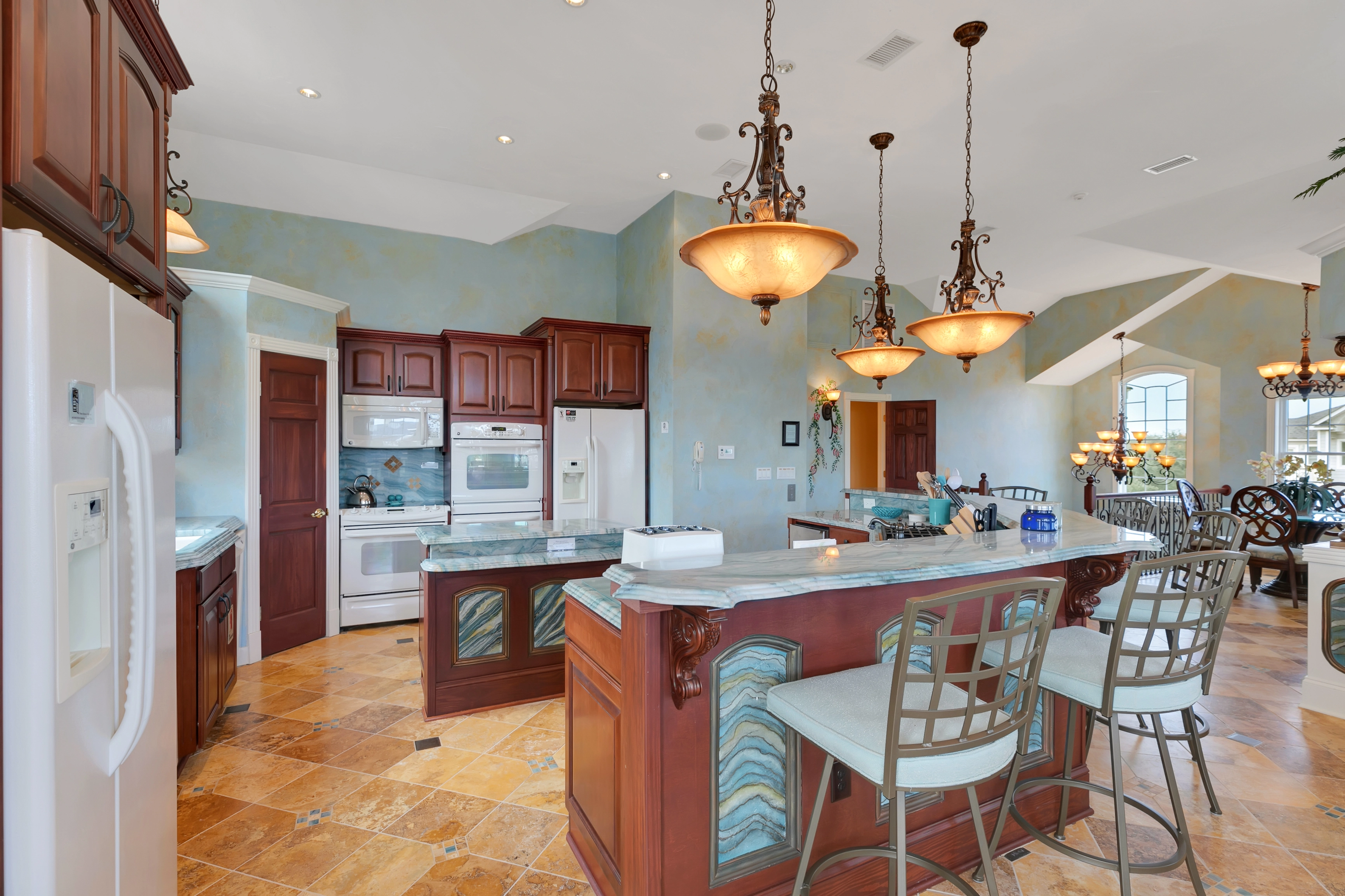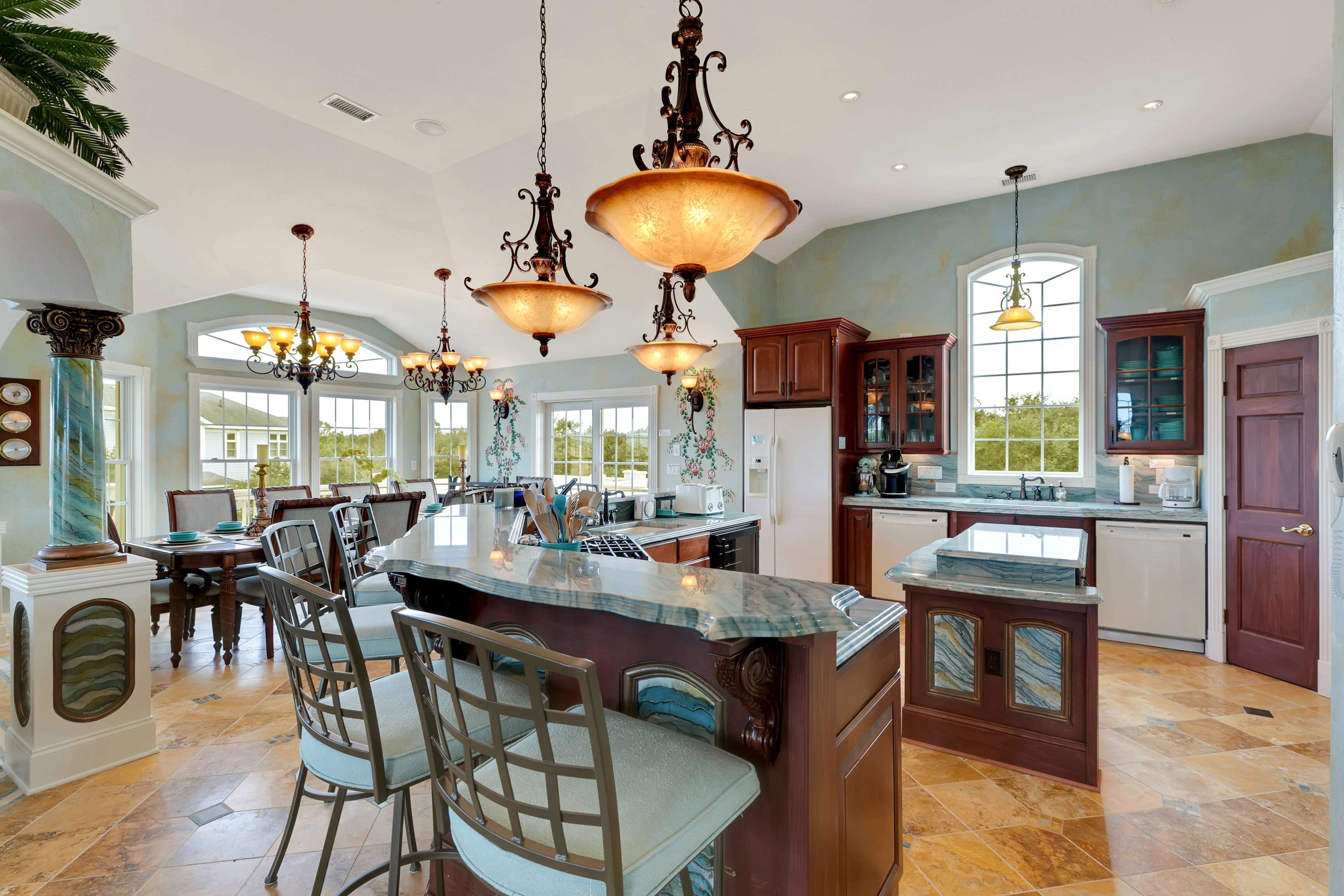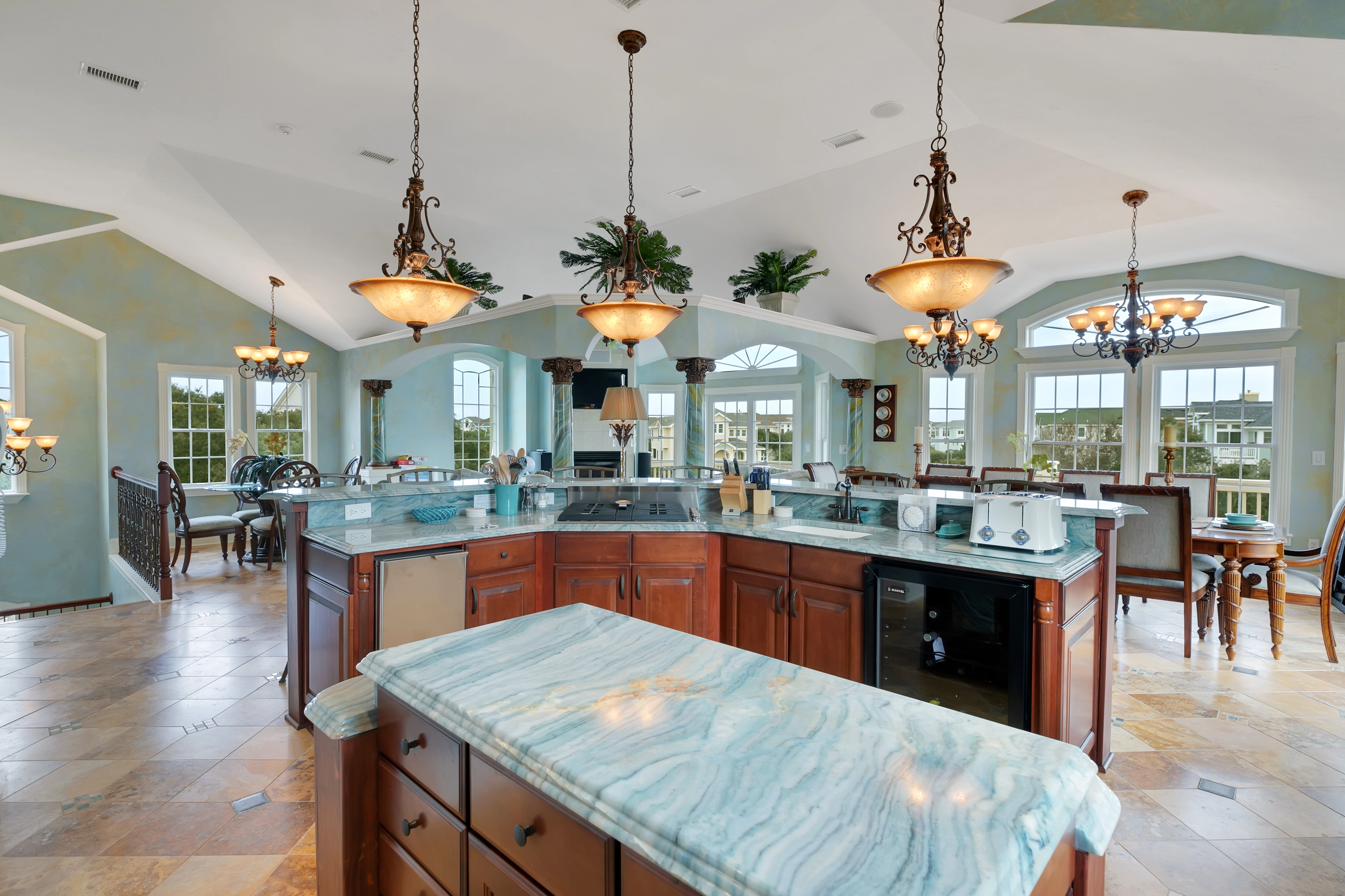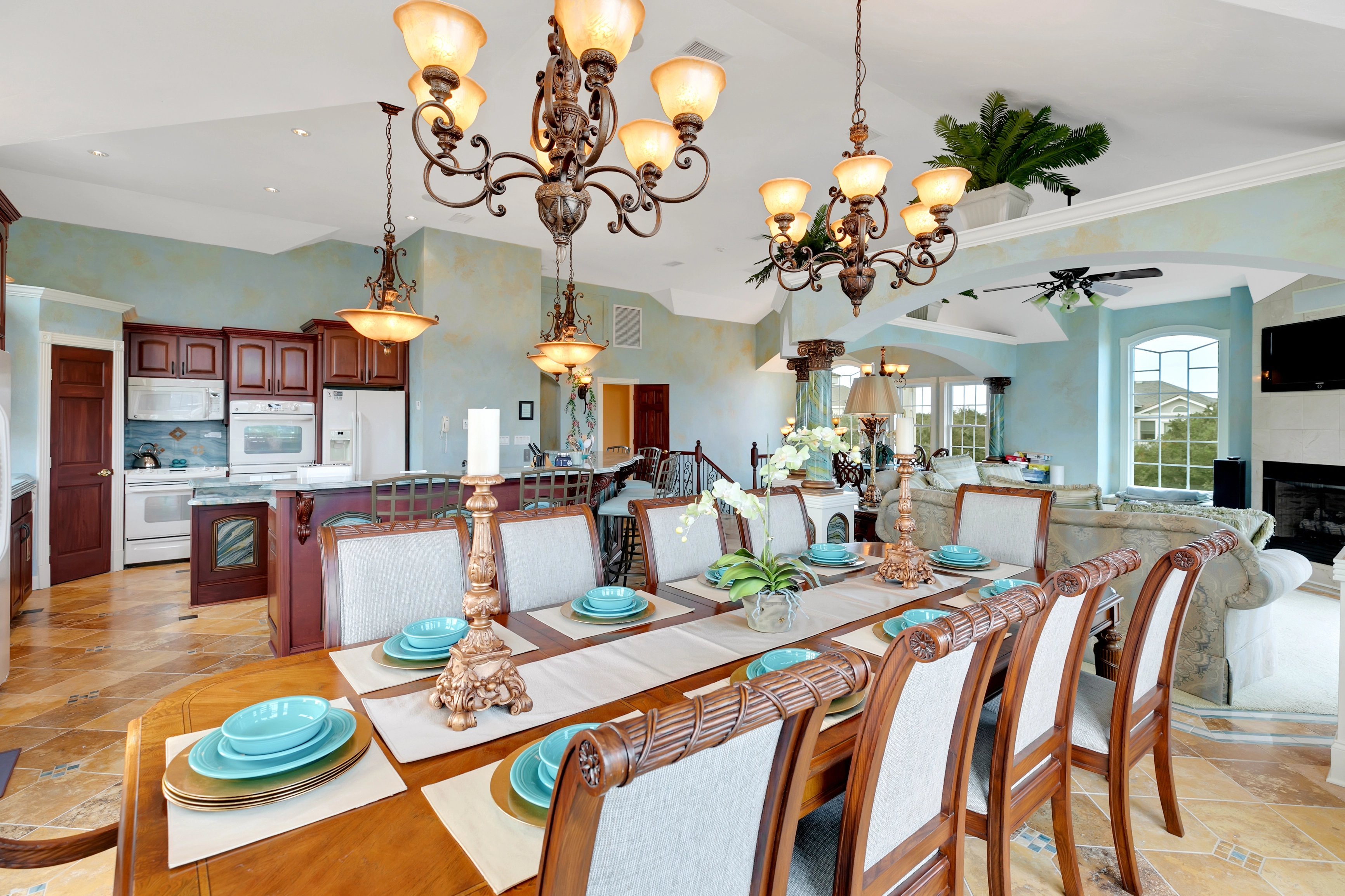 Great room with gas fireplace; kitchen with two refrigerators, two cooktops, three ovens, two dishwashers; dining area.