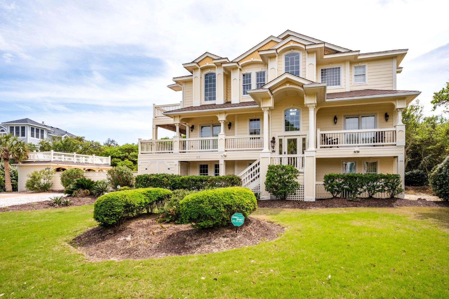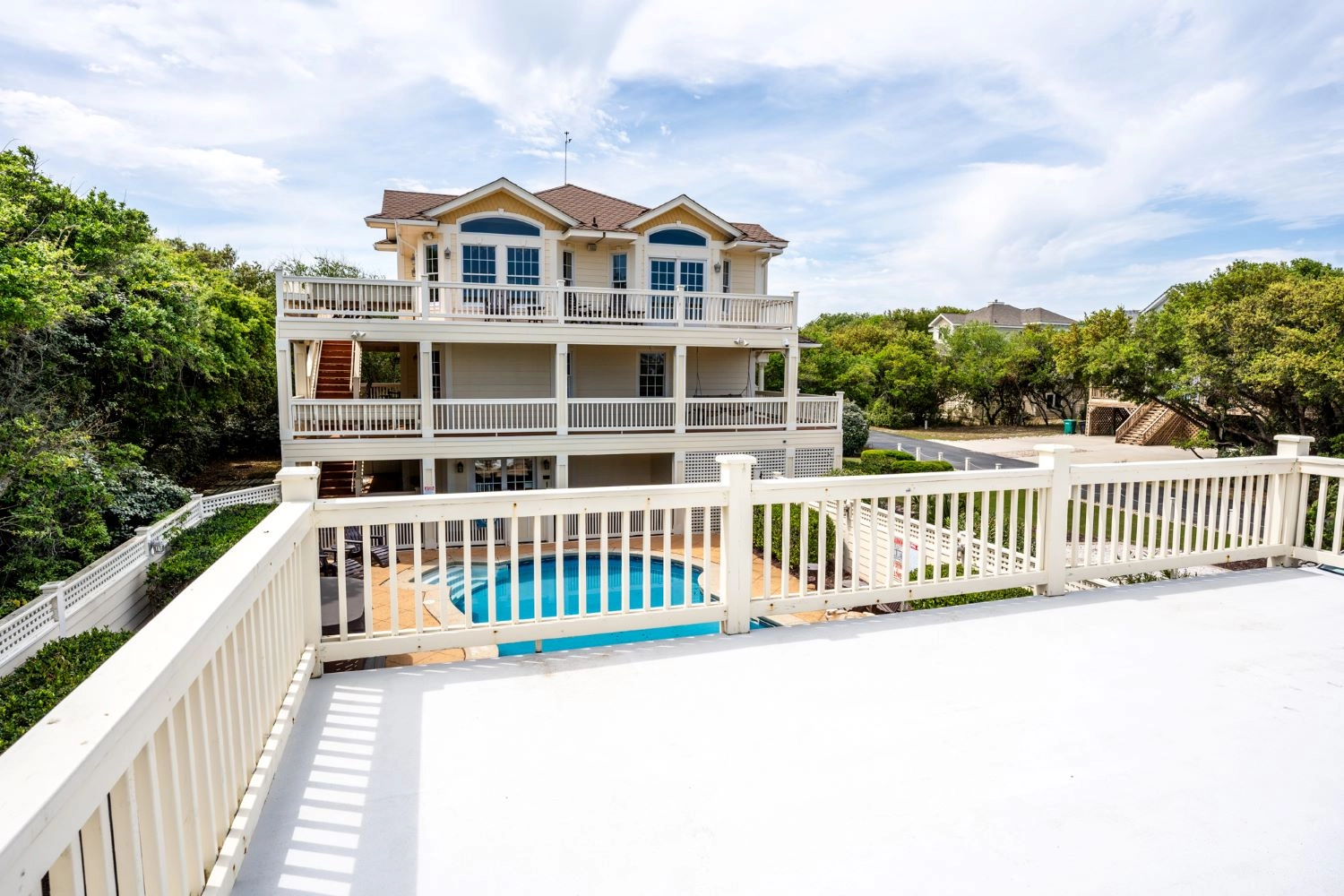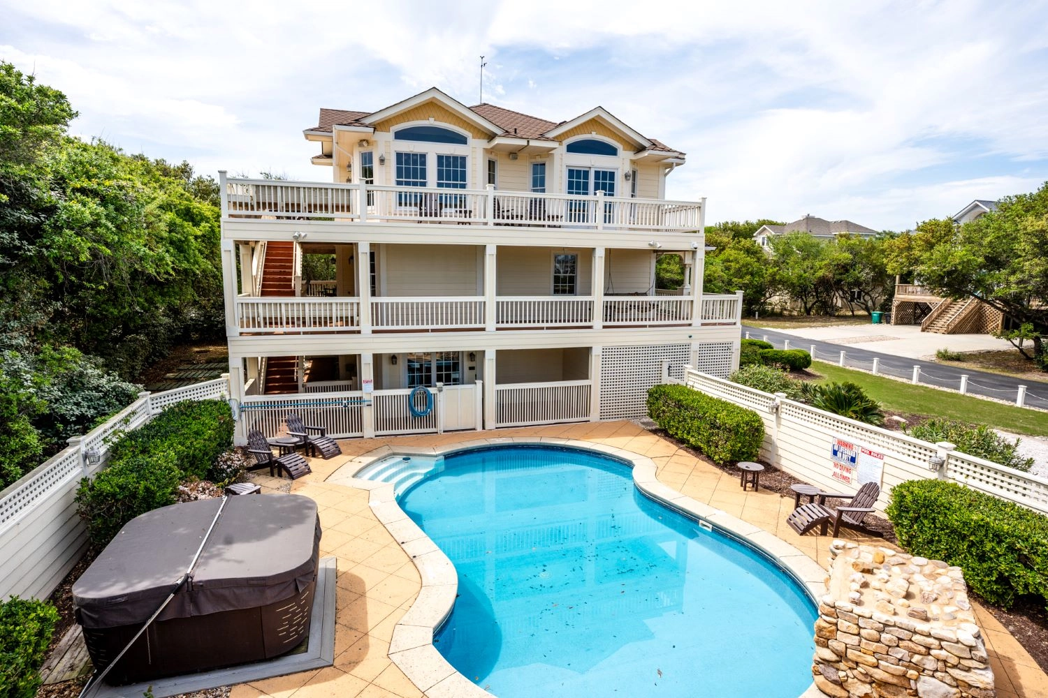 "We had 8 adults and 3 children (under 7 yrs) and the house accommodated us all nicely. Loved that each room had its own full bathroom (plus pwdr rooms on two of the floors). The walk to beach was short, but we did rent a golf cart to help with hauling chairs and umbrellas. The pool area was exceptional - hot tub, covered bar area and full bathroom! The kitchen also had 2 refrigerators and 2 dishwashers which was helpful with big group. We will rent Catch and Relax again!"