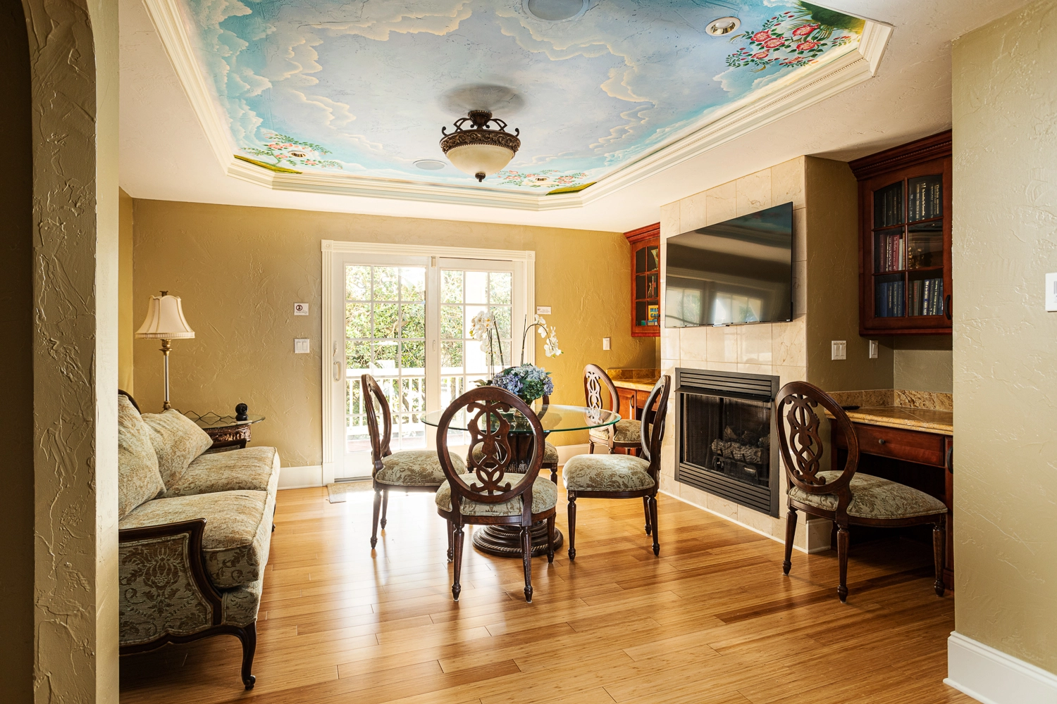 Den with gas fireplace.