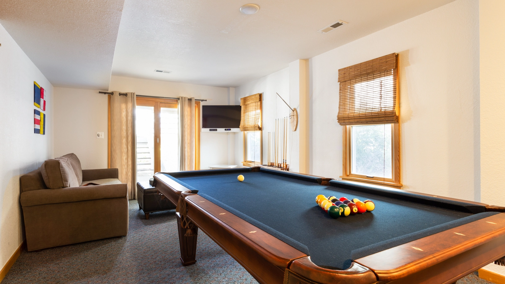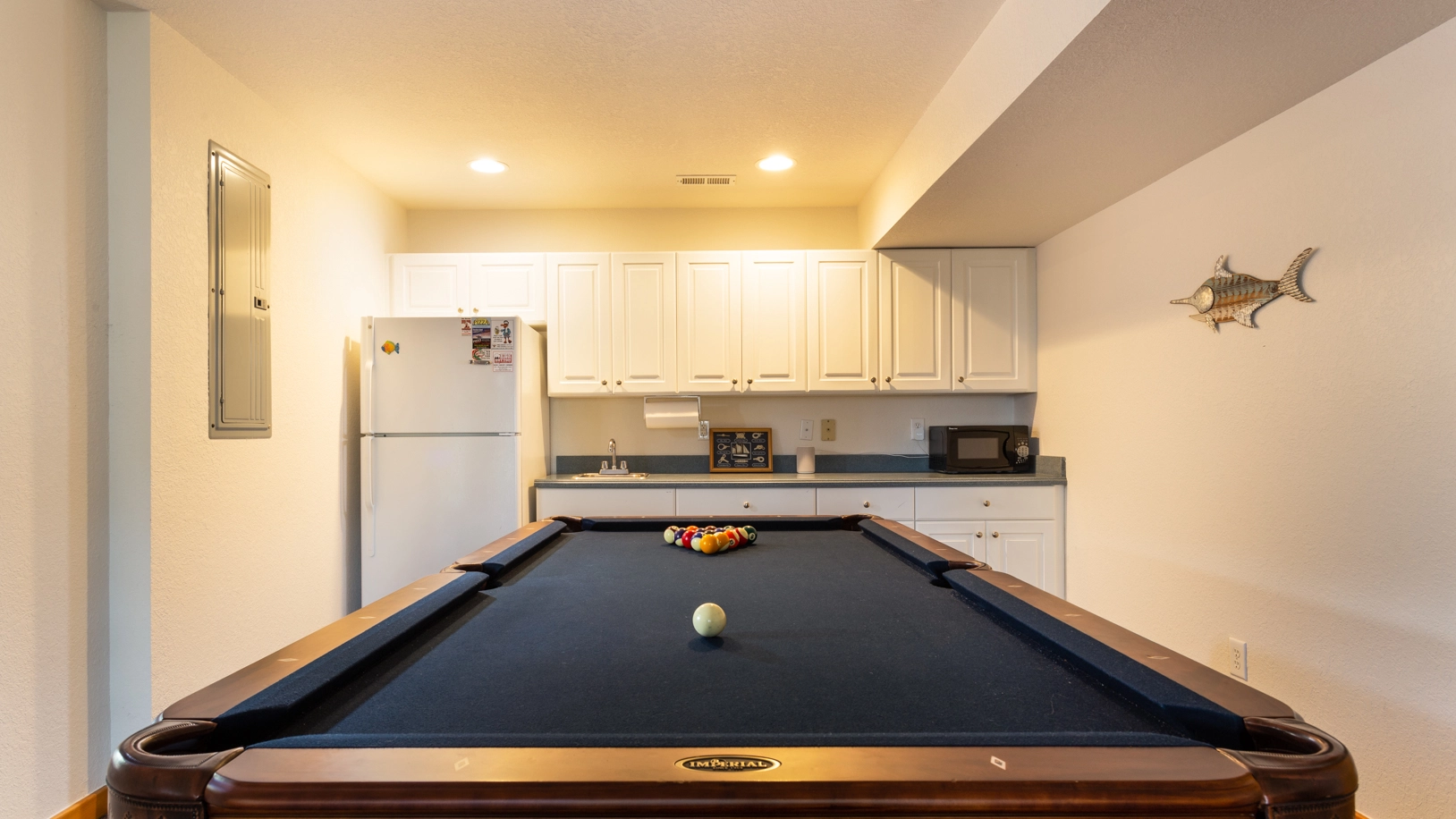 Rec room with pool table, kitchenette with refrigerator and microwave; patio with private pool and tiki bar.