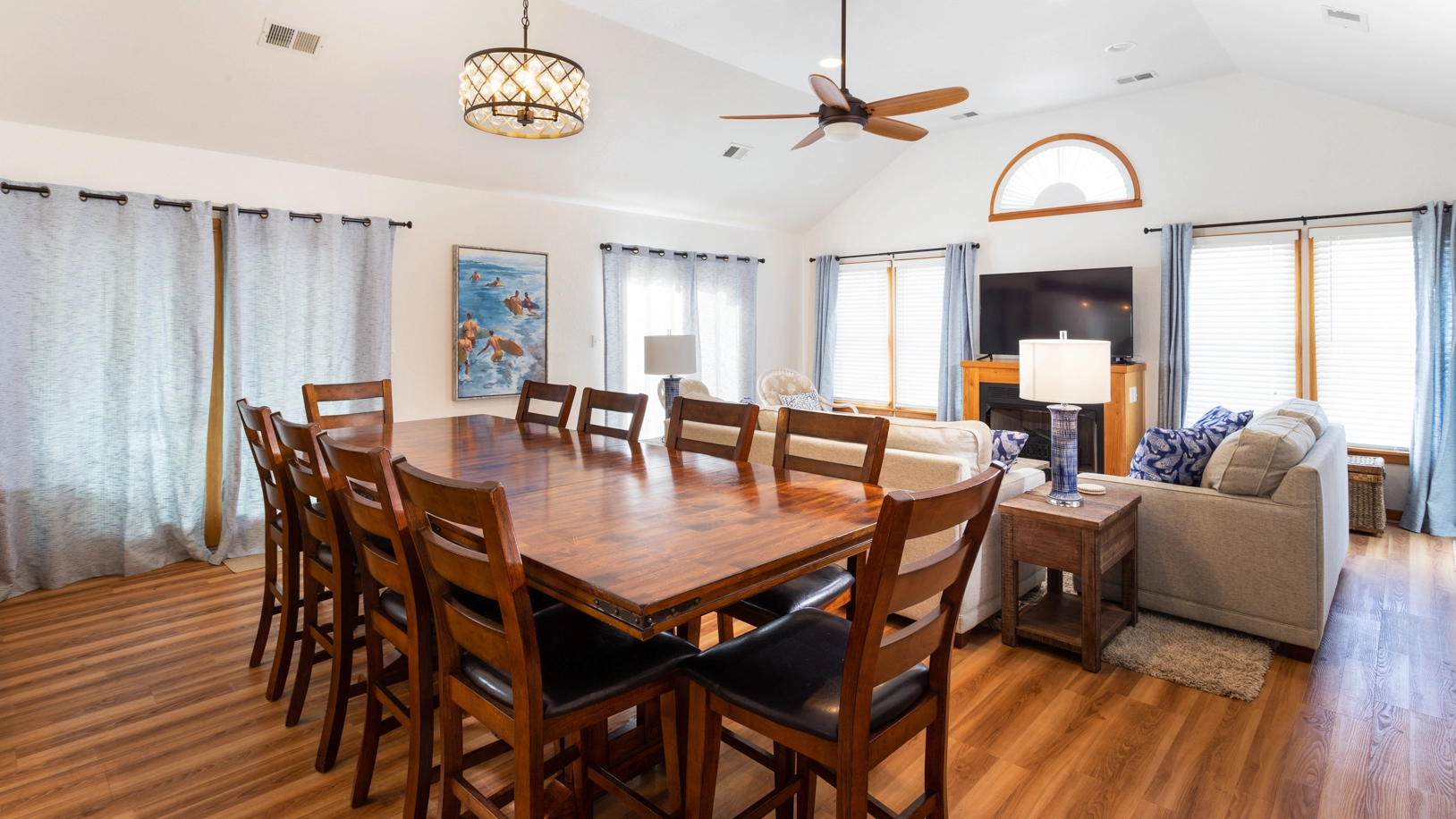 "This home was beautiful, comfortable, clean. The furniture was very comfy and the home's kitchen was very well stocked, even a Keurig! The sunroom doubled as a toy room for my grandsons and with the TV they were able to be occupied in the morning without disturbing adults who were sleeping in (they were up every morning by 6.) The pool was wonderful and warm. The hot tub was large and comfortable. The porch swing, delightful. TV's in every room which made my TV addicted family very happy. The dining room table was large enough for all 12 of us. The home is perfection. The only thing missing is a broom to better pick up the sand from the short walk, bike ride, or golf cart to the beach! We LOVED it! Thanks for sharing your home."