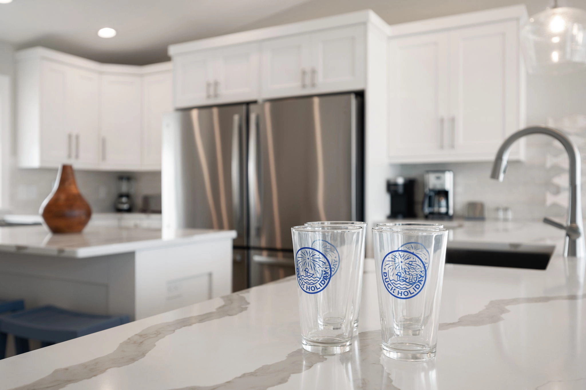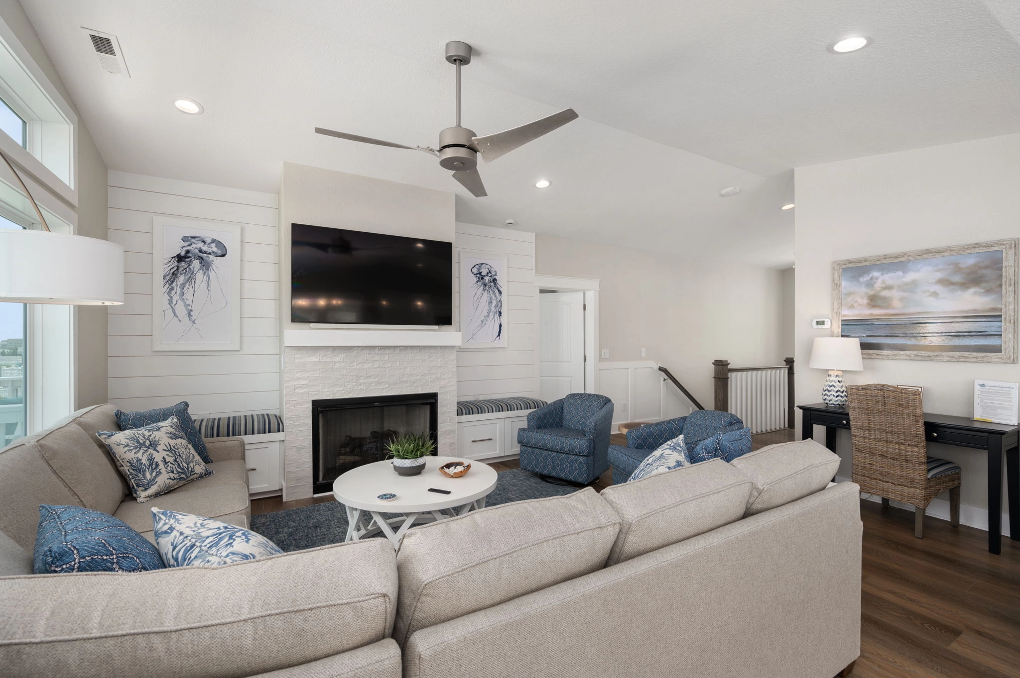 Great room with gas fireplace; kitchen with gas stove, two refrigerators, and two dishwashers; dining area.