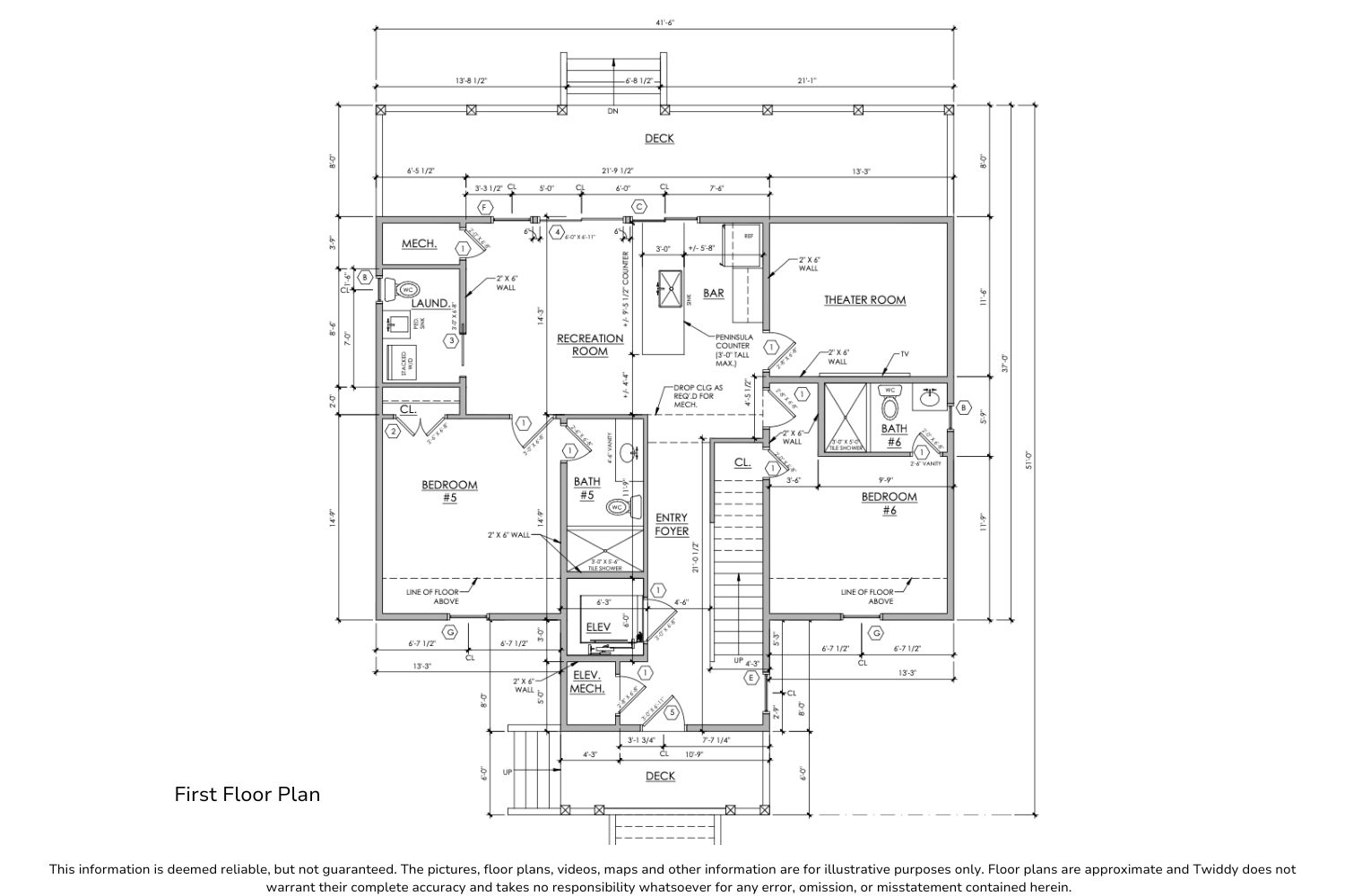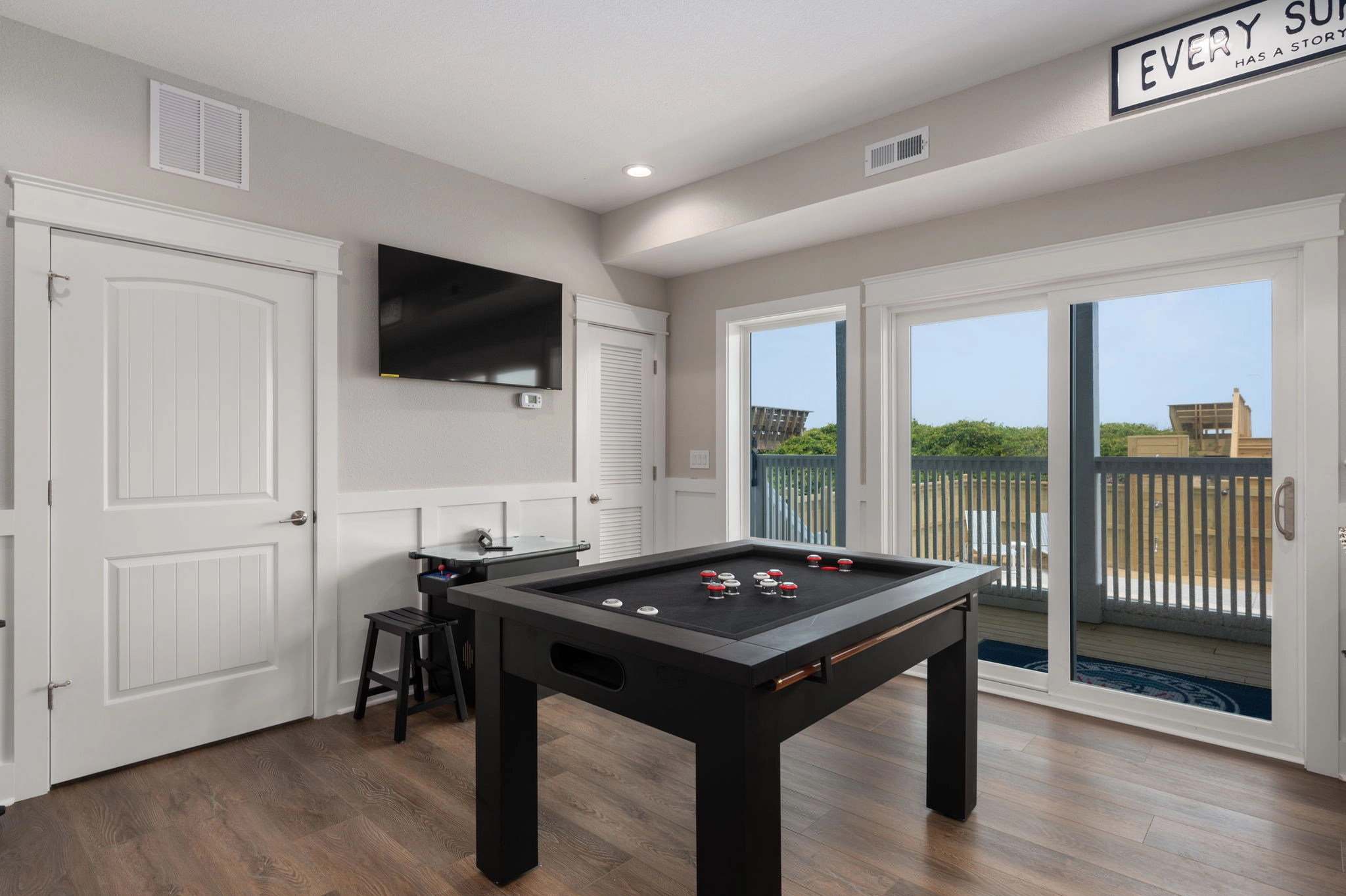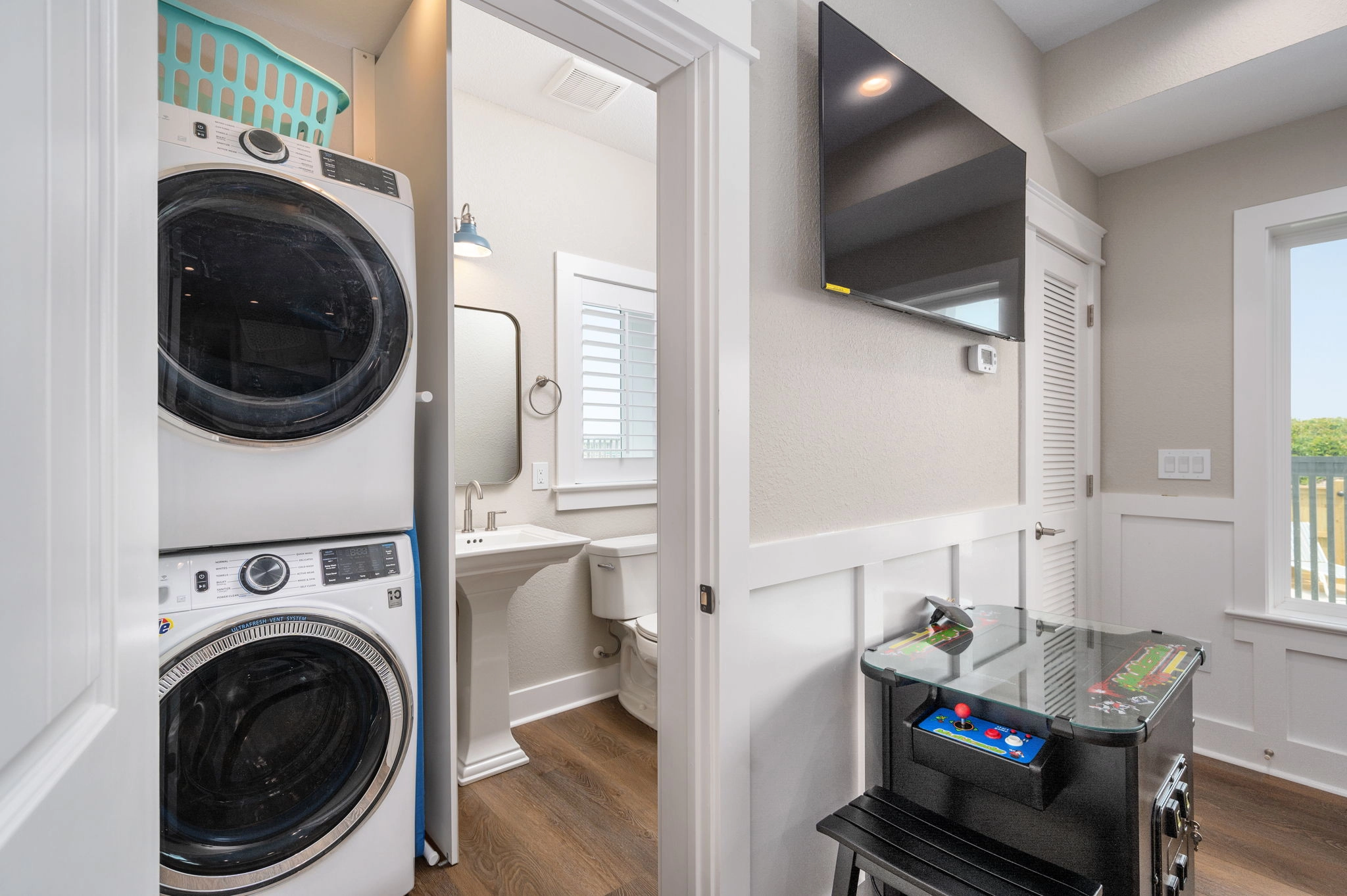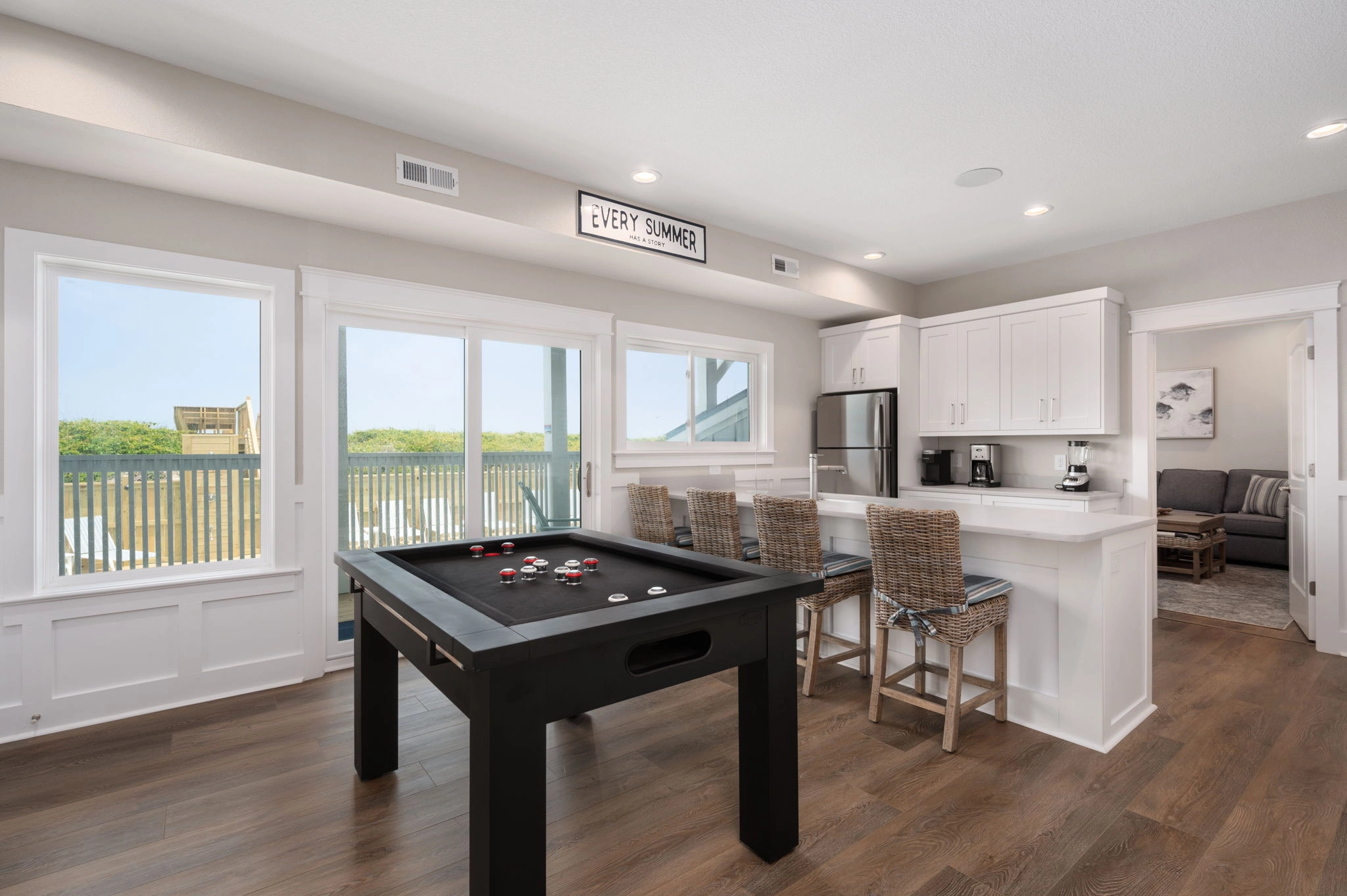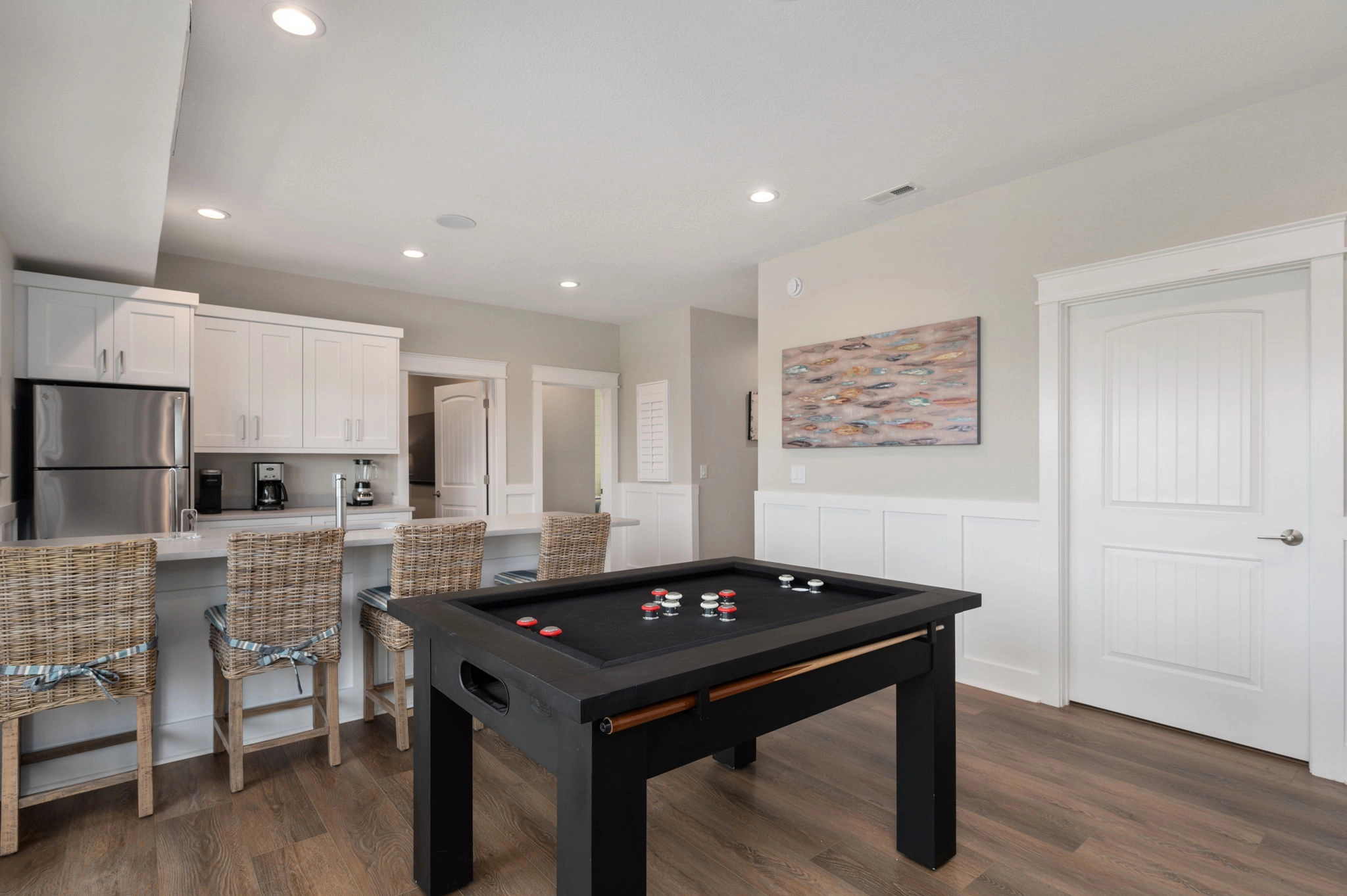 Rec room with bumper pool table and arcade game, and wet bar with refrigerator; media room; laundry.