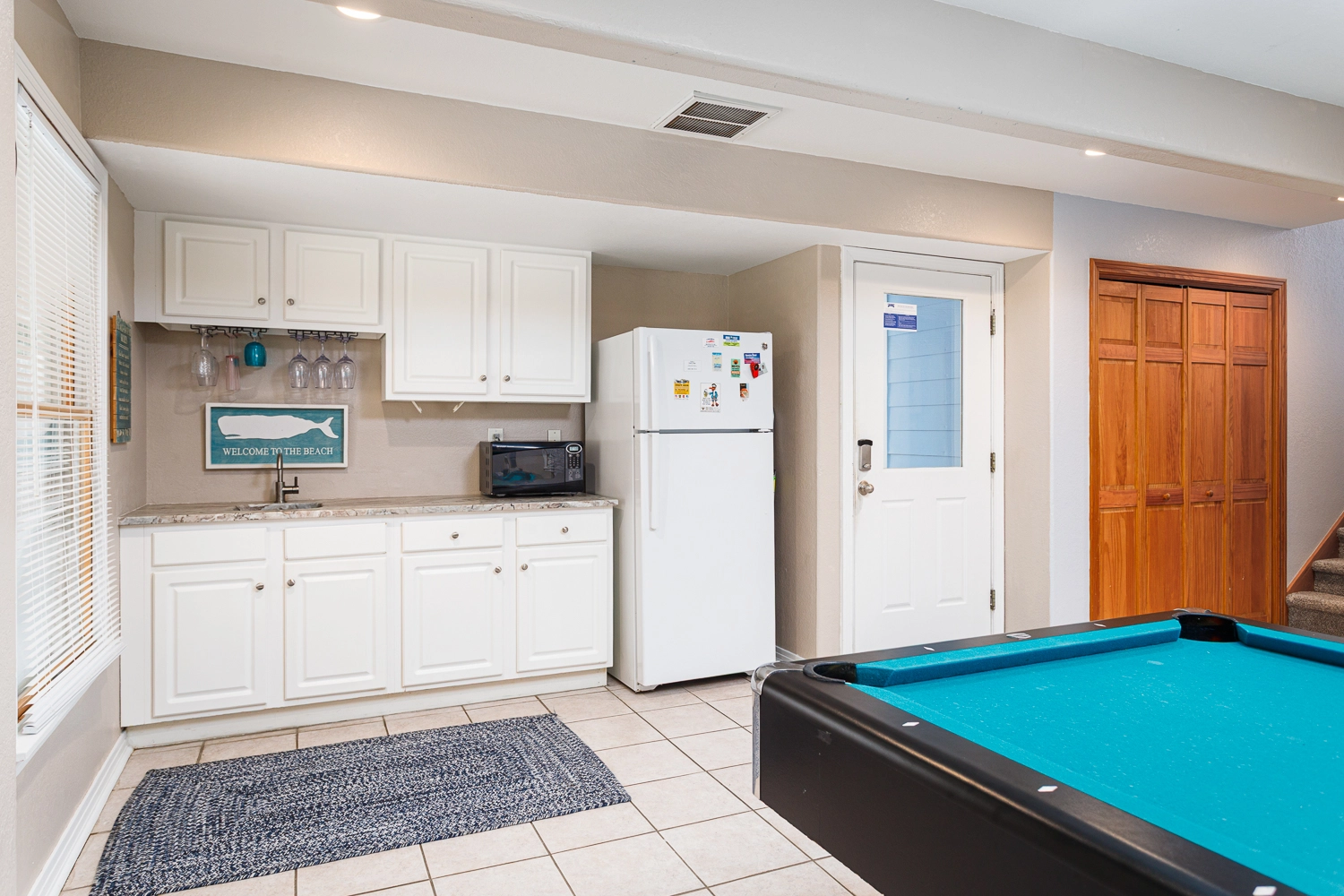 Rec room with pool table, kitchenette with refrigerator and microwave.