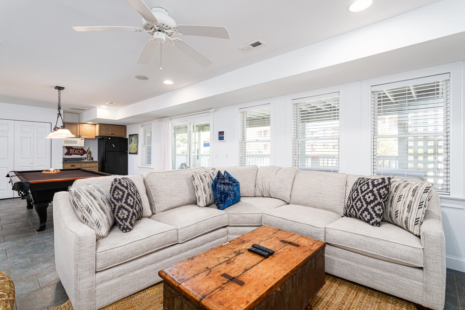 "Lots of space and sitting areas for a large family to spread-out. Family room couches VERY comfortable and loved that there were multiple decks to sit outside. A couple decks are covered, which was nice because we had a lot of rain during our stay. Paved path to beach is nice, but, just know that it’s a NARROW beach. Probably gets pretty crowded when season is in full swing. Really liked that each bedroom had its own bathroom. Only complaint from our 10 year old was that the bunk bed mattress (especially the top one) was extremely uncomfortable. He ended up sleeping on the couch in the den."