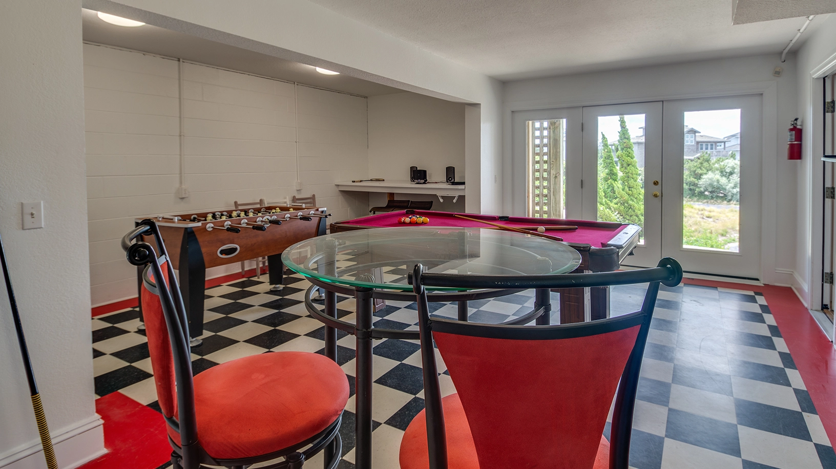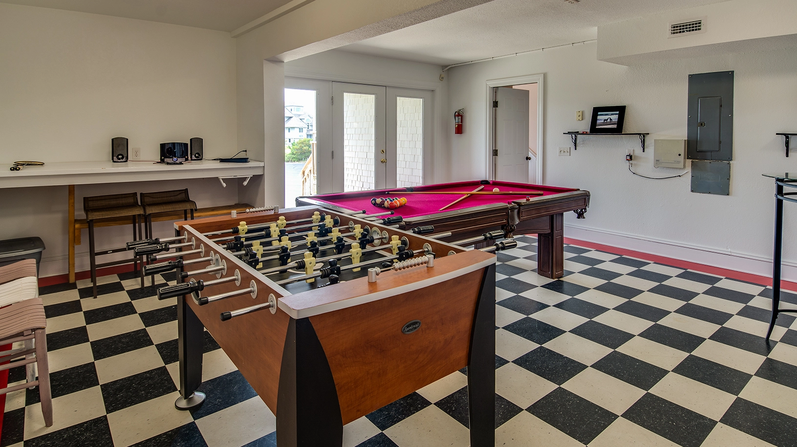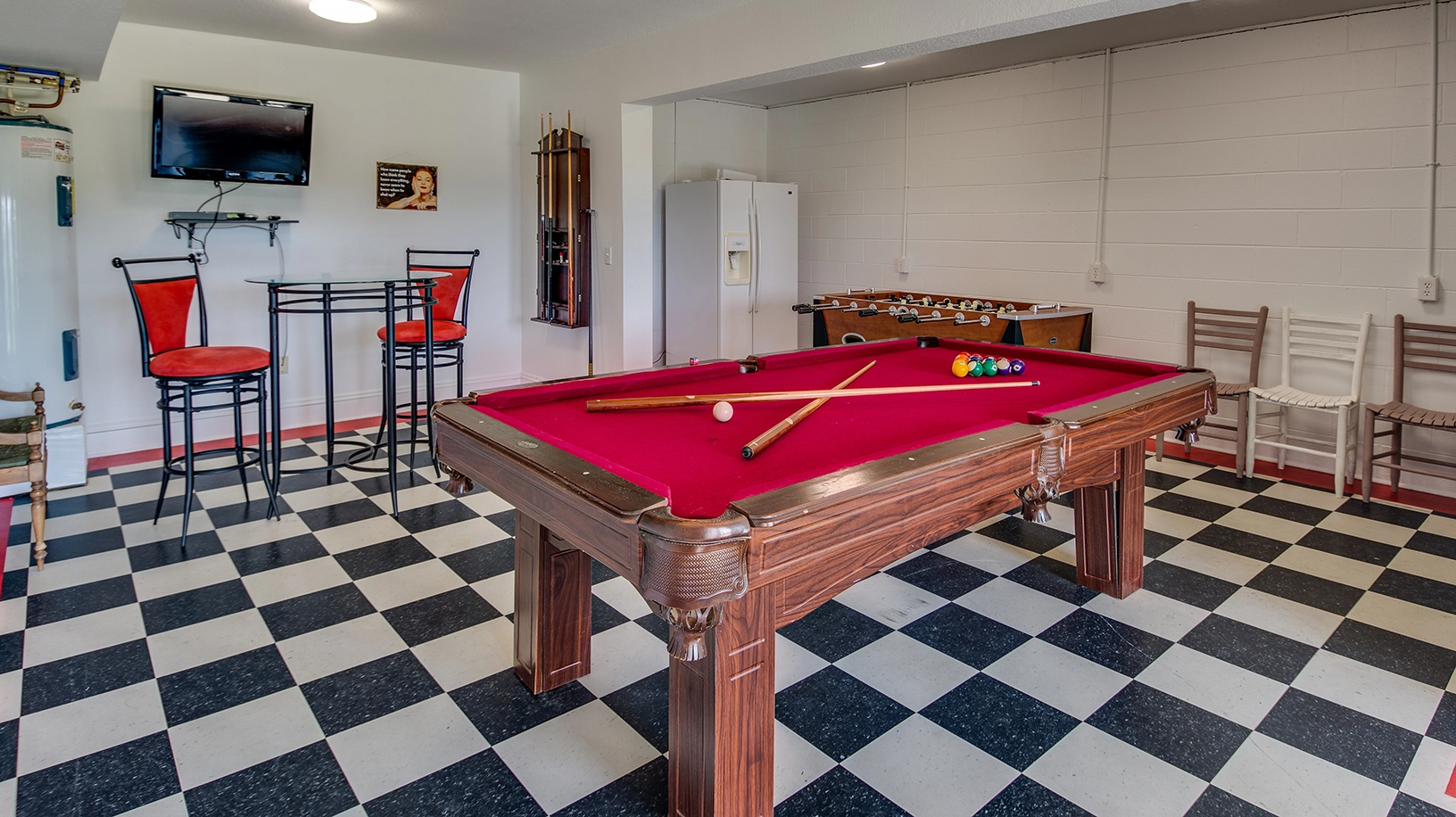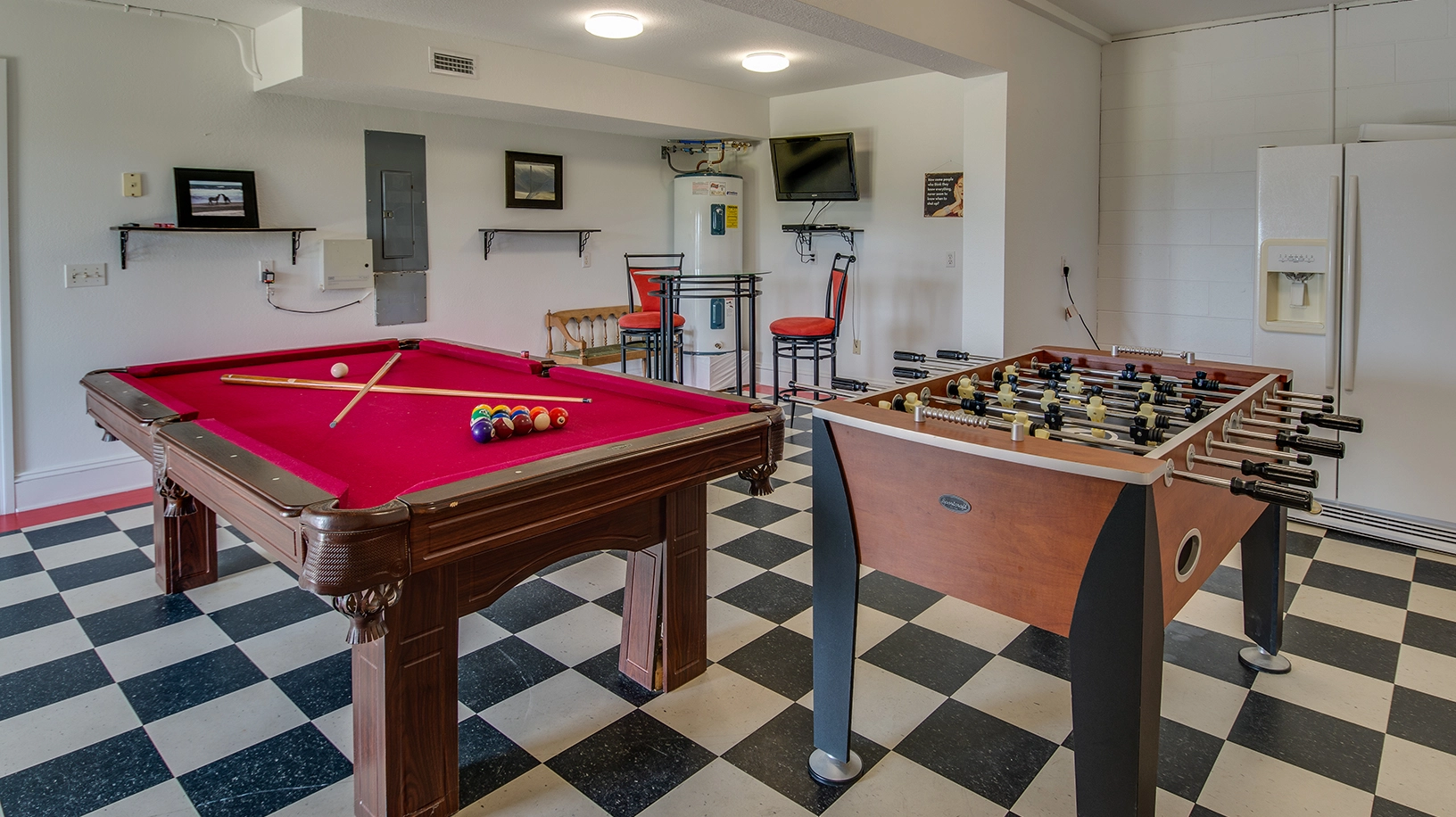 Hot tub, two refrigerators, multiple TVs/DVDs, pool table, foosball table, elliptical machine.