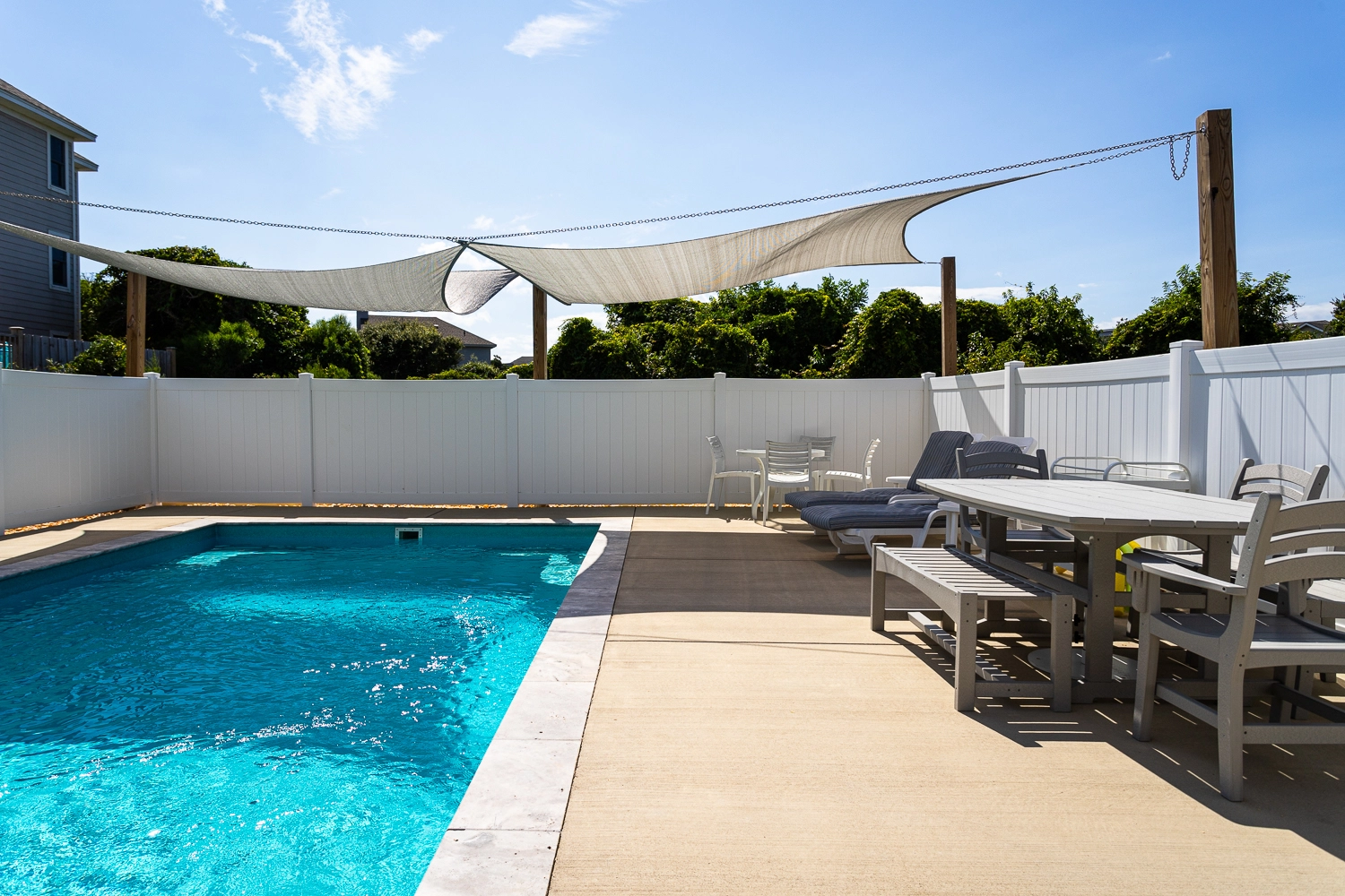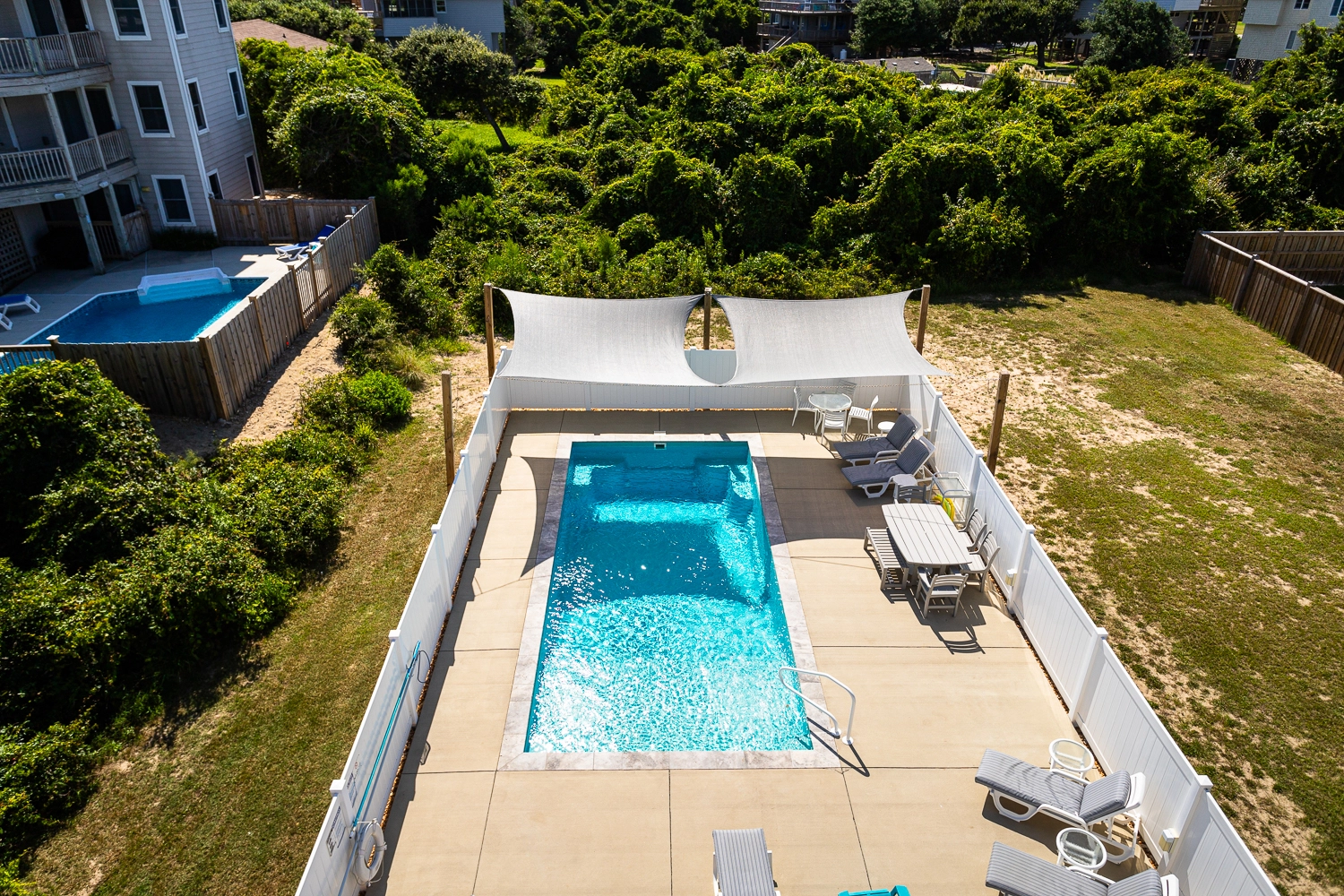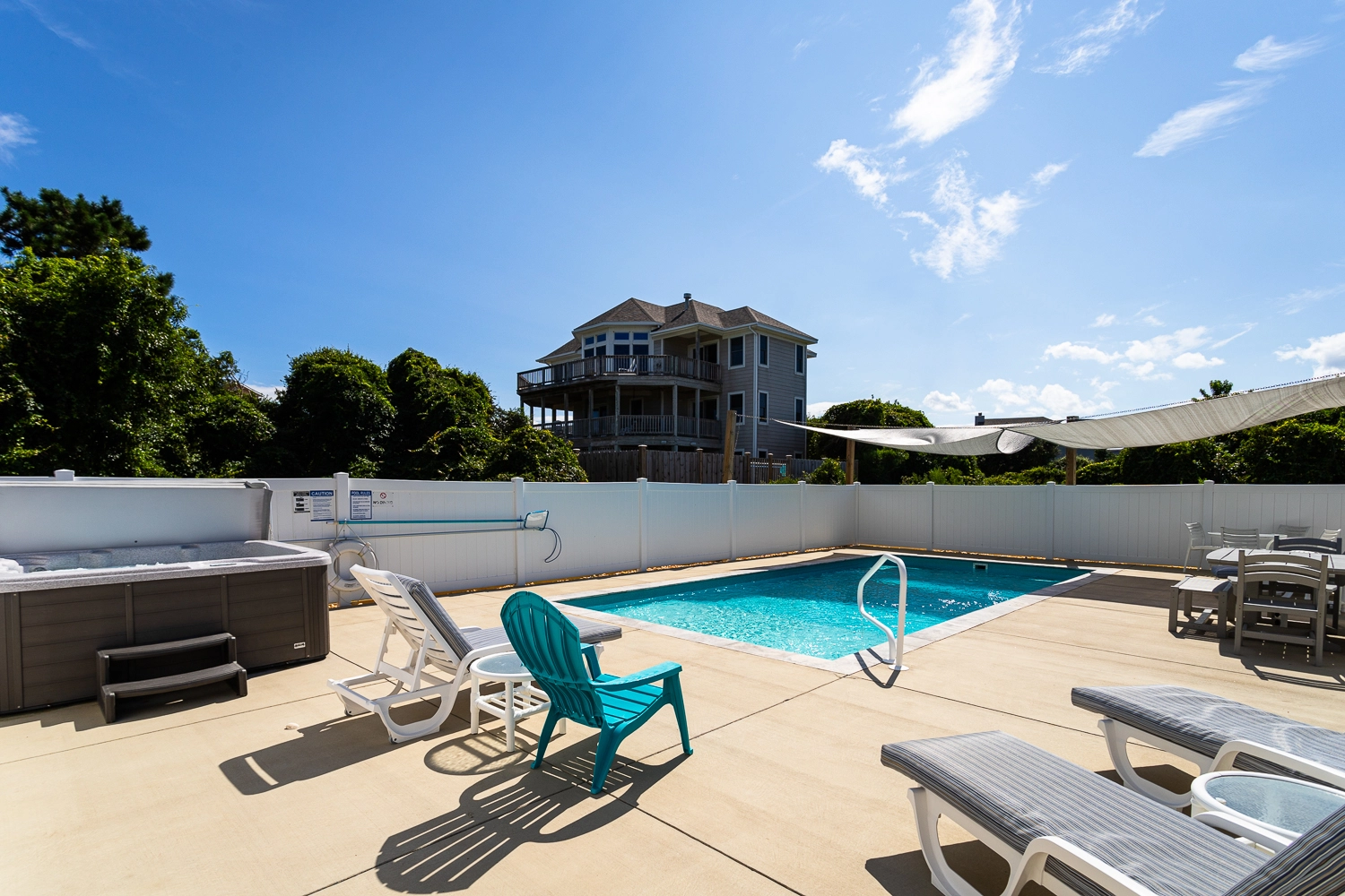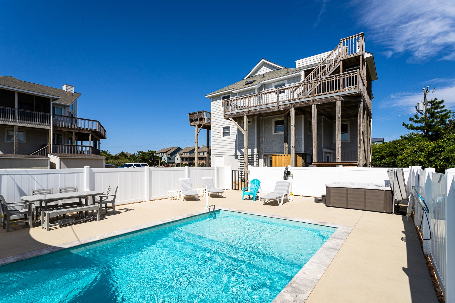 "Great house with wonderful kitchen and family room space, lots of decks on every level and we especially loved the top deck for coffee in the am and looking at stars at night. The pool was excellent! Clean, refreshing and just right for two families with a few kids. Out door shower was so nice. The ocean right across the street and everything in Duck just minutes away. We loved the Safari Tour to see the wild horses up north. Saw dolphins and pelicans and many birds. Thank you to the owners! Oh, and the ice maker in the kitchen was awesome - used it all the time!"