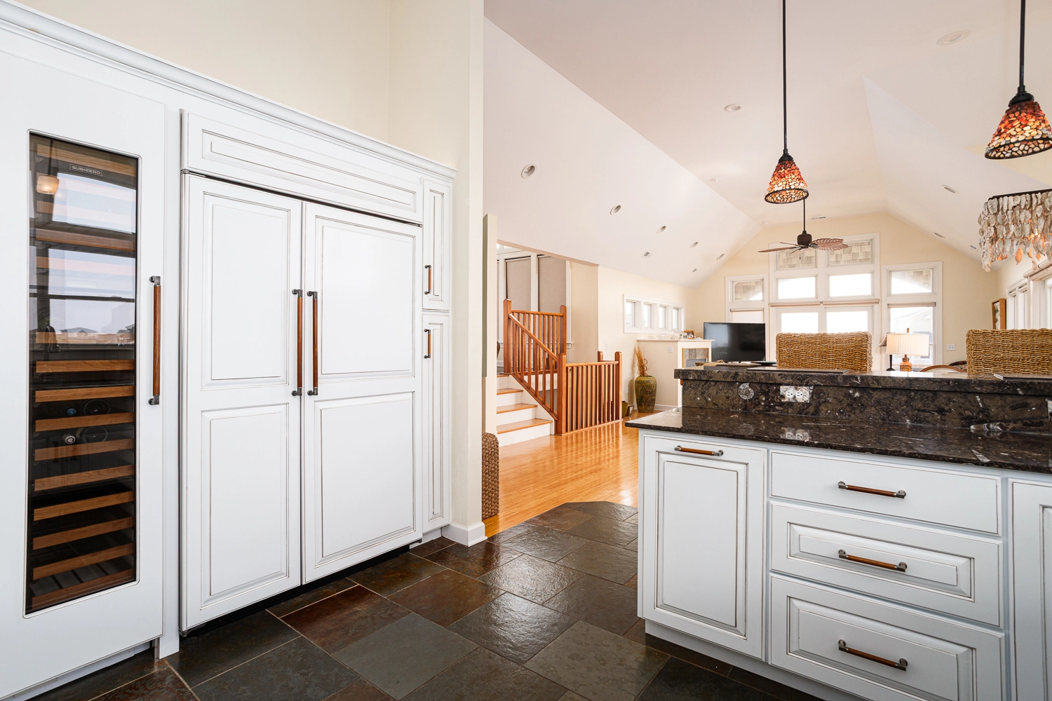 Great room; kitchen with Sub-Zero refrigerator and wine cooler; dining area.