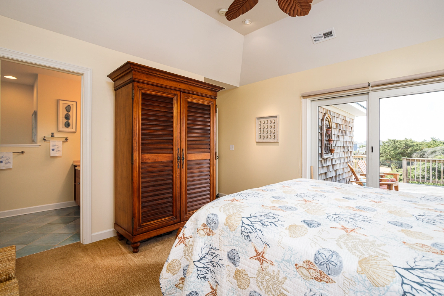 Queen, Standing shower, Soaking tub, Deck access