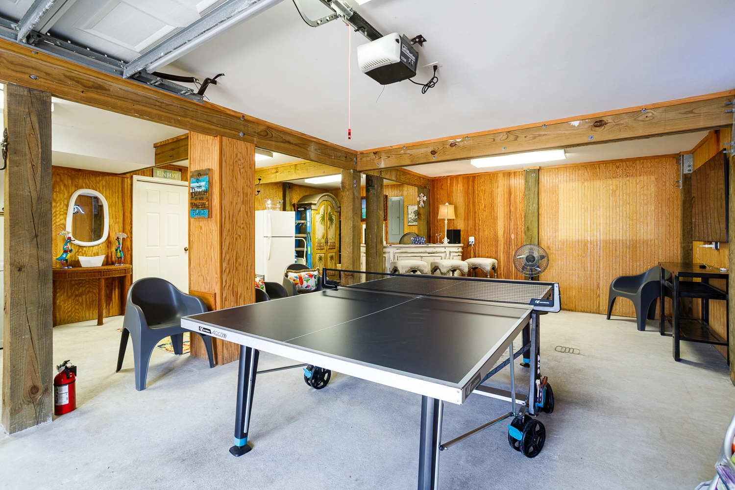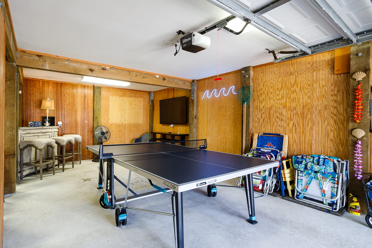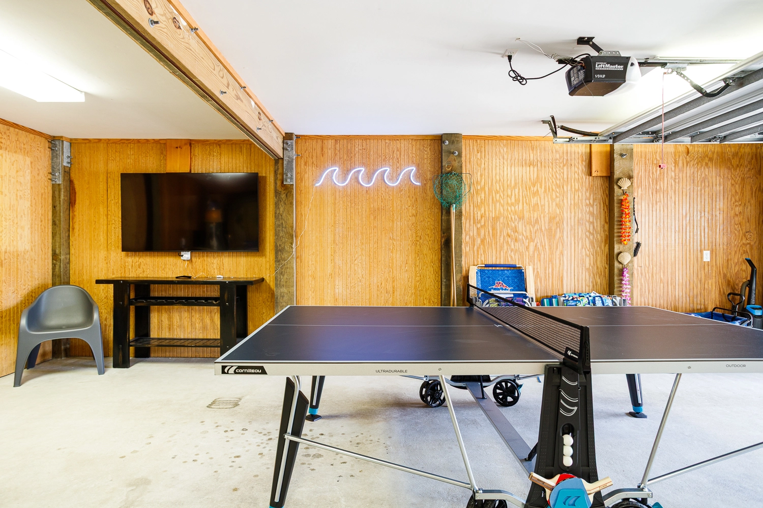 Rec room with multicade arcade game; garage rec room with ping pong.