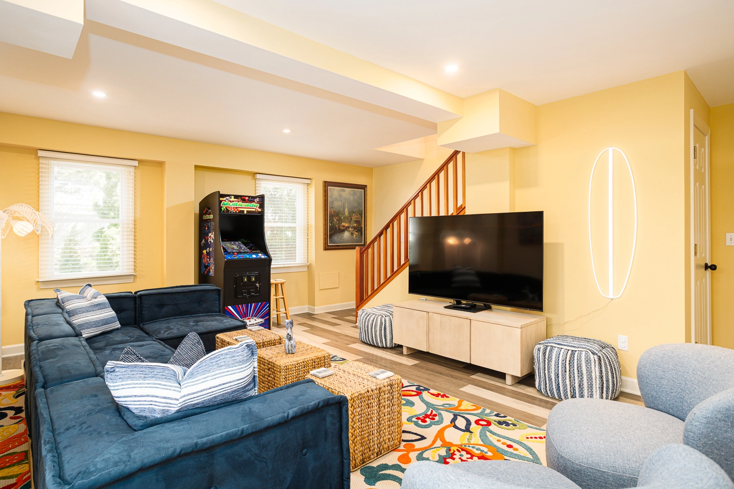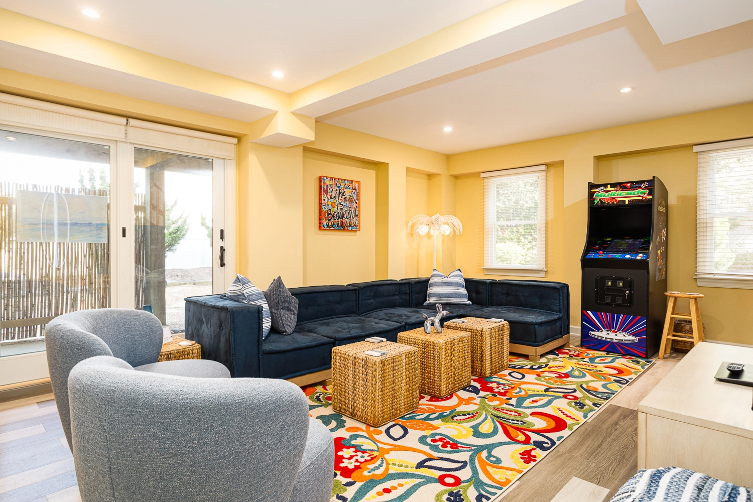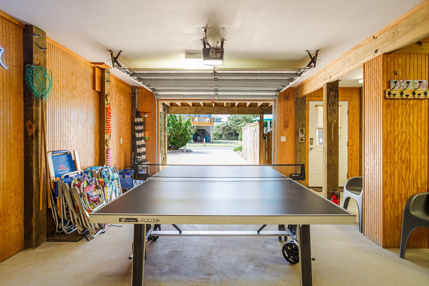 Rec room with multicade arcade game; garage rec room with ping pong.