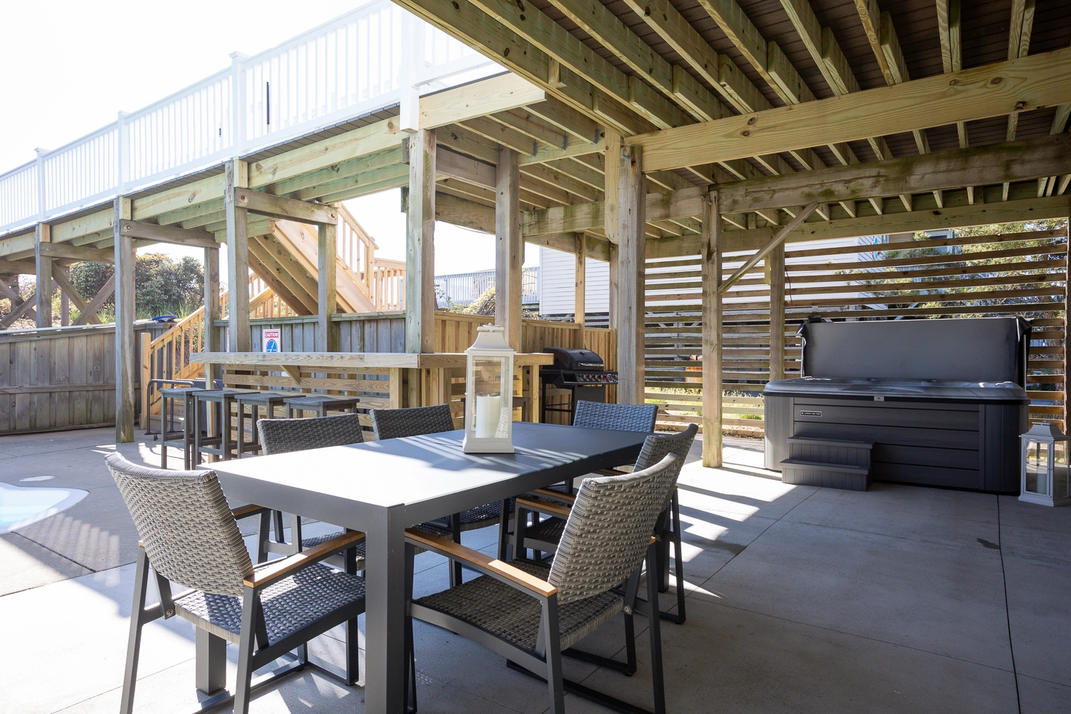 "The deck area was amazing. Great room was lovely. Location, amazing. Bathrooms, all nice. Gated and safe for dogs outside was exceptional - we have stayed in a lot of houses in OBX and especially Duck and none have this. Kitchen good too. Loved the modern looks. Also Wi-Fi and TVs worked perfect. That never happens. Grassy area for dogs was fantastic addition."