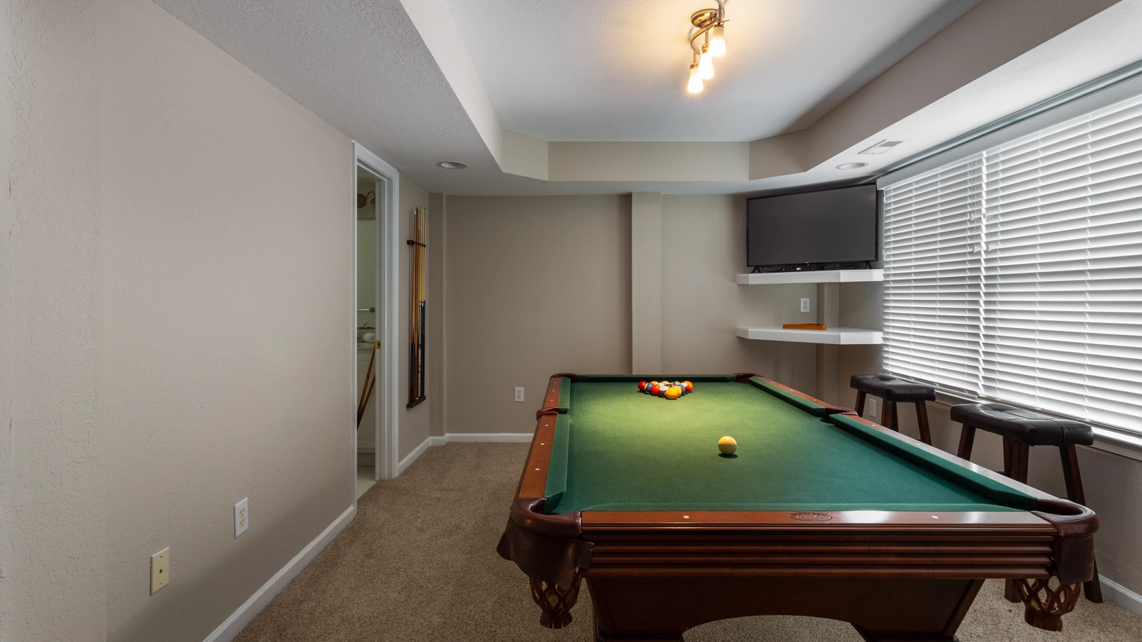 Rec room with pool table, wet bar, and refrigerator; laundry.