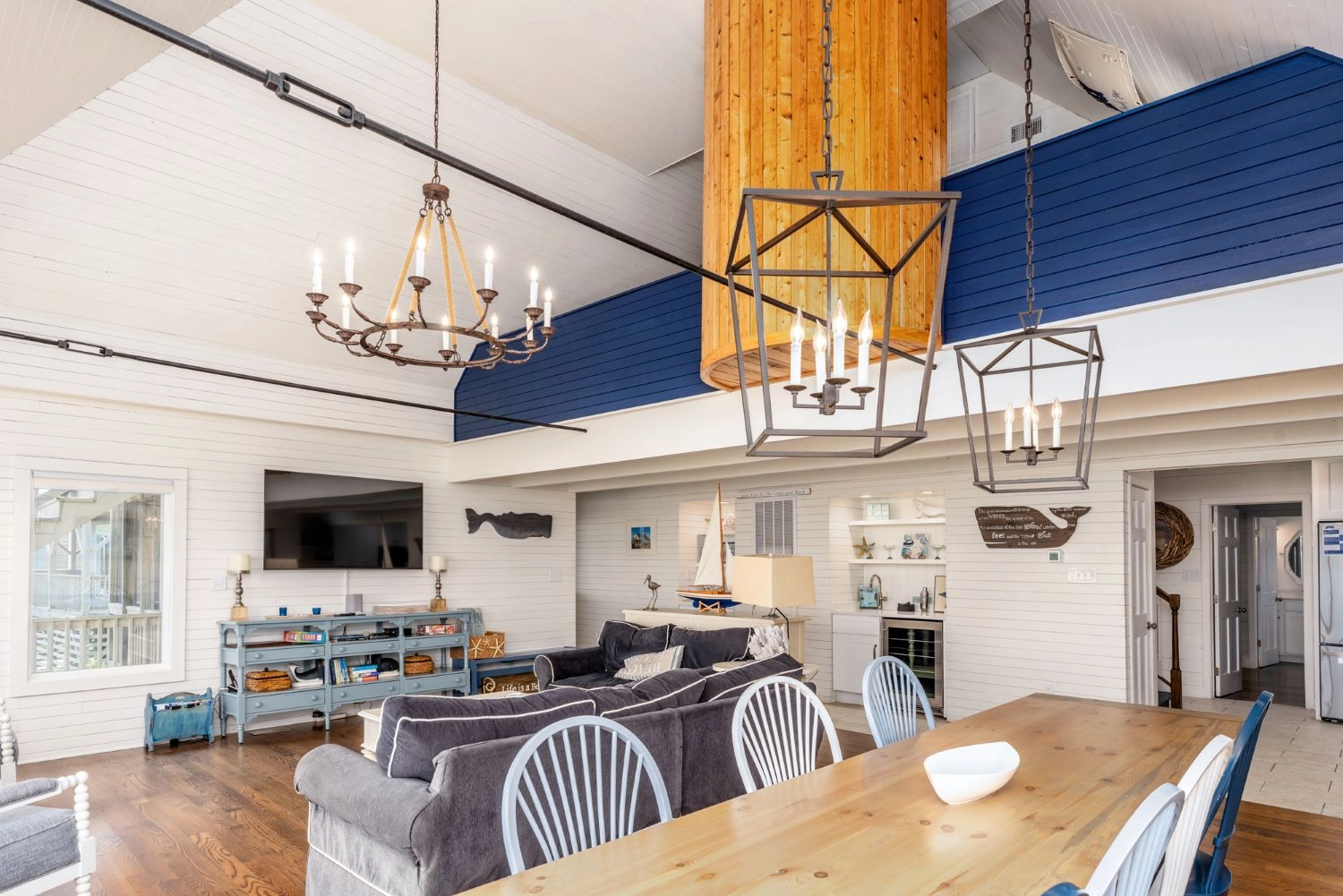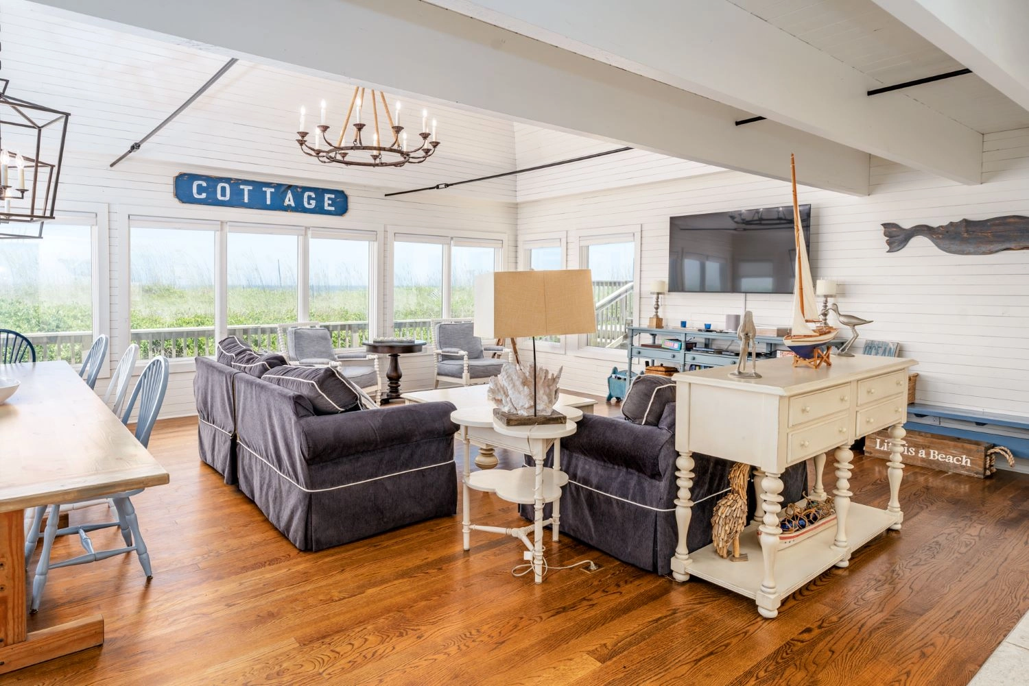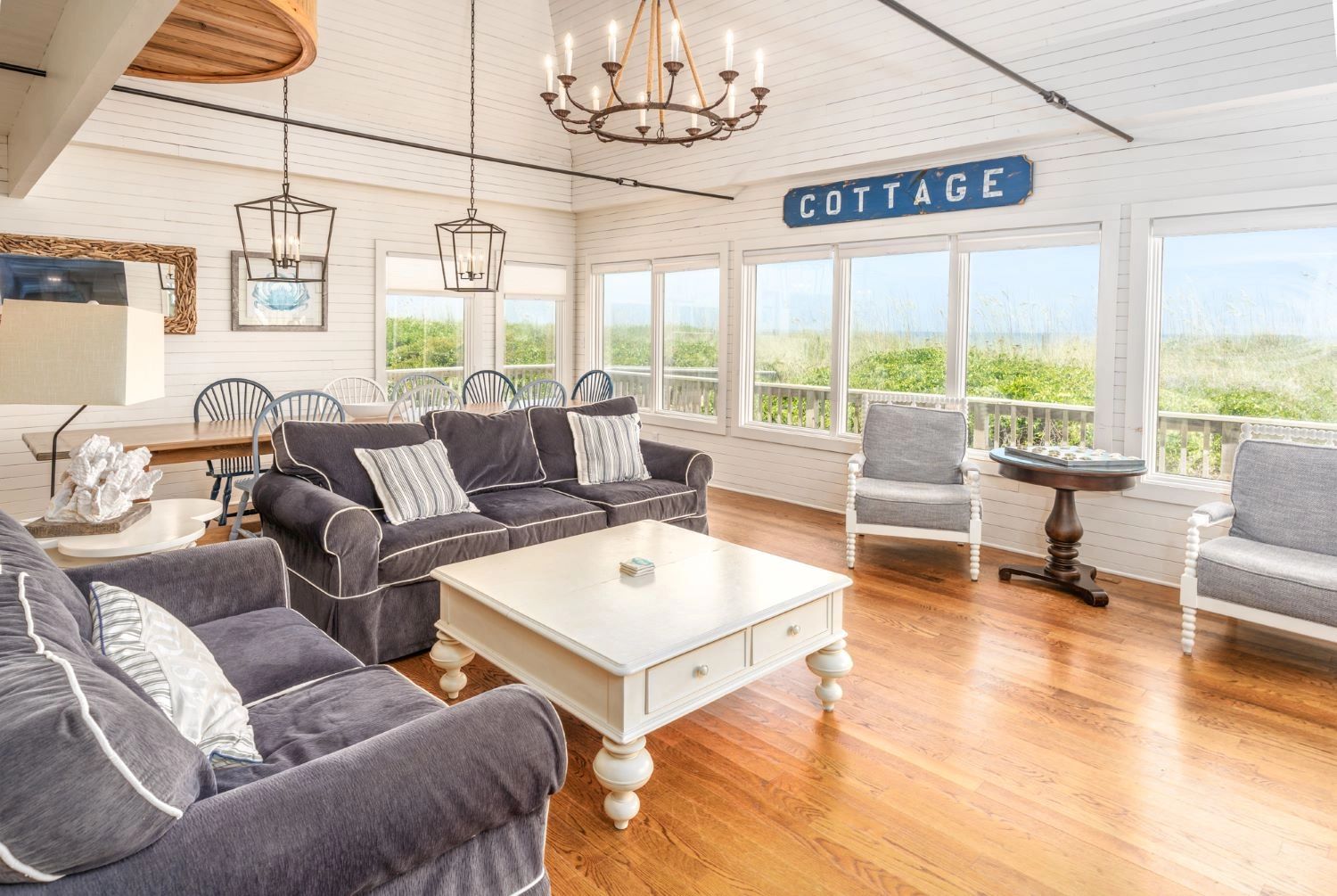 Great room; kitchen; dining room; screened porch; outdoor shower.
