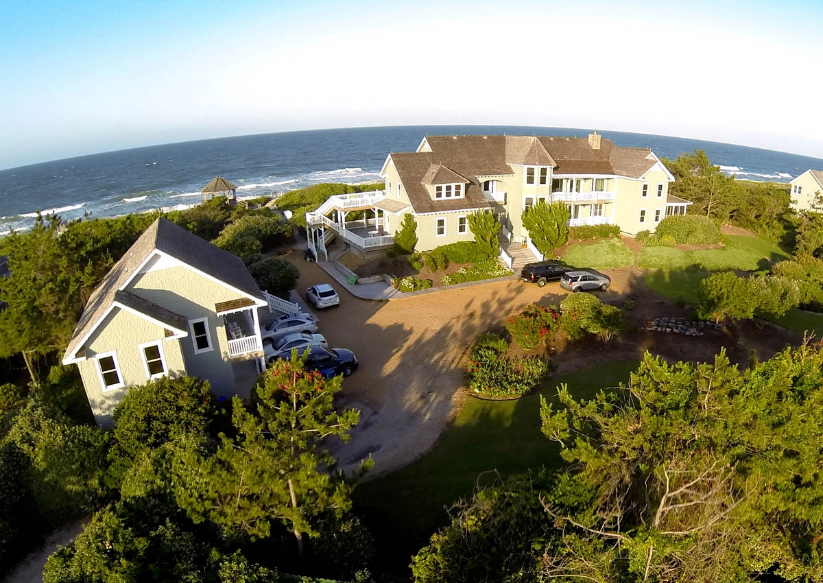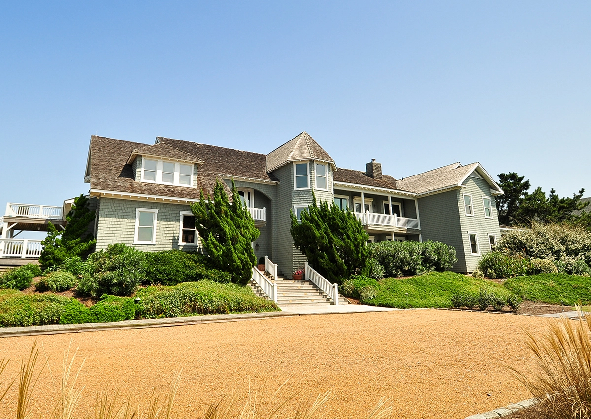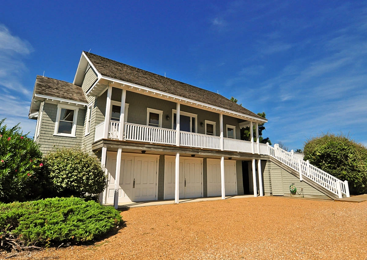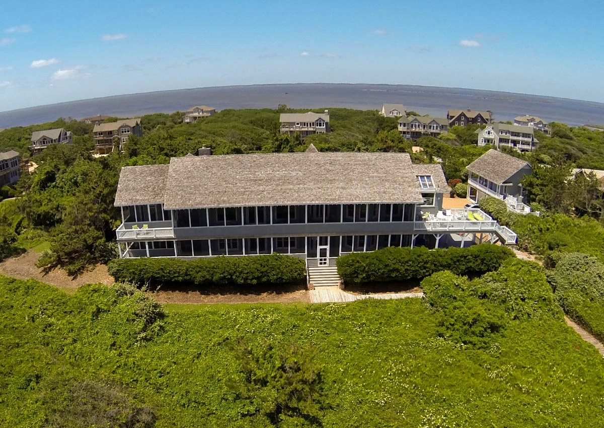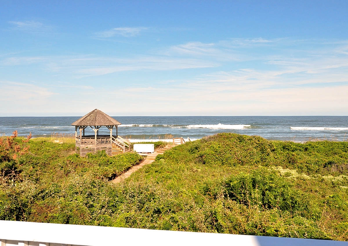 Great room that opens onto covered decks facing the ocean and westward to decks with views of the sound; large well-equipped kitchen with two dishwashers, a gas range and two refrigerators; the dining area seats 12 and has a bay window that brings in light and beautiful ocean vistas; to the west, an oversized glass door opens to a balcony overlooking the garden and Currituck sound.
