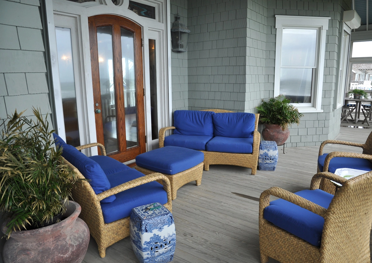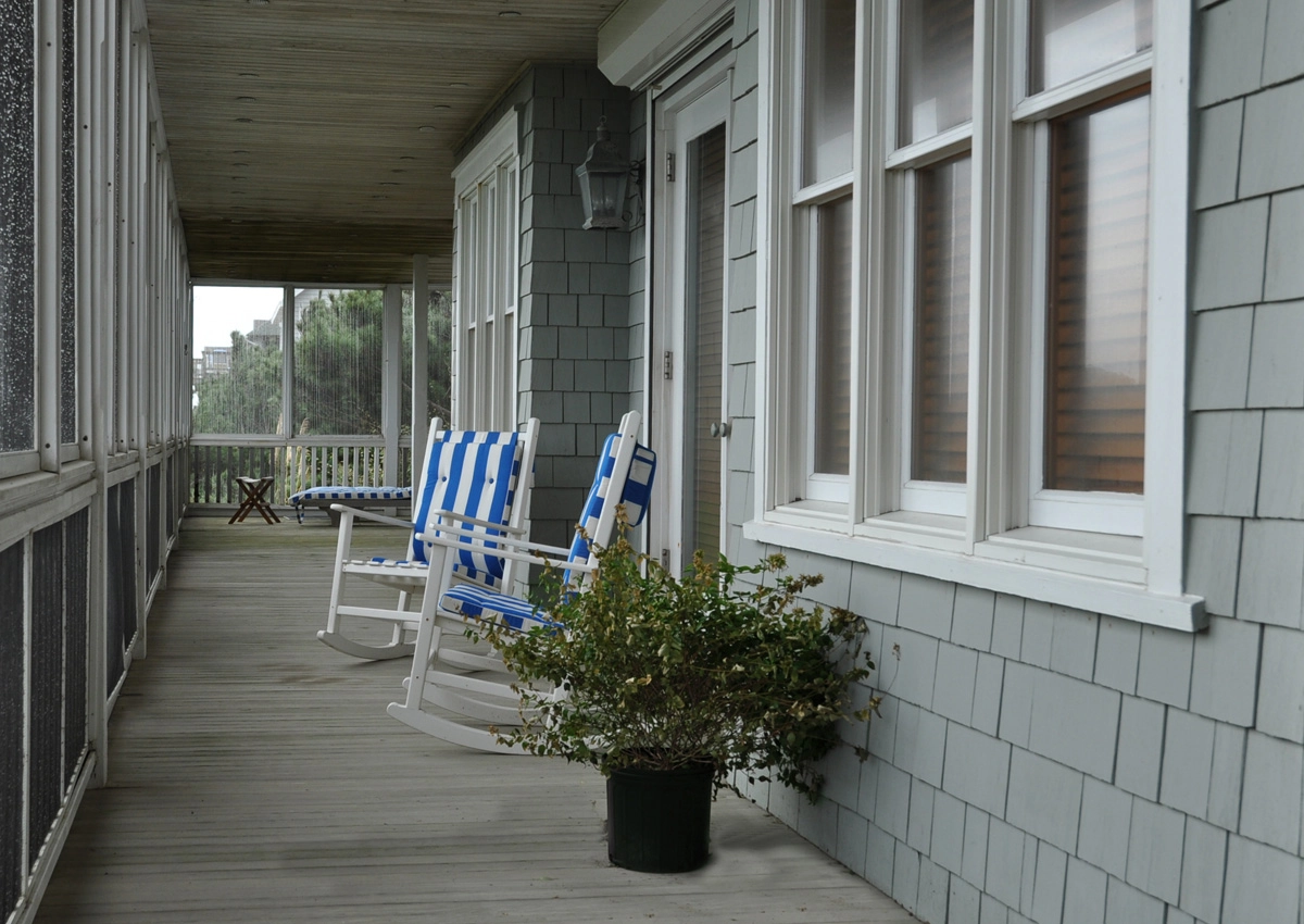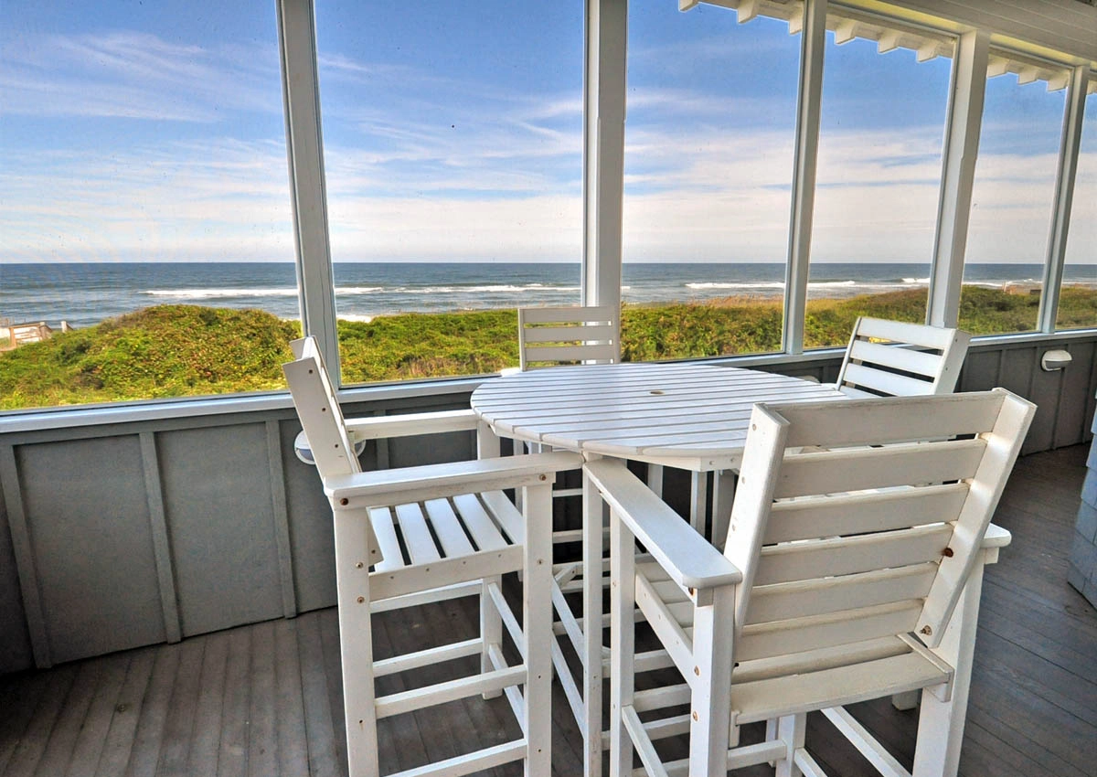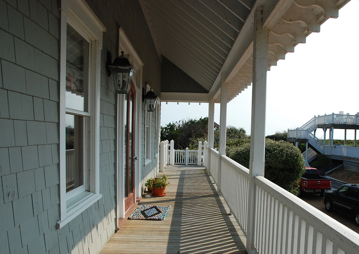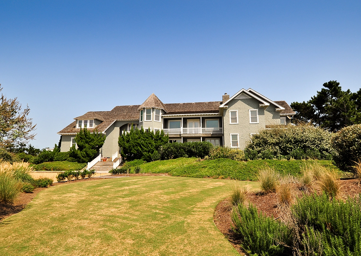 Great room that opens onto covered decks facing the ocean and westward to decks with views of the sound; large well-equipped kitchen with two dishwashers, a gas range and two refrigerators; the dining area seats 12 and has a bay window that brings in light and beautiful ocean vistas; to the west, an oversized glass door opens to a balcony overlooking the garden and Currituck sound.