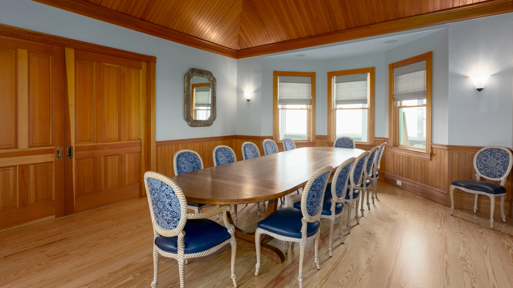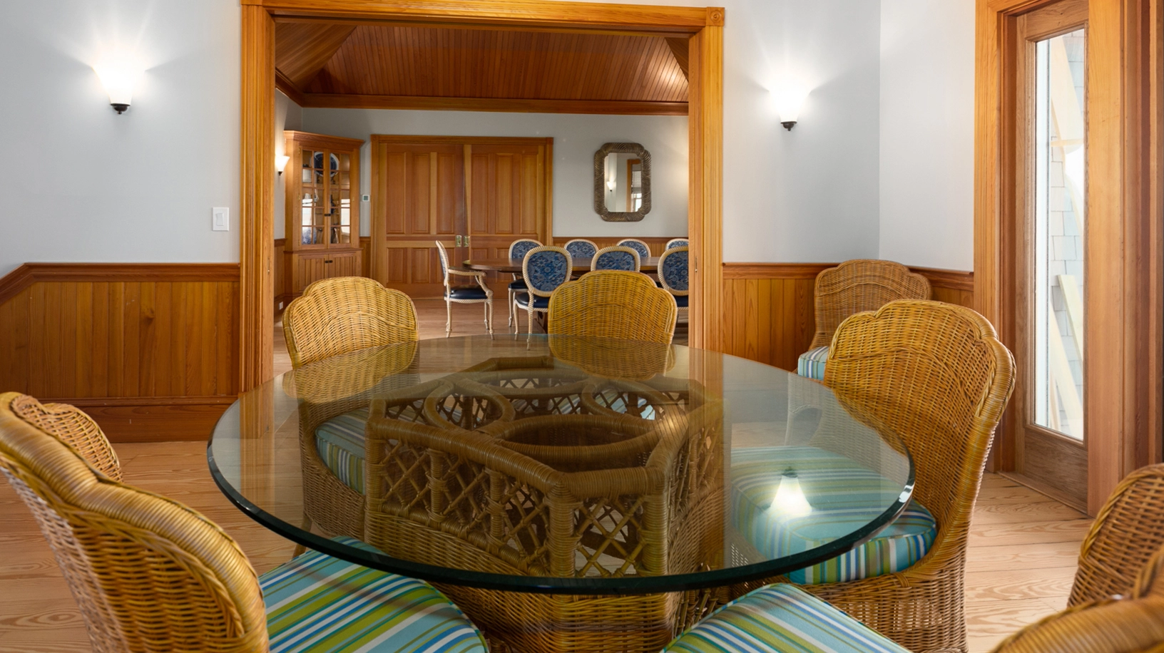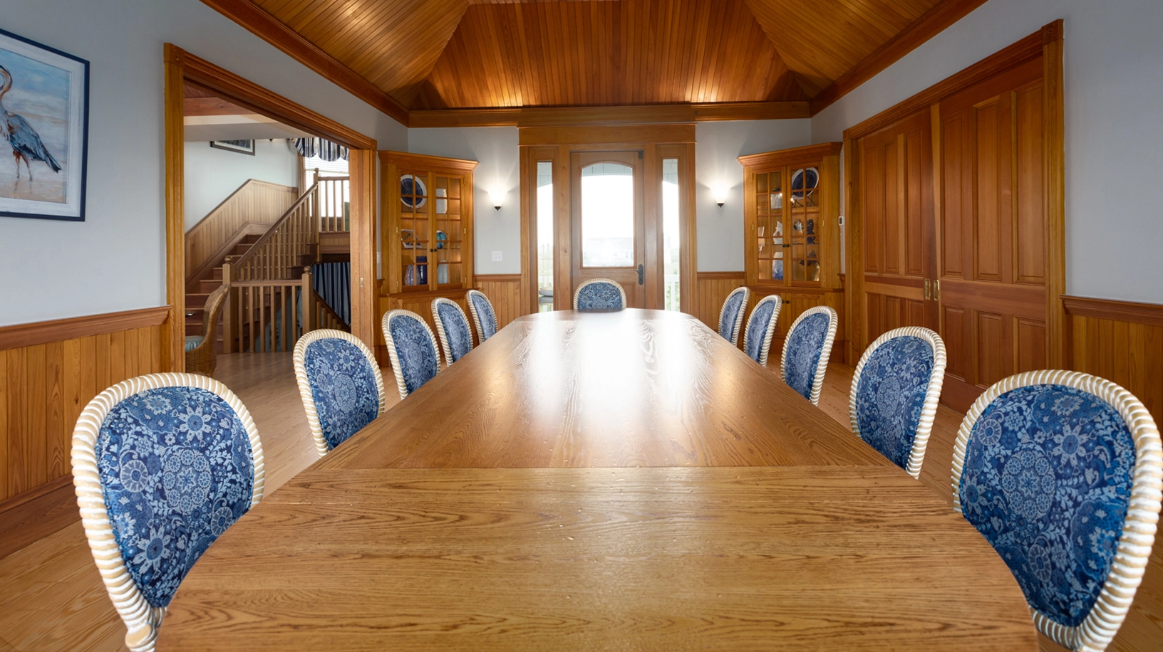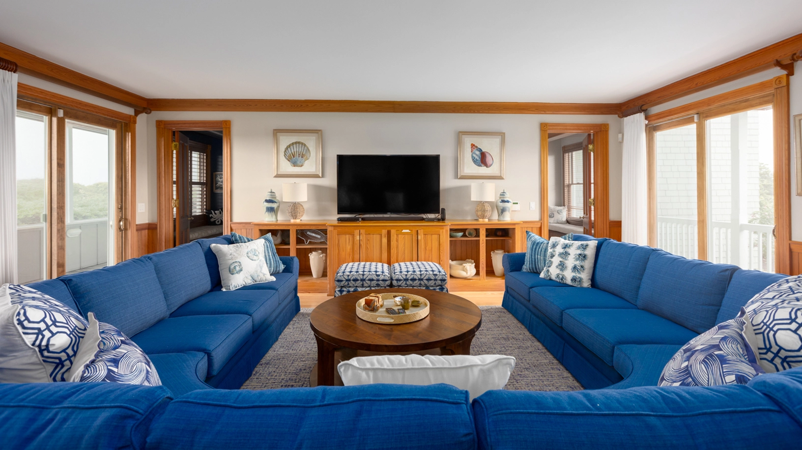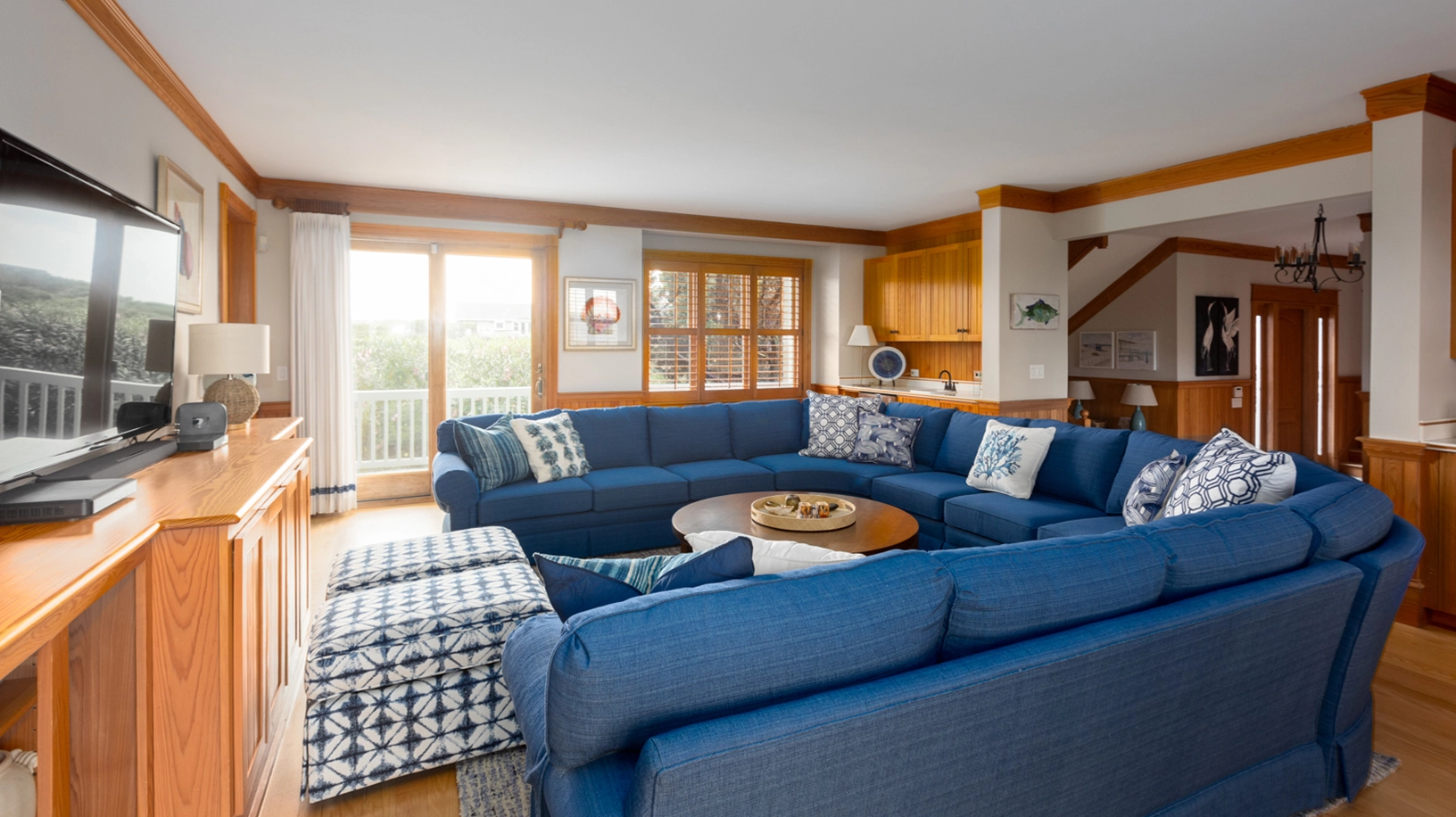 Great room that opens onto covered decks facing the ocean and westward to decks with views of the sound; large well-equipped kitchen with two dishwashers, a gas range and two refrigerators; the dining area seats 12 and has a bay window that brings in light and beautiful ocean vistas; to the west, an oversized glass door opens to a balcony overlooking the garden and Currituck sound.