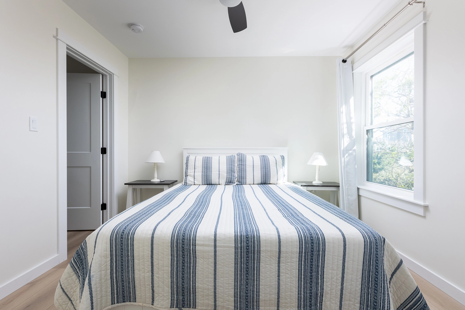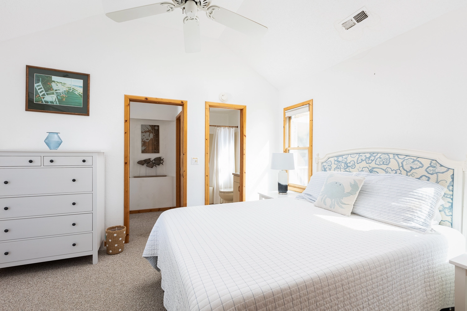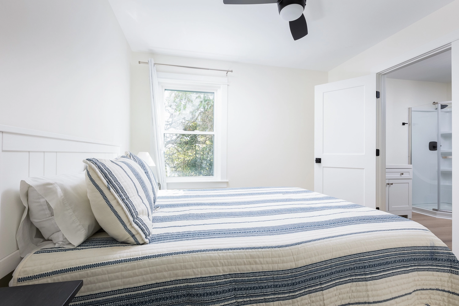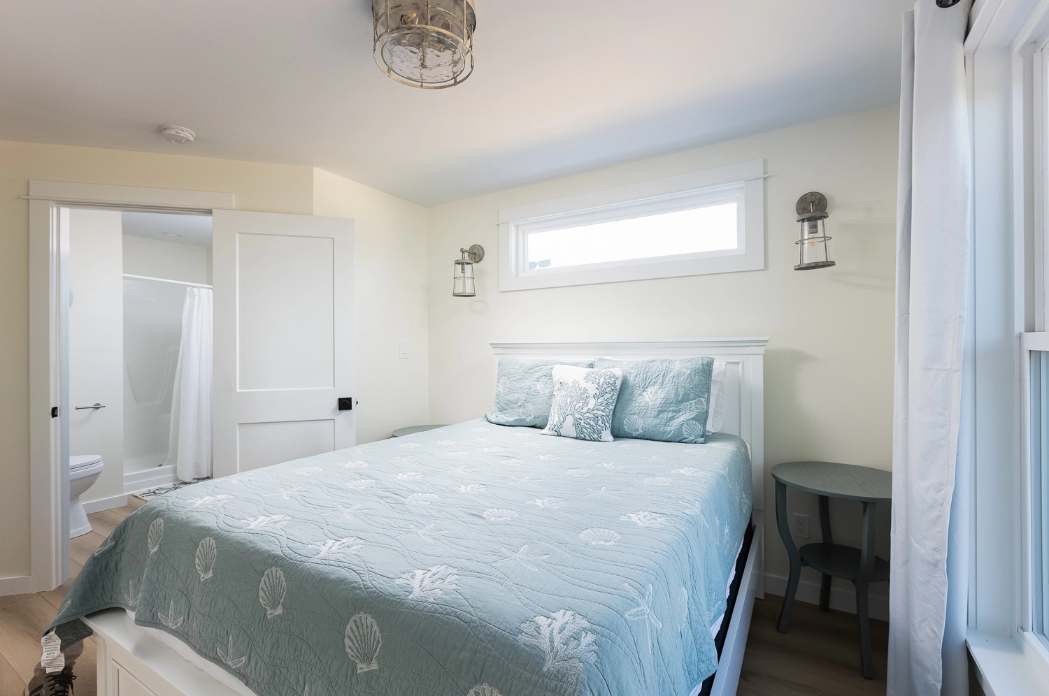 Queen, Semi-private bath, Shower/tub combo, Deck access