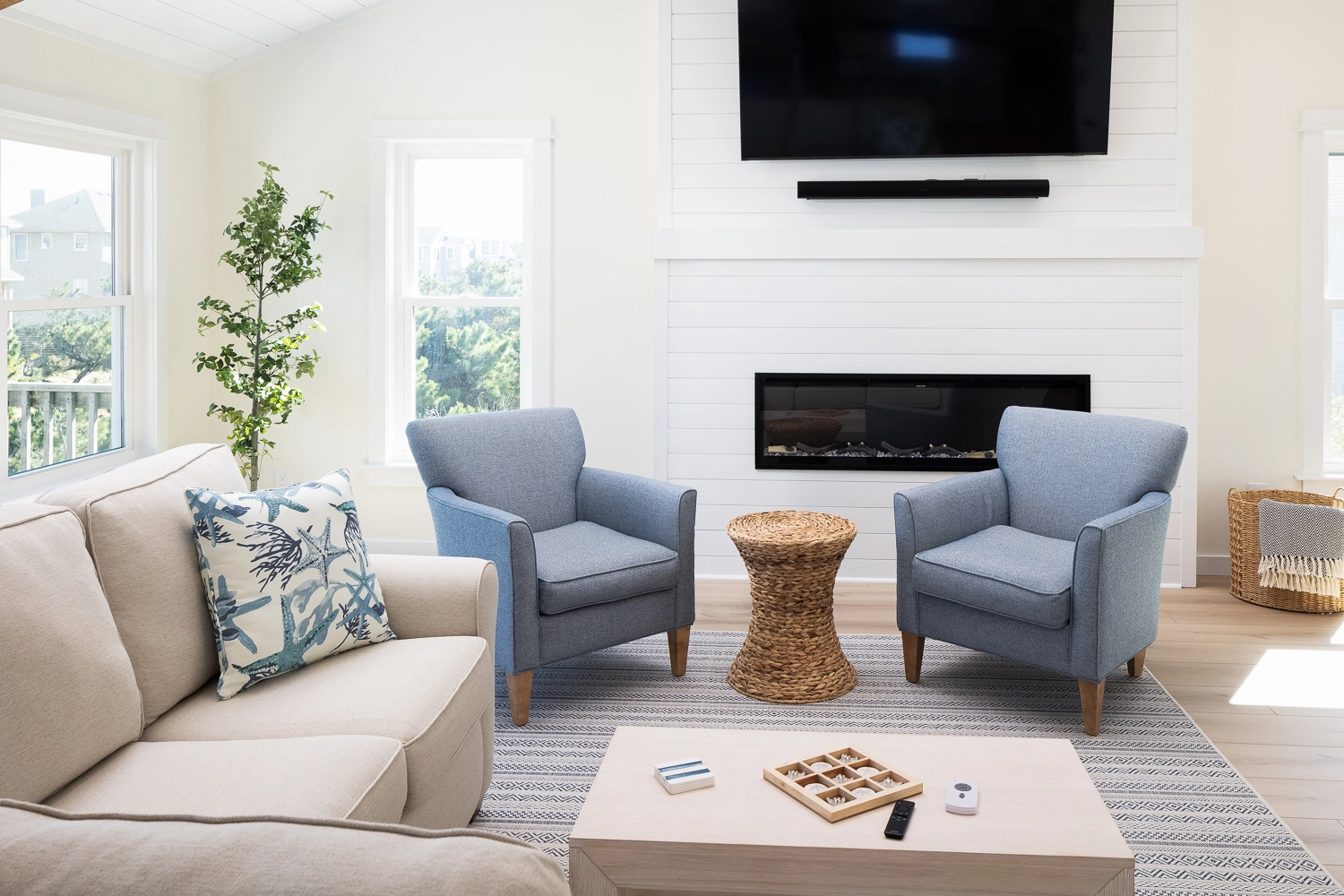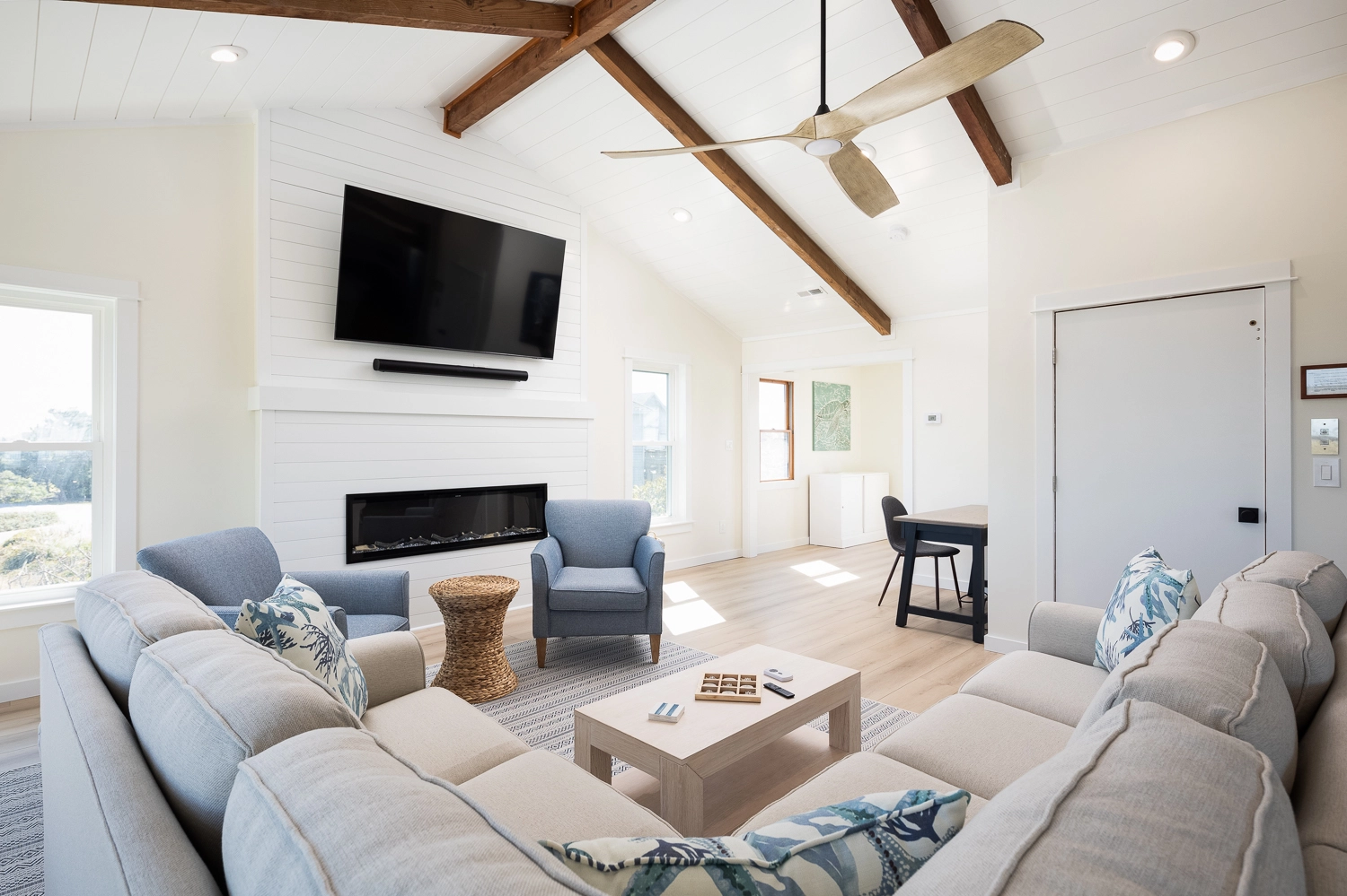 Great room with electric fireplace; kitchen with two ovens; dining area; sun room.