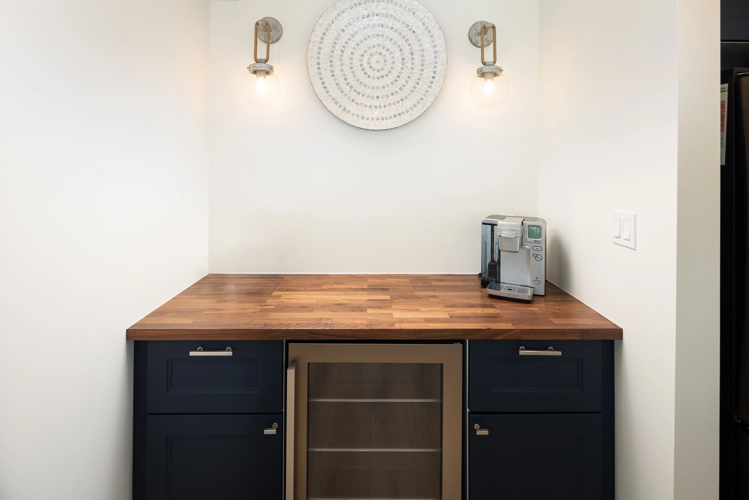 Sitting area with wet bar and beverage refrigerator.